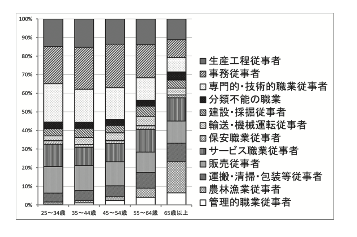 論文NIRAモノグラフシリーズNo.40 2016.08.01 職業特性と高齢者特性現役世代への意識調査から見えてくるもの この記事は分で読めます シェア Tweet 伊藤由希子 東京学芸大学人文社会科学系経済学分野准教授/NIRA総合研究開発機構客員研究員 西山裕也 NIRA総合研究開発機構主任研究員 概要 少子高齢化に伴い生産年齢人口が減少する日本では、高齢者の就業促進が喫緊の課題となっている。しかしながら、現行の高齢者雇用安定施策は、社会福祉的な観点のものが中心であり、高齢者の適性を引き出すためのものにはなっていないのが問題だ。現在の高齢者は身体機能、知的能力の水準が上昇していると言われているが、現実には65歳を境目として就業構造が大きく変化する「壁」に直面している。このような状況を改善するためには、高齢者の特性と仕事に求められる特性の関係を正しく理解することが重要となる。 このような問題意識のもと、NIRAでは、「職業の特性と就業の可能性に対するアンケート調査」を行った。 本モノグラフは、当該アンケート調査の結果を整理するとともに、分析する過程で見えてきた高齢者の特性と仕事に求められる特性の関係に横たわる3つのミスマッチの存在を明らかにする。第1のミスマッチは、職務活動におけるミスマッチである。現在の高齢者の就業は得意よりも不得意な活動に偏っている傾向が見られた。第2のミスマッチは個性・人柄および職務環境におけるミスマッチである。シニアの人格や個性を生かせる場は限られており、高齢者が不得手とする職務環境に当てはまる職業ほど高齢者の就業が多いという実態がある。第3のミスマッチは経験と知識におけるミスマッチである。長年にわたり蓄積された経験や知識はシニアの優位性が発揮できる特性であるが、日本の職業ではこれらを重要視する見方は総じて低調である。これらのミスマッチが解消に向かえば、高齢人材の就業のあり方も変わり、シニアが社会を支えるための原動力となり得る。 PDFで読む (3.2MB) INDEX 1. はじめに 2. 65歳の大きな「壁」 3. アンケート調査 4. 調査結果から明らかとなった3つのミスマッチ 5. 結論 1. はじめに 少子高齢化が進み、生産年齢人口が減少傾向に入った日本にとって、高齢者の就業促進は、雇用政策における重要な課題の1つである。2013年に「高年齢者雇用安定法」の改正が行われ、年金受給開始年齢(60~65歳)までの継続雇用が法制化された。しかし、これは年金受給開始までの空白期間の生活を支えるという社会福祉的な観点から実施されてきたものである。ここでいう「社会福祉的」という意味は、生活を維持するための職を確保することが最優先であり、高齢者の適性を引き出し、活力ある社会を実現しようという意図は希薄だということである。しかしながら、今は高齢者の雇用機会を保証するだけではなく、シニア層が自分の能力や経験を最大限に発揮し、それが日本社会に還元されることが求められているのではないだろうか。 一方、高齢者就業を取り巻く現実はどうか。仮に高齢者層が継続雇用制度に頼らず、いったんこれまで働いていた企業を離れて職を得ようとしたとき、その就業機会は限られている。多くのシニアは、個人の有する縁故以外には、地域のシルバー人材センターやハローワークでの募集に頼るしかないのが現状だ。昨今利用が拡大している転職サイトは、若者向けサービスが大多数を占めており、高齢者への募集は極めて少なく、高齢人材マッチングのプラットフォームは整っていない。現実に高齢者に提供される雇用環境は極めて限定的で、シニアが生きがいをもって働く環境が整っているとは考えにくい。 2. 65歳の大きな「壁」 ここで、高齢者の就業の現状について大まかに把握しておきたい。総務省「労働力調査」(2015年度)によると、年齢階級別の就業率は、65歳を境に大きく低下する。60歳から64歳と、65歳から69歳の就業者比率は、男性で75.5%から52.2%に、女性で49.4%から31.6%に大きく下がる。男女とも、それまで働いていた人の約3人に1人が労働市場から退出し、就業者比率が最も大きく変化する。 また、65歳を境に職業構成も大きく変化する。図表1に示すように、「生産工程従事者」、「事務従事者」、「専門的・技術的職業従事者」の比率が減少し、「運搬・清掃・包装従事者」、「農林漁業従事者」の比率が増加する。前者の3職業では、一定の職務経験・知識などを得た高齢人材が活躍できる場は、就業者数で見ても比率で見ても減少していることが分かる。 図表1 年齢階級別就業者の職業構成比(職業大分類) (データ出所)2012年度総務省「就業構造基本調査」 昨年(2015年)6月、日本老年学会は声明を発表し、近年、高齢者の身体機能、知的能力の水準が上昇しており、現在の高齢者(65~79歳)は10~20年前に比べて5~10歳は若返っていると表明した(注1)。この声明は、科学的な研究を踏まえてのものであり、個人差はあるものの、現在の高齢者には十分社会活動を営む能力