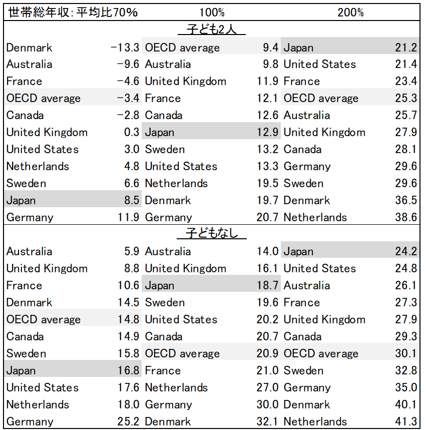 論文NIRAワーキングペーパーNo.9 2024.05.17 勤労者世帯の負担と給付の国際比較OECD tax-benefit model(TaxBEN)を用いたアプローチ この記事は分で読めます シェア Tweet 関島梢恵 NIRA総合研究開発機構主任研究員 概要 家計にどれほどの税や社会保険料の負担がかかり、手当などの給付を受けられるのか、ということは、人々の大きな関心事であり、その制度設計は政策的に非常に重要である。しかし、税制・給付制度は複雑で全体像を把握しづらく、また、他国の情報を参考にすることも容易ではない。本稿では、OECDが各国の政策・制度の内容を収集して構築したOECD tax-benefit model(TaxBEN)を用いて、勤労者世帯における収入と純負担の関係を分析し、国際比較を踏まえながら日本の特徴を整理した。モデル世帯アプローチ(hypothetical family approach)に基づき2022年のデータでシミュレーションしたところ、以前から指摘されるように、日本は低中所得層において収入に占める社会保険料の負担割合が高いことが確認された。また、諸外国と比べると、日本は負担率全体の累進度が低く、高所得層ほど相対的に負担率が低くなることがわかった。この傾向は子どもの有無にかかわらず観察された。さらに、収入が児童手当の所得制限や所得上限を超えるところで負担率が上がる段差があることや、配偶者の働き方によって世帯の負担率が異なることも検証した。不公正な仕組みを是正し、税と社会保険を一体的に改革する必要性が示唆される。 PDFで読む (1.6MB) INDEX 1.問題意識と背景 2.モデルとデータ 3.結果 3-1.日本の勤労世帯の給付と負担の構造 3-2.勤労世帯の負担率の国際比較 3-3.主要国における給付と負担の構造 4.まとめ 図表図1 共働き世帯(左:子どもあり、右:子どもなし)の総年収と負担率の内訳(日本、2022年)図2 片働き世帯(左:子どもあり、右:子どもなし)の総年収と負担率の内訳(日本、2022年)図3 4人世帯(夫婦と子ども2人)の総年収と負担率の比較(日本、2022年)図4 大人1人世帯(左:子どもあり、右:子どもなし)の総年収と負担率の内訳(日本、2022年)図5 共働き世帯(左:子どもあり、右:子どもなし)の総年収と負担率の関係(日本とOECD、2022年)図6 片働き世帯(左:子どもあり、右:子どもなし)の総年収と負担率の関係(日本とOECD、2022年)図7 大人1人世帯(左:子どもあり、右:子どもなし)の総年収と負担率の関係(日本とOECD、2022年)表8 共働き世帯の負担率(日本と主要9カ国、2022年)図9 共働き世帯(左:子どもあり、右:子どもなし)の総年収と負担率の内訳(OECD平均と主要9カ国、2022年) 1.問題意識と背景 人口の減少と高齢化の進展によって、日本の社会保障費は増加の一途をたどり、社会保障制度の持続性の確保が大きな課題となっている。必要な財源を確保するための税や社会保険料の改革が求められる一方、特に若年層にのしかかる負担は経済的不安を助長し、少子化問題をますます深刻化させる恐れがある。少子化対策のために2026年度から徴収予定の「子ども・子育て支援金」に関しても、負担の不透明さや不公平性などを懸念し、政府に対して丁寧な説明を求める声は多い。このような改革を推し進めるうえで重要なのは、制度を適切に設計することはもとより、国民が自分たちにかかる負担と受益を理解し、納得できることである。 負担という点において、個人の能力に応じた負担をする「応能負担」を望む人は多い。2022年にNIRA総研が全国の市民を対象に実施したアンケート調査で、税負担における争点への考えをたずねたところ、『個人所得税を引き上げるときには、所得の多い少ないにかかわらず、一律に税率を引き上げるべきだ』という考えより、『個人所得税を引き上げるときには、高所得者の税率を引き上げるべきだ』という考えを支持する人が多かった(注1)。また、同機構が2021年に実施した調査では、後期高齢者を対象とした医療費の窓口負担割合の引き上げに対する考えを探ったところ、『医療費を負担できる能力の区切りに「年齢」を用いるべきではない。「応能負担」に切り替えるべき』という論点が関心を集めた(注2)。 このように応能負担の考え方が支持される一方、いざ応能負担原則に基づいて政策を立案しようとしても、必ずしも人々が賛成に回るわけではないことも観察されている。前述の2021年調査では、当時国会で審議されていた、年収が200万円以上の後期高齢者の医療費の窓口負担を1割から2割に引き上げる法改正について、反対と回答した人の方が応能負担に関心を示していた。この一見矛盾する考えの背後にある理由の1つとして、川本(2022)は負担の引き上げとなる所得水準に対して疑問を持つ人が多いことを指摘している。「年収200万円で医療負担が増えるのは厳しい」といった意見が見られたという。負担能力を考える際、政策当局が想定する負担者の状況と、人々がイメージする負担者の状況には、乖離があるのかもしれない。 政策当局と人々の認識に乖離があるならば、その原因は何だろうか。個人が直面している状況が多