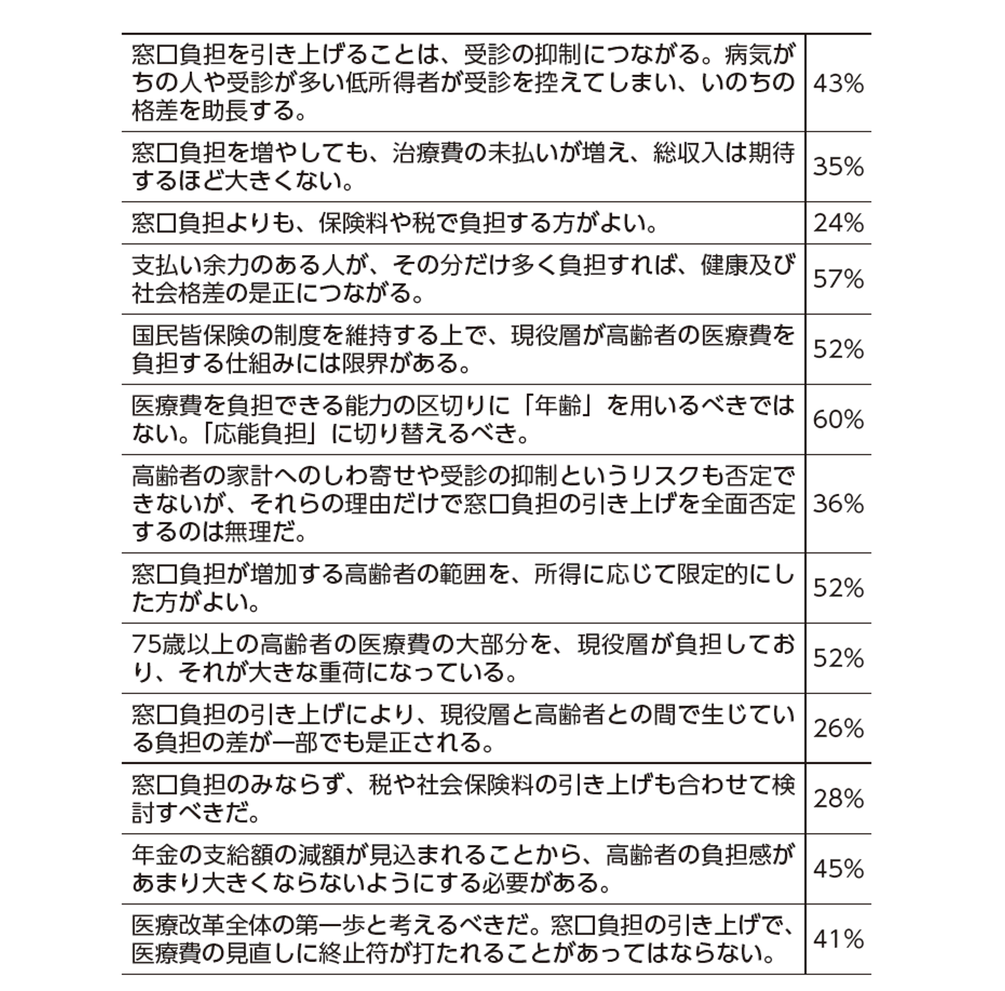 English version NIRAオピニオンNo.61 2022.03.03 高齢者の医療費負担増を人びとはどう受け止めているか熟慮・熟議型調査から考える(2) この記事は分で読めます シェア Tweet 翁百合 NIRA総合研究開発機構理事/日本総合研究所理事長 概要 2021年の法律改正において、後期高齢者(75歳以上)医療費の自己負担割合の引き上げが決定した。国民はこの改正を、実のところ、どう受け止めているのだろうか。 NIRA総合研究開発機構は、経済・社会のテーマに関する「世論」が、熟慮や熟議を経ることでどのような軌跡をたどるのか、を調査した。その中で、人びとは社会保障の問題に高い関心を示し、過半数の人が後期高齢者の自己負担の引き上げに賛成した。多くの国民にとって、社会保障の問題は、現在または将来の自分事として考えやすく、不安を持っているようだ。ただし、個人の状況によって賛否が分かれる点も留意しなければならない。人びとに受け入れられる医療政策を策定するためには、少数派の意見にも配慮しながら、世代を超えて納得できるやり方を探ることが極めて重要である。 手がかりになるのは、人びとの認識に見られた共通点だ。医療制度の持続可能性に対する懸念、医療費の無駄の削減といった効率性への認識、そして最も注目されるのが、医療費の負担割合を「年齢」で区切ることへの不満である。年齢ではなく負担能力で考えるべきだ、という「応能負担」の考え方が大きな支持を集めている。今後、「負担の分配」を考えていかなければならない中で、国民の合意を形成するためのアジェンダを提起する。 PDFで読む (1.1MB) PDF (English) (868.8KB) INDEX 社会保障は国民の関心が高く、自己負担の引き上げ賛成が過半である 明らかになった共通点 合意形成のために議論すべきアジェンダ 国民の声に応える NIRA総合研究開発機構では、2回のアンケート調査(以下[熟慮]とする)とオンラインインタビュー形式での議論(以下[熟議]とする)を組み合わせて、様々な重要な課題について議論を喚起するプロジェクトを実施している*。本稿では、本プロジェクトで最初に課題を提起した、「後期高齢者医療費の自己負担割合の引き上げ」という個別テーマに対する国民の意見や関心についてわかってきたことを取りまとめる。* プロジェクトでは、社会・経済に関する4つのテーマを選び、モニター登録型インターネット調査、およびオンライン座談会を実施した。インターネット調査は2回に分けて行われ、第1回目は、属性などの基本的情報や政策についての意見を調査した。第2回目では、人々の考えがどのように変化するかを調べるため、意見の異なる専門家(近藤克則氏、小塩隆士氏、西沢和彦氏)の論考を読んだ上で第1回調査と同じ質問に再度回答してもらった。これを熟慮型調査という。他方、第1回目の回答者のうち12名が同席する、Zoomを用いたオンラインでのインタビューを実施した。インタビューでは、熟慮型調査と同じ識者の意見を読み、また、互いの意見を聞き合った上で意見変化を観察した。これを熟議型調査という。調査方法・結果の詳細については、谷口将紀(2022)「人びとが受け入れ可能な政策ビジョンとは-熟慮・熟議型調査から考える(1)-」NIRAオピニオンペーパーNo.60、および川本茉莉(2022)「後期高齢者医療をめぐる熟慮・熟議型調査」NIRAワーキングペーパーNo.2を参照されたい。 社会保障は国民の関心が高く、自己負担の引き上げ賛成が過半である まず、1回目のアンケート調査で、政府に優先的に取り組んでほしい課題をたずねたところ、「年金・医療・介護」は26.8%を占め、最も優先すべき政策として挙がってきた。社会保障問題は、多くの国民にとって、現在、または将来の自分事として考えやすく、不安を持っているテーマであることが明らかになった(図表1)。 図表1 「もっとも優先的に取り組んでほしい政策」の回答 (注)n=4,238(出所)NIRA総研(2021)「第3回中核層調査」から筆者作成 また、2021年の法律改正において、後期高齢者医療費の自己負担割合の引き上げが決定したことについて意見を聞いた。年収が200万円以上の後期高齢者は、従来、医療費の自己負担は原則1割であったが、2022年10月からこれを2割に引き上げることに対する意見である。この引き上げについては、66%が賛成という結果となり、過半の人たちが賛成していることがわかった(図表2)。オンラインインタビュー形式での熟議でも、ほとんどの人が引き上げを支持した。ただし、1回目のアンケート調査から、1か月半の期間を置いた2回目の調査では1回目に意見を保留していた人たちの中で、いろいろな情報に接してより考えを深めた結果、「どちらかといえば反対」と答える人たちが増え、「反対」が20%を大きく超えた(前掲図表2)。このように、後期高齢者医療や財政の状況などは「話せばわかる」といった単純な話ではなく、やはり個人の置かれている状況等によって賛否が分かれる問題であるということが印象づけられた。さらに、年齢別に
