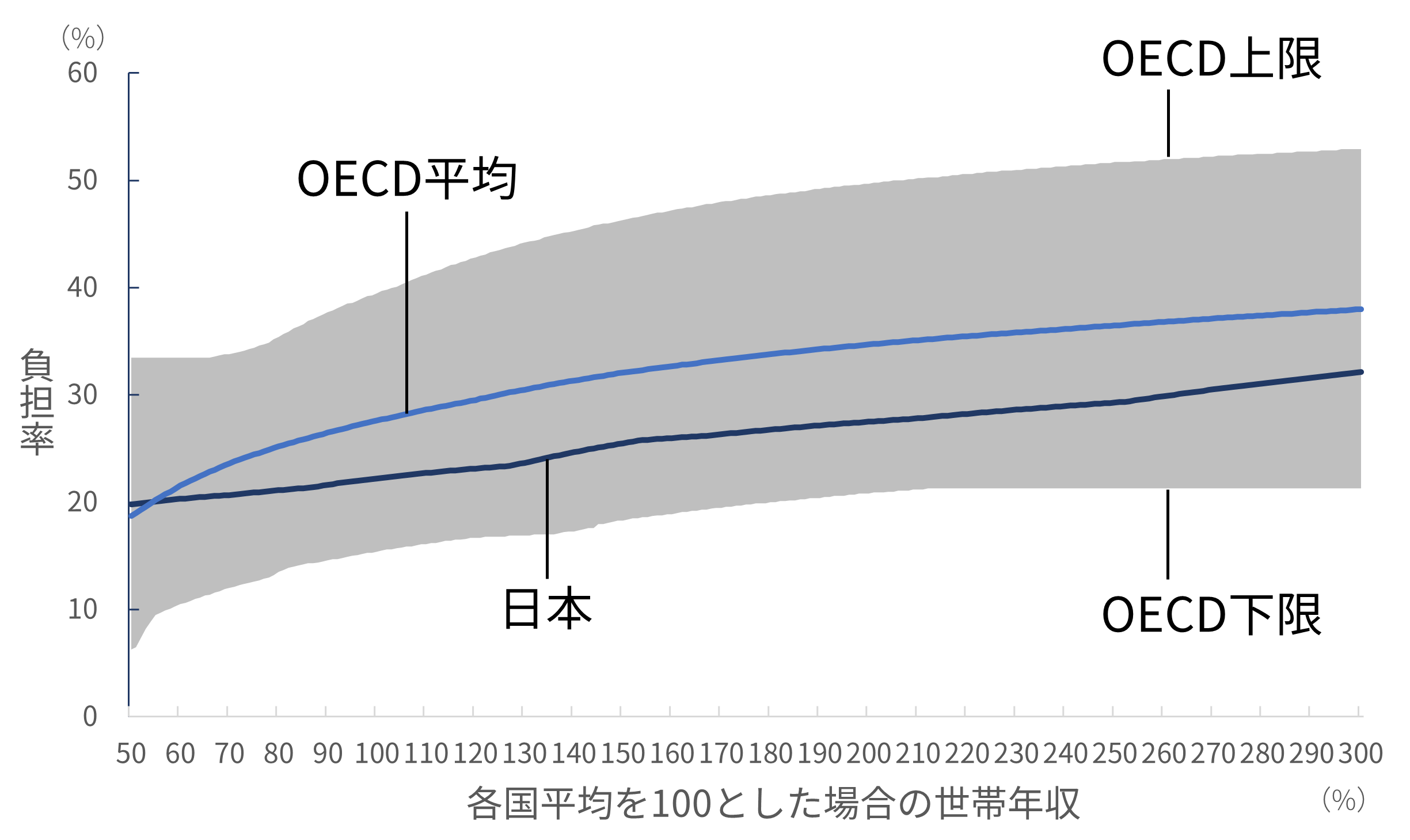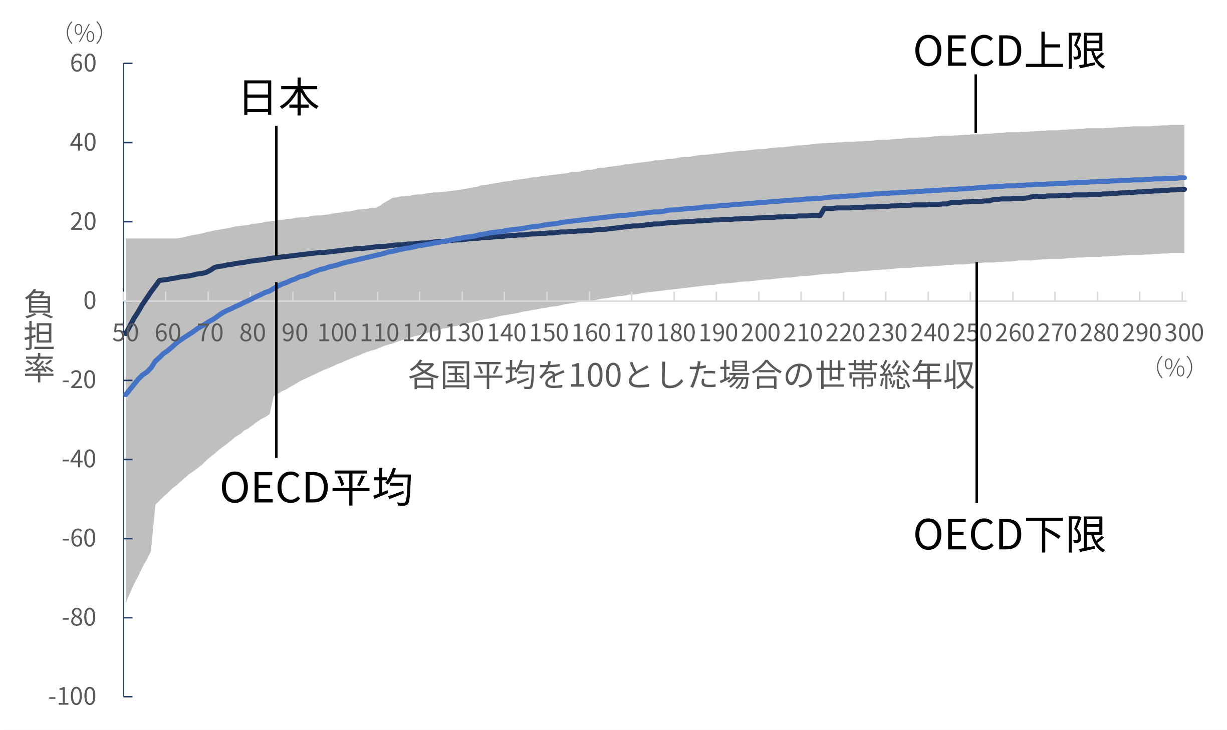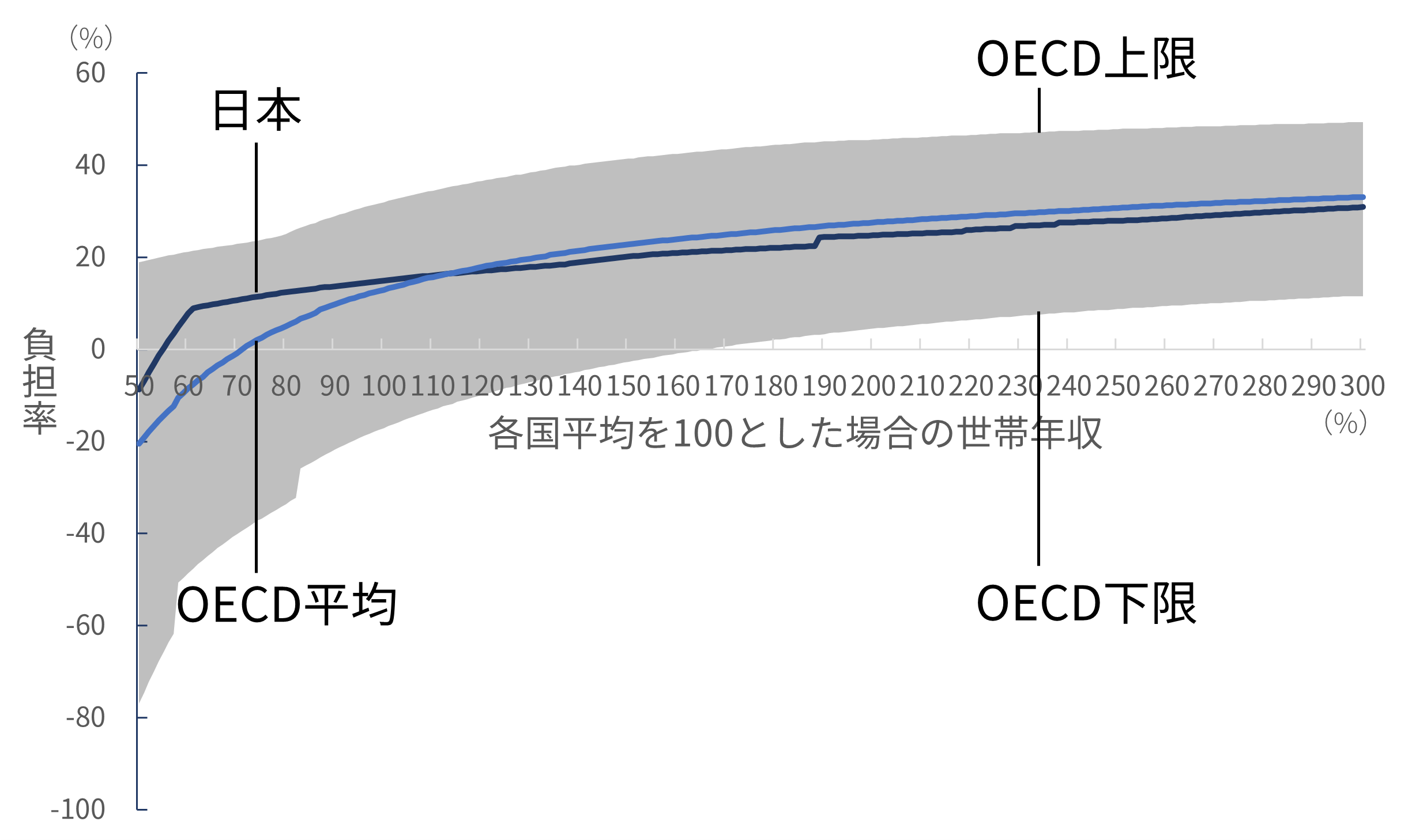 English version NIRAオピニオンNo.65 2023.05.16 子育て世帯の負担と給付の公正性は確保されているか被雇用者世帯の所得と負担率の国際比較分析 この記事は分で読めます シェア Tweet 翁百合 NIRA総合研究開発機構理事/日本総合研究所理事長 概要 少子化対策や女性活躍を後押しするためには、若者の所得を増やして将来不安を軽減することや、社会保険制度を働き方に中立的になるように設計することが重要である。こうした課題への政府の対応はまだ不十分であり、特に世帯単位でみた場合に税や社会保険料の負担や手当などの給付が公正なのかについては、本格的な検討や議論も行われていない。本稿は、税と社会保険制度の負担、児童手当などの給付の望ましい在り方を検討するため、OECDのモデルを用いて、被雇用者世帯の税や社会保険料の負担および給付を、国際比較を含むさまざまな角度から分析した。 分析の結果、日本は所得水準に応じた世帯の負担率に段差が存在し家計の行動に中立的になっていないこと、諸外国と比較して子どものいない世帯に比べて子どもがいる世帯への支援が薄いこと、そして、低所得層における負担率が他の所得層と比較して相対的に高いことが明らかになった。安心して子育てのできる環境を実現するには、負担と給付の公正性を確保する必要がある。そのためには、まずは低所得の子どもがいる世帯への支援を強化することが急務である。また、応能負担を強化するとともに、税や社会保険料の負担や手当などの給付を所得の一定水準で増減、廃止する手法も見直す必要がある*。 PDFで読む (1.8MB) PDF (English) (1.5MB) INDEX 1.はじめに 2.段階的にジャンプする日本の歪(いびつ)な負担率のカーブ 片働き世帯 共働き世帯 3.日本は子どもがいる低所得世帯の負担率が高い 片働き世帯 共働き世帯 大人1人世帯(単身世帯またはシングルマザー・シングルファザー世帯) 4.日本は低所得世帯の高い負担率、高所得世帯の低い負担率が特徴 大人1人世帯(単身世帯またはシングルマザー・シングルファザー世帯) 片働き世帯 共働き世帯 5.低所得の子育て世帯への支援が急務―応能負担を基本とした税と社会保険料負担および児童手当の設計の見直しを 1.はじめに 日本の少子化に歯止めがかからない。原因のひとつに、若者層の所得が低く、子育ての負担が大きいことがあると指摘されている。経済の低成長が続く中、将来に明るい展望が持てず、若年層の不安が広がっている。他方で、女性の労働参加が進んでいるが、社会保険、そして政府・自治体や個別企業が支給する手当といった制度が、働き方に中立な仕組みになっておらず、女性の働き方に制約を及ぼしている可能性がある。例えば、社会保険料の「年収の壁」などの問題である。すなわち、妻の所得がある水準を超えると、妻自身が社会保険料を支払うためにかえって手取り額が減少してしまい、共働き世帯の女性が、あえて労働時間を抑制し、所得増加の機会を逃しているとされる。 従前から政府は、少子化対策や女性活躍を旗印として掲げてはいるものの、働き方に中立的な制度への改革は実行に移されていない。現政権が取り組んでいる「人への投資」を、希望する就労や生き方へとつなげるためにも、若者の所得を増やして将来不安を軽減し、公正な税と社会保険制度、手当の仕組みを設計することが重要である。 本稿では、税と社会保険料の負担、手当などの給付の望ましい在り方を検討するために、日本の家計の実態をさまざまな角度から分析し、国際的な視点から浮かび上がる日本の特徴を指摘したうえで、今後の課題を提起する。具体的には、国際比較が可能な被雇用者の子育て世帯や共働き世帯への税と社会保険料の負担、手当などの給付がどうなっているのか、また、政策的な配慮がどの程度なされているのかを分析し、それによって女性の労働参加をはじめ人々の行動にどのような影響を与えているかについて考えていくこととする。 もっとも、公正性を取り上げるのであれば、以前から指摘されている国民年金第3号被保険者で、仕事をしていない専業主婦が、夫が保険料を支払うことにより基礎年金の支給を受けられるといった問題や、夫婦で遺族年金に差があるといった問題を、議論すべきであることはいうまでもない。しかしながら、それらの問題を完全に解決するには年金制度全体の抜本的な議論を要する。そのため、ここでは早急に検討すべき課題として、世帯の収入と税・社会保険料・給付の関係における不公正の是正に絞って話を進めることとする。 また、2014年に実施された社会保障と税の一体改革は、社会保障制度を維持するために消費税率を引き上げるという国全体でみた財源の確保を目的とした改革であった。だが、世帯単位でみたときに、税と社会保険料が適正な負担となっているかどうかについては、本格的な検討や議論が行われずに今日に至っている。そのため、本稿では、特に世帯別にみた税と社会保障の
