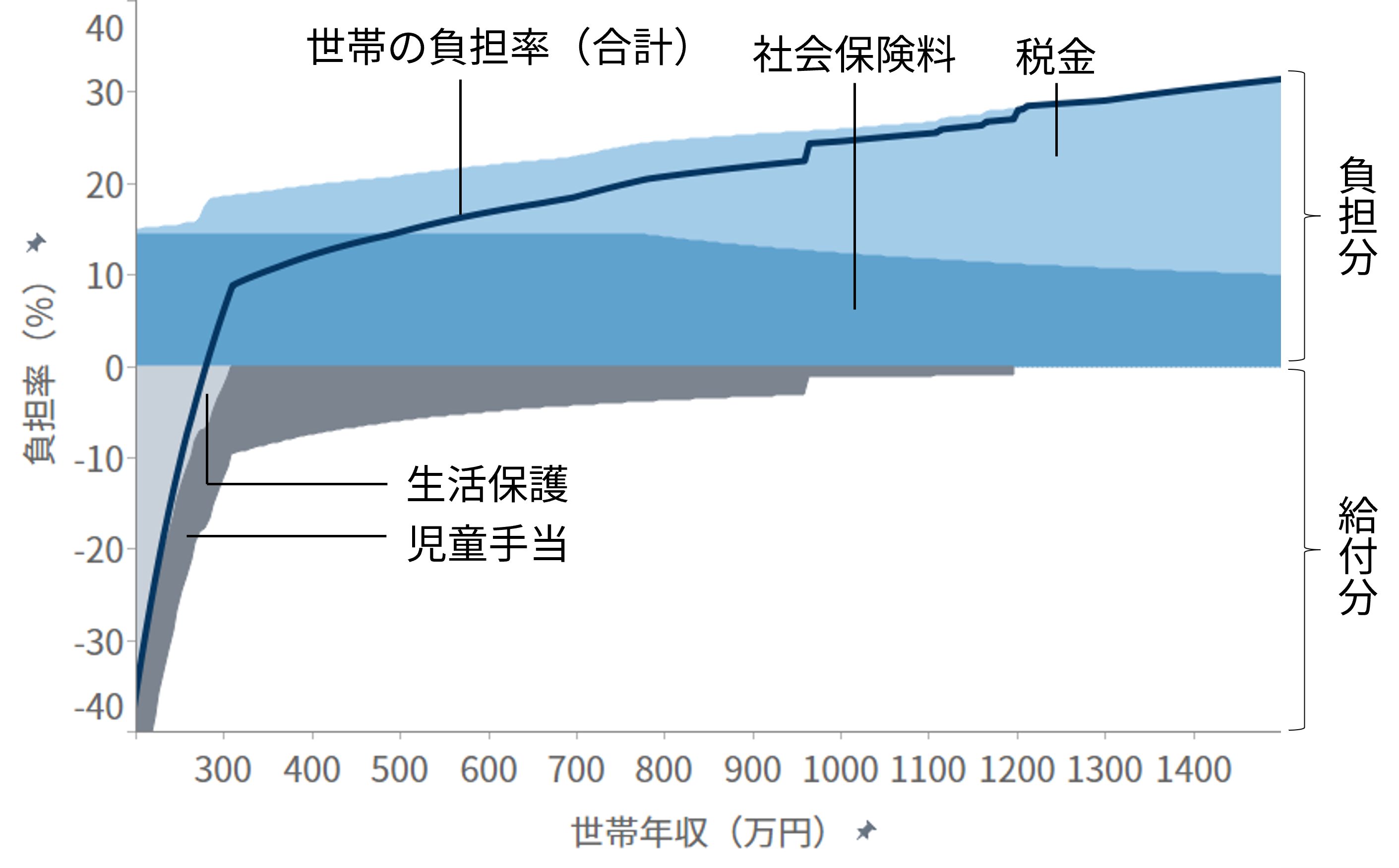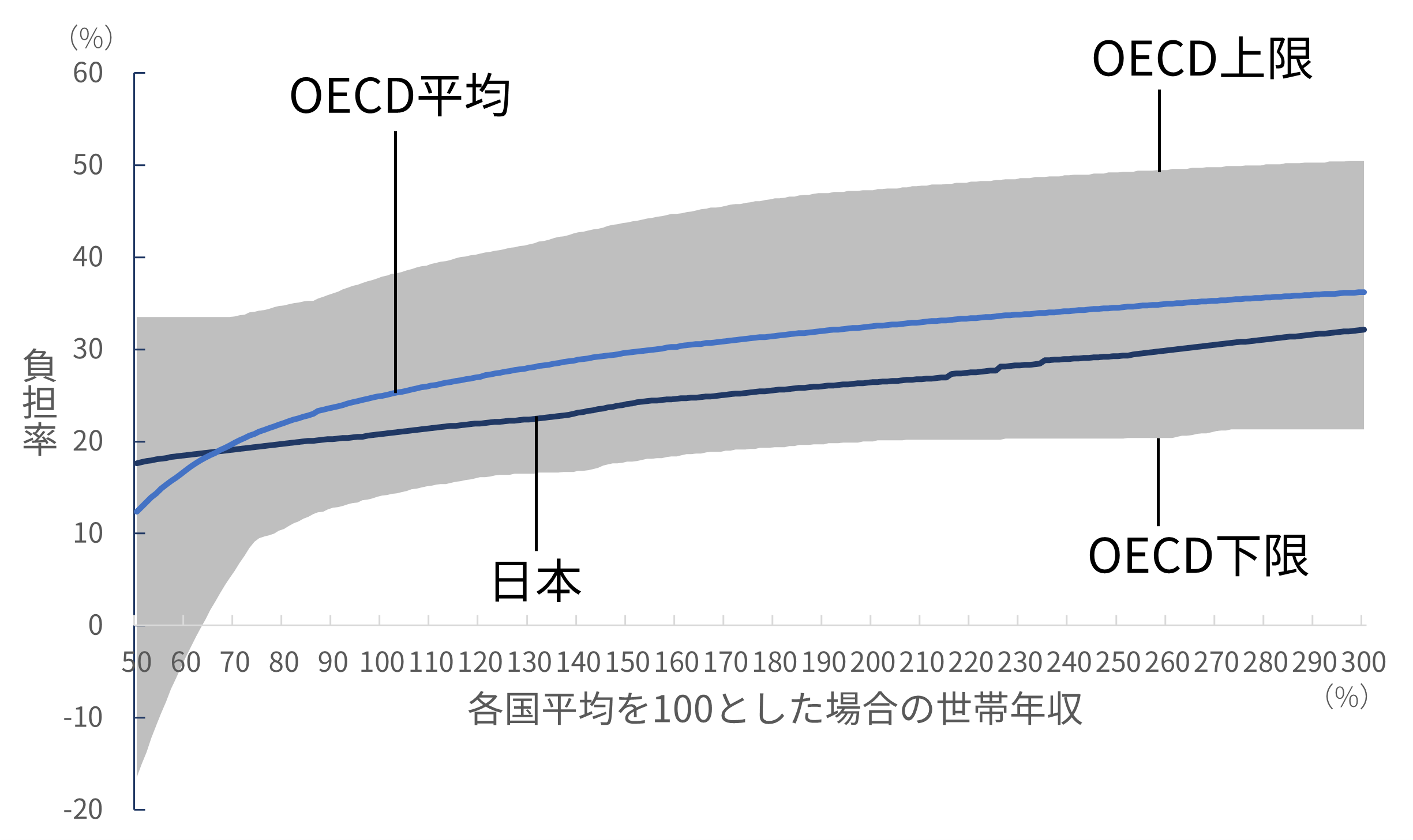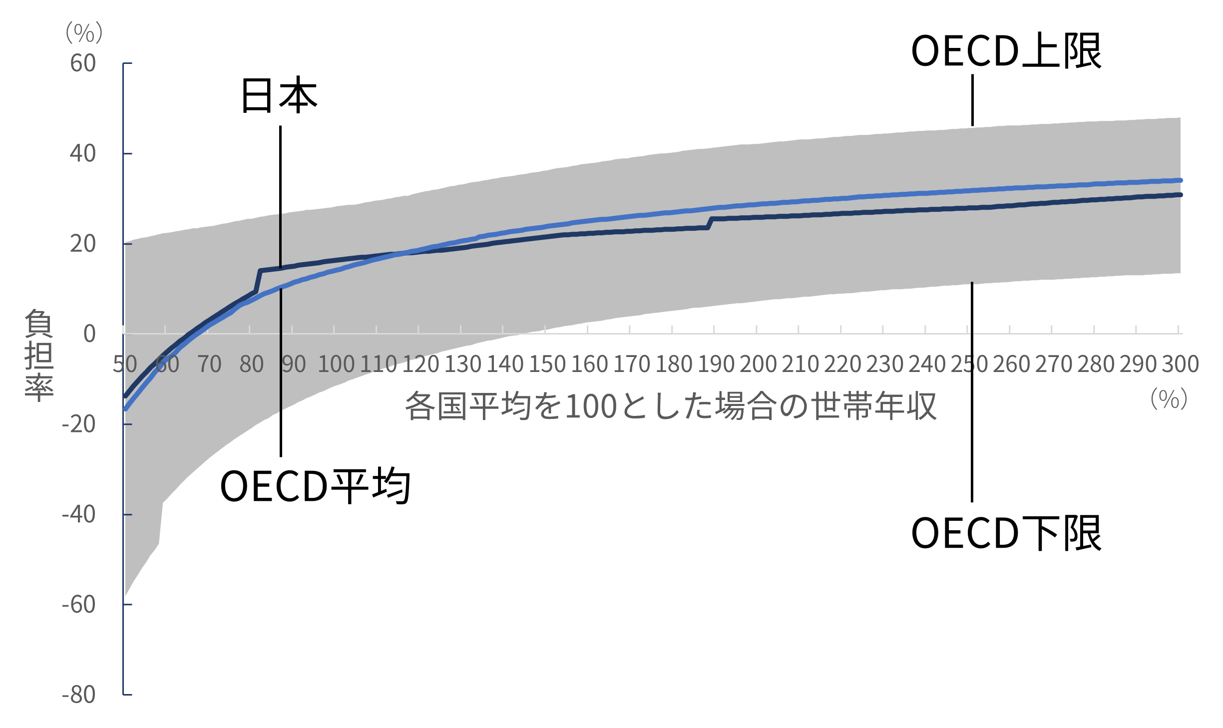 English version NIRAオピニオンNo.65 2023.05.16 子育て世帯の負担と給付の公正性は確保されているか被雇用者世帯の所得と負担率の国際比較分析 この記事は分で読めます シェア Tweet 翁百合 NIRA総合研究開発機構理事/日本総合研究所理事長 概要 少子化対策や女性活躍を後押しするためには、若者の所得を増やして将来不安を軽減することや、社会保険制度を働き方に中立的になるように設計することが重要である。こうした課題への政府の対応はまだ不十分であり、特に世帯単位でみた場合に税や社会保険料の負担や手当などの給付が公正なのかについては、本格的な検討や議論も行われていない。本稿は、税と社会保険制度の負担、児童手当などの給付の望ましい在り方を検討するため、OECDのモデルを用いて、被雇用者世帯の税や社会保険料の負担および給付を、国際比較を含むさまざまな角度から分析した。 分析の結果、日本は所得水準に応じた世帯の負担率に段差が存在し家計の行動に中立的になっていないこと、諸外国と比較して子どものいない世帯に比べて子どもがいる世帯への支援が薄いこと、そして、低所得層における負担率が他の所得層と比較して相対的に高いことが明らかになった。安心して子育てのできる環境を実現するには、負担と給付の公正性を確保する必要がある。そのためには、まずは低所得の子どもがいる世帯への支援を強化することが急務である。また、応能負担を強化するとともに、税や社会保険料の負担や手当などの給付を所得の一定水準で増減、廃止する手法も見直す必要がある*。 PDFで読む (1.8MB) PDF (English) (1.5MB) INDEX 1.はじめに 2.段階的にジャンプする日本の歪(いびつ)な負担率のカーブ 片働き世帯 共働き世帯 3.日本は子どもがいる低所得世帯の負担率が高い 片働き世帯 共働き世帯 大人1人世帯(単身世帯またはシングルマザー・シングルファザー世帯) 4.日本は低所得世帯の高い負担率、高所得世帯の低い負担率が特徴 大人1人世帯(単身世帯またはシングルマザー・シングルファザー世帯) 片働き世帯 共働き世帯 5.低所得の子育て世帯への支援が急務―応能負担を基本とした税と社会保険料負担および児童手当の設計の見直しを 1.はじめに 日本の少子化に歯止めがかからない。原因のひとつに、若者層の所得が低く、子育ての負担が大きいことがあると指摘されている。経済の低成長が続く中、将来に明るい展望が持てず、若年層の不安が広がっている。他方で、女性の労働参加が進んでいるが、社会保険、そして政府・自治体や個別企業が支給する手当といった制度が、働き方に中立な仕組みになっておらず、女性の働き方に制約を及ぼしている可能性がある。例えば、社会保険料の「年収の壁」などの問題である。すなわち、妻の所得がある水準を超えると、妻自身が社会保険料を支払うためにかえって手取り額が減少してしまい、共働き世帯の女性が、あえて労働時間を抑制し、所得増加の機会を逃しているとされる。 従前から政府は、少子化対策や女性活躍を旗印として掲げてはいるものの、働き方に中立的な制度への改革は実行に移されていない。現政権が取り組んでいる「人への投資」を、希望する就労や生き方へとつなげるためにも、若者の所得を増やして将来不安を軽減し、公正な税と社会保険制度、手当の仕組みを設計することが重要である。 本稿では、税と社会保険料の負担、手当などの給付の望ましい在り方を検討するために、日本の家計の実態をさまざまな角度から分析し、国際的な視点から浮かび上がる日本の特徴を指摘したうえで、今後の課題を提起する。具体的には、国際比較が可能な被雇用者の子育て世帯や共働き世帯への税と社会保険料の負担、手当などの給付がどうなっているのか、また、政策的な配慮がどの程度なされているのかを分析し、それによって女性の労働参加をはじめ人々の行動にどのような影響を与えているかについて考えていくこととする。 もっとも、公正性を取り上げるのであれば、以前から指摘されている国民年金第3号被保険者で、仕事をしていない専業主婦が、夫が保険料を支払うことにより基礎年金の支給を受けられるといった問題や、夫婦で遺族年金に差があるといった問題を、議論すべきであることはいうまでもない。しかしながら、それらの問題を完全に解決するには年金制度全体の抜本的な議論を要する。そのため、ここでは早急に検討すべき課題として、世帯の収入と税・社会保険料・給付の関係における不公正の是正に絞って話を進めることとする。 また、2014年に実施された社会保障と税の一体改革は、社会保障制度を維持するために消費税率を引き上げるという国全体でみた財源の確保を目的とした改革であった。だが、世帯単位でみたときに、税と社会保険料が適正な負担となっているかどうかについては、本格的な検討や議論が行われずに今日に至っている。そのため、本稿では、特に世帯別にみた税と社会保障の