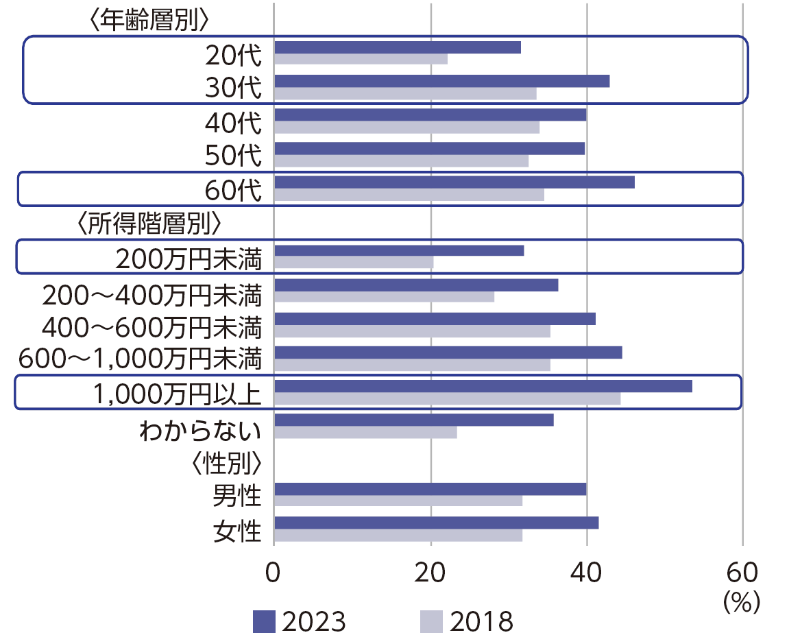 NIRAオピニオンNo.75 2024.01.04 大きく進捗したキャッシュレス決済コード決済の普及で若年層の現金決済志向は低下 この記事は分で読めます シェア Tweet 翁百合 日本総合研究所理事長/NIRA総合研究開発機構理事 概要 2018年からの5年間でキャッシュレス決済は大幅に増加し、決済額ベースでは7割を超えるまでになった。政府のキャッシュレス推進策とコロナ禍での人びとの行動変容に加えて、この間に多くのプラットフォーム事業者が加盟店開拓やポイントを活用した積極的な顧客開拓を目指して競争したことが奏功したと考えられる。 キャッシュレス決済額比率は、この間急速に普及したスマホで簡易に決済が行える、QRコード・バーコード決済およびタッチ決済(以下「コード決済等」)と、クレジットカード決済の利用拡大で上昇した。コード決済等は地域に関わりなく、どの年齢層・所得層でも広がったが、特に若年層に普及し、その現金決済志向を大きく変化させた。また、クレジットカード決済は若年層と低所得層の利用が進んだ上、Eコマースの広がりもあって、高齢層や高所得層にも浸透している。課題とされていた低所得層のキャッシュレス比率の低さは、この5年間でかなり解消されたと評価できる。他方、まだキャッシュレス比率が低いのは、医療・介護などの分野や個人送金であり、今後の一層の進展が期待される。 人手不足が深刻化するにつれて、企業としても生産性向上が大きな課題となっており、キャッシュレス化は今後も進むことが予想される。一方で、キャッシュレス化とともに、セキュリティの確保や個人情報の適切な管理と活用が、民間事業者にとってますます重要な課題となっている*。 PDFで読む (1.7MB) INDEX はじめに 1.低所得層と若年層で大きく進捗したキャッシュレス決済 2.コロナ禍の影響を受けた5年間の特徴的な動き (1)コード決済等が若者層をはじめ全世代、全所得層で広がり、現金決済からコード決済等へ明確にシフト (2)クレジットカード決済は、低所得・高所得層と若年層・高齢層で広がり (3)地域間のばらつきはやや縮小したが残存 3.ポイント利用の分析 4.キャッシュレス化の今後の展望と課題 はじめに 本稿では、2023年と2018年に実施した「キャッシュレス決済実態調査」に基づき、ここ5年間の消費者のキャッシュレス決済動向の変化を分析し、今後の課題について考察する(注1)。 2018年の調査を基に執筆したNIRAオピニオンペーパーNo.42(2019年2月)では、キャッシュレス化を国民全体に浸透させるには、次の3点が重要であると指摘した。①低所得層への普及、②郵便・医療介護といった公的色彩の強いサービスのキャッシュレス化の実現、③民間企業間での、付加価値の高いサービスを提供するための「競争」および個人間小口送金などのインターオペラビリティ(相互運用性)の高いサービスを構築するための「協調」の促進―である。利便性の高いデータ利活用社会を構築するためには、これらの課題への取り組みが不可欠である。 その後、キャッシュレス決済にポイントを付与するといった政府の推進策に加えて、2020年以降のコロナ禍がキャッシュレス化を後押しすることになった(注2)。そこで、本稿ではキャッシュレス化の進展の状況やその背景を分析した上で、5年前に提示した上記課題が解消に向かっているかについて確認し、残る課題を指摘することとしたい。 1.低所得層と若年層で大きく進捗したキャッシュレス決済 まず、図1の通り、コロナ禍(2020年1月~2023年5月)もあってキャッシュレス決済額比率は51%から71%に大きく増えた(注3)。内訳を見ると、その増加はクレジットカード決済、QRコード・バーコード決済およびタッチ決済(以下「コード決済等」という)でそのほとんどを説明できる(注4)。 図1 2018年と2023年のキャッシュレス決済額比率の変化 (注)QRコード・バーコード決済およびタッチ決済は、2018年調査では「プリペイド式電子マネー以外のフィンテック決済」としてたずねたもの。数値は小数点第2位以下を四捨五入。(出所)NIRA総合研究開発機構(2018、2023)「キャッシュレス決済実態調査」を基にNIRA作成。以下、図の出所は全て同じ。 所得階層別に見ると、図2の通りキャッシュレス決済額比率は全階層で上昇したが、200万円以上の所得階層での増加が18%ポイント程度(除く「わからない」回答者層)であるのに対し、200万円未満の低所得層が24%ポイントも増えている。この結果、所得階層別のキャッシュレス決済額比率の差異が5年間でかなり小さくなってきた。 図2 所得階層別のキャッシュレス決済額比率の変化 (注)グラフ右側の数値は所得階層別のキャッシュレス決済額比率の変化幅(%ポイント)を表す。 年齢層別では、20代以外の年齢層のキャッシュレス決済額比率が20%ポイント程度の上昇であるのに対し、20代では29%ポイントも上昇している(注5)(図3)。このことが、上記の低所得層のキャッシュレス決済額比率の上昇にも寄与していると考えられる。 図3 年齢層別に見たキャッ