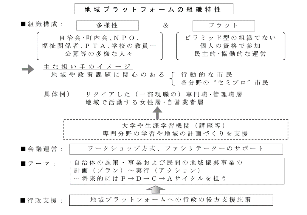 研究報告書 2007.12.01 地域魅力を創出する関西圏の地域プラットフォーム経営と行政施策 この記事は分で読めます シェア Tweet 株式会社都市文化研究所 概要 本報告は、『地方の魅力づくりとその活用』ならびに『地域雇用拡大への新たな取り組み』をテーマに、全国5機関のシンクタンクに委託して実施した事例調査のうちの1つ「地域魅力を創出する関西圏の地域プラットフォーム経営と行政施策」の研究成果である。 地方分権改革の方策の1つである「住民自治の確立」に向けて、従来の地方自治の仕組みとは異なる、「地域プラットフォーム」という仕組み(組織)が、関西圏の自治体で試行され始めている。地域プラットフォームとは、「地域協働の場」であり、行政のみならず、市民、企業、NPO、大学など地域の多様な主体が地域の諸課題を共有し、まちづくりを推進していく住民自治の組織手法である。住民と行政との協働や時に住民主体によりコミュニティの総合的なまちづくりが進められる一方、福祉、教育、環境、防災などの専門分野においても、行政政策・事業の立案段階から市民が参画し協働していくことを可能とする。地域の多様でクリエィティブな人材のパワーを活かす創造都市の施策であると言える。 本研究では、関西圏におけるこのような地域プラットフォームの事例について、主体(担い手)の関わり方による類別を行い、各事例のあり方や特性を調査するとともに、今後の課題についてもそれぞれ展望した。 その上で、地域の魅力を創出する市民参画の創造的手法として地域プラットフォームを立ち上げる際には、以下の行政支援施策が必要であるとの提言を行った。 1.条例や計画により、「地域プラットフォーム」を位置づける 2.地域住民によるプラットフォーム運営へ専門家を派遣する 3.地域プラットフォームへの権限委譲を伴う財政的支援を行う 4.地域プラットフォームの先進的事業を、自治体全体の政策・事業へ創りあげていく仕組み 5.地域プラットフォームに対する、行政のタテ割りを超えた支援 全文を読む (10.7MB) INDEX エグゼクティブサマリー 近年、提唱されている行政・市民・企業等が協働で担う「新しい公」は、市民・企業等の民間活力を行政に取り込み、公務員のファシリテーション能力で民間パワーを引き出すことによって可能なものである。地域プラットフォームという場(仕組み)は、自治体の政策・事業の企画段階からの“市民参画と協働”の手法であり、地域の多様でクリエイティブな人材のパワーを活かす創造都市の施策であると言える。地域プラットフォームの仕組みを以下にまとめる。 地域の魅力を創出する市民参画の創造的手法として地域プラットフォームを立ち上げる際には、以下の行政支援施策が必要である。 1.条例や計画により、「地域プラットフォーム」を位置づける 2.地域住民によるプラットフォーム運営へ専門家を派遣する 3.地域プラットフォームへの権限委譲を伴う財政的支援を行う 4.地域プラットフォームの先進的事業を、自治体全体の政策・事業へ創りあげていく仕組み 5.地域プラットフォームに対する、行政のタテ割りを超えた支援 地域におけるプラットフォーム経営とそれをサポートする行政支援施策により、地方分権時代にふさわしい創造都市が誕生する。 目次エグゼクティブ・サマリーExecutive Summary要約第1章 住民自治のクリエイティブ組織、地域プラットフォーム第2章 市民主体・行政支援型地域プラットフォーム~大阪市淀川区「淀川フォーラム実行委員会」~第3章 行政主導・市民参画型地域プラットフォーム~川西市「福祉デザインひろば」~第4章 コミュニティプラットフォーム~宝塚市「まちづくり協議会」~第5章 大学・市民・行政協働型地域プラットフォーム~神戸大学・子育てプラットフォーム「あーち」~第6章 商店街・住民協働型地域プラットフォーム~「立花通活性化委員会」と「堀江ユニオン」~第7章 地域プラットフォーム経営の全体像English Summary 図表 図表 「淀川フォーラム実行委員会」の主たる構成メンバー図表1-1 西区の位置図表1-2 平成7〜17年、大阪市都心区の人口推移と人口増加率図表1-3 西区の人口・世帯数の推移図表1-4 西区建て方・建物階数別住宅数の推移図表1-5 町会の加入状況図表1-6 町会の加入状況×年齢別図表1-7 悩みと問題の相談者図表1-8 地域活動に参加するために克服するべき課題(複数回答)図表1-9 行政に求められる支援や取り組み図表1-10 地域活動への参加意向図表2-1 大阪市淀川区の位置図表2-2 新淀川の流路を示した開削計画図図表2-3 現在の淀川区域図表2-4 十三干潟の位置図表2-5 十三干潟の生き物の関係(食物連鎖)図表2-6 「淀川フォーラム実行委員会」構成メンバーの出身団体と淀川への関わり図表2-7 「よどがわ河川敷フェスティバル」のイベント展開と担い手図表2-8 市民主体の川づくり活動の流れ図表2-9 地域プラットフォーム、淀川フォーラム実行委員会の組織運営の特性図表2-10 取り組み体制図表2-11 『淀