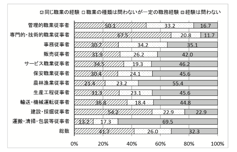 論文NIRAモノグラフシリーズNo.40 2016.08.01 職業特性と高齢者特性現役世代への意識調査から見えてくるもの この記事は分で読めます シェア Tweet 伊藤由希子 東京学芸大学人文社会科学系経済学分野准教授/NIRA総合研究開発機構客員研究員 西山裕也 NIRA総合研究開発機構主任研究員 概要 少子高齢化に伴い生産年齢人口が減少する日本では、高齢者の就業促進が喫緊の課題となっている。しかしながら、現行の高齢者雇用安定施策は、社会福祉的な観点のものが中心であり、高齢者の適性を引き出すためのものにはなっていないのが問題だ。現在の高齢者は身体機能、知的能力の水準が上昇していると言われているが、現実には65歳を境目として就業構造が大きく変化する「壁」に直面している。このような状況を改善するためには、高齢者の特性と仕事に求められる特性の関係を正しく理解することが重要となる。 このような問題意識のもと、NIRAでは、「職業の特性と就業の可能性に対するアンケート調査」を行った。 本モノグラフは、当該アンケート調査の結果を整理するとともに、分析する過程で見えてきた高齢者の特性と仕事に求められる特性の関係に横たわる3つのミスマッチの存在を明らかにする。第1のミスマッチは、職務活動におけるミスマッチである。現在の高齢者の就業は得意よりも不得意な活動に偏っている傾向が見られた。第2のミスマッチは個性・人柄および職務環境におけるミスマッチである。シニアの人格や個性を生かせる場は限られており、高齢者が不得手とする職務環境に当てはまる職業ほど高齢者の就業が多いという実態がある。第3のミスマッチは経験と知識におけるミスマッチである。長年にわたり蓄積された経験や知識はシニアの優位性が発揮できる特性であるが、日本の職業ではこれらを重要視する見方は総じて低調である。これらのミスマッチが解消に向かえば、高齢人材の就業のあり方も変わり、シニアが社会を支えるための原動力となり得る。 PDFで読む (3.2MB) INDEX 1. はじめに 2. 65歳の大きな「壁」 3. アンケート調査 4. 調査結果から明らかとなった3つのミスマッチ 5. 結論 1. はじめに 少子高齢化が進み、生産年齢人口が減少傾向に入った日本にとって、高齢者の就業促進は、雇用政策における重要な課題の1つである。2013年に「高年齢者雇用安定法」の改正が行われ、年金受給開始年齢(60~65歳)までの継続雇用が法制化された。しかし、これは年金受給開始までの空白期間の生活を支えるという社会福祉的な観点から実施されてきたものである。ここでいう「社会福祉的」という意味は、生活を維持するための職を確保することが最優先であり、高齢者の適性を引き出し、活力ある社会を実現しようという意図は希薄だということである。しかしながら、今は高齢者の雇用機会を保証するだけではなく、シニア層が自分の能力や経験を最大限に発揮し、それが日本社会に還元されることが求められているのではないだろうか。 一方、高齢者就業を取り巻く現実はどうか。仮に高齢者層が継続雇用制度に頼らず、いったんこれまで働いていた企業を離れて職を得ようとしたとき、その就業機会は限られている。多くのシニアは、個人の有する縁故以外には、地域のシルバー人材センターやハローワークでの募集に頼るしかないのが現状だ。昨今利用が拡大している転職サイトは、若者向けサービスが大多数を占めており、高齢者への募集は極めて少なく、高齢人材マッチングのプラットフォームは整っていない。現実に高齢者に提供される雇用環境は極めて限定的で、シニアが生きがいをもって働く環境が整っているとは考えにくい。 2. 65歳の大きな「壁」 ここで、高齢者の就業の現状について大まかに把握しておきたい。総務省「労働力調査」(2015年度)によると、年齢階級別の就業率は、65歳を境に大きく低下する。60歳から64歳と、65歳から69歳の就業者比率は、男性で75.5%から52.2%に、女性で49.4%から31.6%に大きく下がる。男女とも、それまで働いていた人の約3人に1人が労働市場から退出し、就業者比率が最も大きく変化する。 また、65歳を境に職業構成も大きく変化する。図表1に示すように、「生産工程従事者」、「事務従事者」、「専門的・技術的職業従事者」の比率が減少し、「運搬・清掃・包装従事者」、「農林漁業従事者」の比率が増加する。前者の3職業では、一定の職務経験・知識などを得た高齢人材が活躍できる場は、就業者数で見ても比率で見ても減少していることが分かる。 図表1 年齢階級別就業者の職業構成比(職業大分類) (データ出所)2012年度総務省「就業構造基本調査」 昨年(2015年)6月、日本老年学会は声明を発表し、近年、高齢者の身体機能、知的能力の水準が上昇しており、現在の高齢者(65~79歳)は10~20年前に比べて5~10歳は若返っていると表明した(注1)。この声明は、科学的な研究を踏まえてのものであり、個人差はあるものの、現在の高齢者には十分社会活動を営む能力