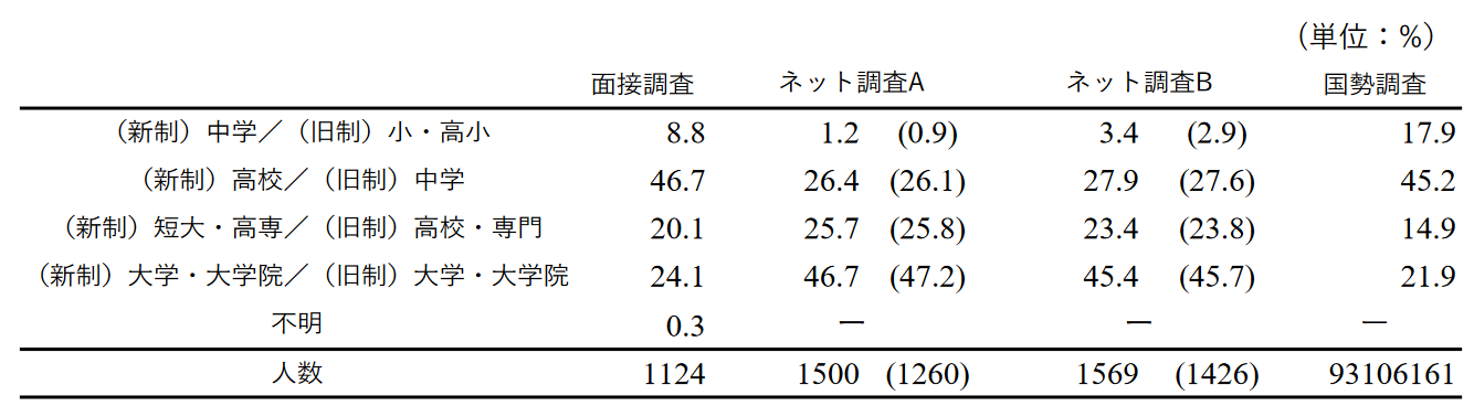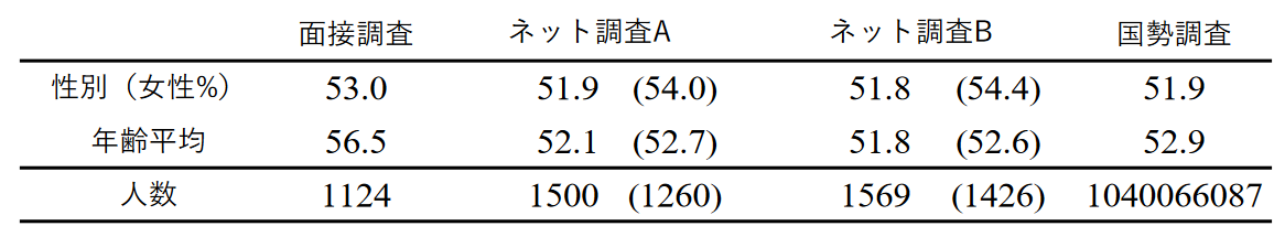 論文NIRAワーキングペーパーNo.1 2021.11.12 インターネット調査のサンプル特性国勢調査・面接調査との比較 この記事は分で読めます シェア Tweet 大森翔子 NIRA総合研究開発機構研究コーディネーター・研究員 概要 21世紀に入り、社会調査においてはインターネット調査が普及し、一般的な調査法の一つとなった。しかし、インターネット調査には「バイアス」があり、目標母集団との乖離が問題となる。こうした実態を明らかにするため、本プロジェクトでは、同一の質問項目によって構成される、無作為抽出に基づく面接調査と性別・年齢層で回収目標数を割り付けたインターネット調査を同時に実施し、国勢調査との共通項目と合わせて比較した。分析の結果、インターネット調査の回答者には一定の省力回答者が含まれ、国勢調査と比べて大都市居住者が多く、学歴も高いという特徴のほか、面接調査回答者と比べて外向性・協調性が低く、神経症的傾向が高いというパーソナリティの特性が分かった。一方、面接調査にも、国勢調査よりも「持ち家率」が高いといったバイアスがあり、無作為抽出に基づく調査結果を「正解」とするインターネット調査の補正には注意が必要なことが示唆される。 PDFで読む (2.6MB) INDEX 1.はじめに 2.問題の所在 2―1.標本抽出法と調査方法 2-2.日本におけるインターネット調査の現在 3.プロジェクトの目的 4.方法 4―1.調査の概要 4―2.調査項目 5.結果 5―1.国勢調査との共通項目 5―2.面接調査とインターネット調査の共通項目 6.結論 付録:各調査における質問と選択肢 図表図表1 本プロジェクトにおける各世論調査の概要図表2 性別・年齢図表3 居住地域 図表4 教育程度図表5 配偶者有無図表6 労働力状態 図表7 従業上の地位 図表8 業種図表9 住居の種類図表10 5年前常住地図表11 パーソナリティ図表12 1日のインターネット利用時間 図表13 インターネット利用目的 図表14 景況感 図表15 生活満足度図表16 長期的党派性図表17 内閣支持率 1.はじめに 日本の社会調査において長年行われ、最も精度が高いものとして信頼の置かれてきた「住民基本台帳から無作為抽出を行った者に対する面接調査」は、回収率の低下、個人情報保護目的での住基台帳の利用制限、調査員の質の維持困難等の理由により、実施のハードルが非常に高くなっている(本多,2006)。その状況と並行するかたちで、インターネットの急速な普及に伴い、商業目的・学術目的のインターネット調査、特にウェブアンケート調査が数多く行われるようになった。インターネット調査は、回答者が調査会社に登録する「モニター制」であることがほとんどである。「短期間に大量のデータが集められる」、「低コスト」であることが利点で、面接調査と比較した手軽さから多くの調査が行われている。しかしながら、インターネット調査が想定する母集団によっては標本の代表性が損なわれ、集計結果に母集団との「大きなズレ」が発生することは既に指摘されるところである。本論文は、NIRA総合研究開発機構において並行して実施した面接調査とインターネット調査の結果を国勢調査結果等と比較することにより、それぞれの調査モードの特性に関する基礎資料を提供する。 2.問題の所在 2―1.標本抽出法と調査方法 社会調査においては、想定する母集団(目標母集団)を全て調査する悉皆調査(全数調査)が最も理想的であることに違いないが、あらゆるコストを勘案すれば極めて実現可能性は低く、国勢調査などごく一部の調査を除いて「日本人全員」を母集団とする社会調査目的の悉皆調査は行われていない(注1)。 では、社会調査はどのように母集団から標本抽出を行い、その抽出した対象者の回答をもとに母集団の特徴を推論するのか。以下、代表的なものとして「住民基本台帳による無作為抽出と訪問面接調査法・郵送調査法」と「モニター登録型インターネット調査」を取り上げる。 (1)住民基本台帳による無作為抽出と訪問面接調査法・郵送調査法 わが国においては、氏名、生年月日、性別、住所などが記載された住民票を編成した住民基本台帳が存在し、学術・研究目的での利用が認められている。母集団を日本人全員とすると、これを利用した無作為抽出が可能であり、他国と比較しても極めて「理想的な確率標本抽出」が可能である。 住民基本台帳を用いた無作為抽出を行い対象者が決定した後、実査の方法として最も精度が高いとされるのが調査票を用いた個別面接聴取法である。精度が高いとされる理由としては、対象者がサンプルとして抽出された本人であることを確認した上で調査できること、訓練された調査員が質問の意味を回答対象者に対して十分に伝達できることが挙げられる(岩永・大塚・高橋,1996)。一方で、訪問面接調査法は、調査員の確保・教育等に費用がかかること、調査員との接触が避けられるようになったことから、採用する調査の減少が著しい(中瀬,2005)。 費用面でのコストの高い面接調査法と比較し、安価で