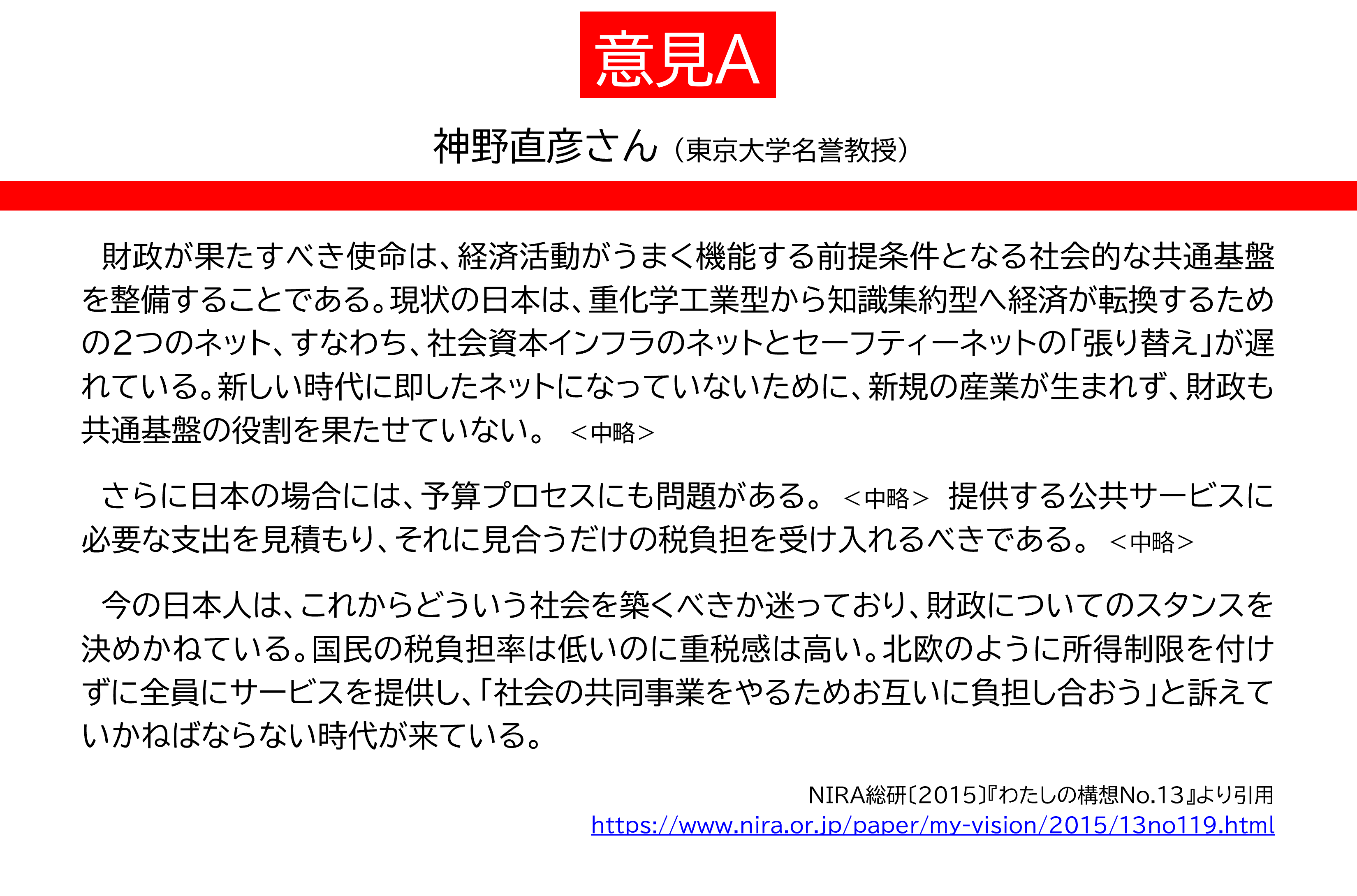 B: 今よりも国や自治体の支出を増やし、行政サービスを手厚くすべきだ