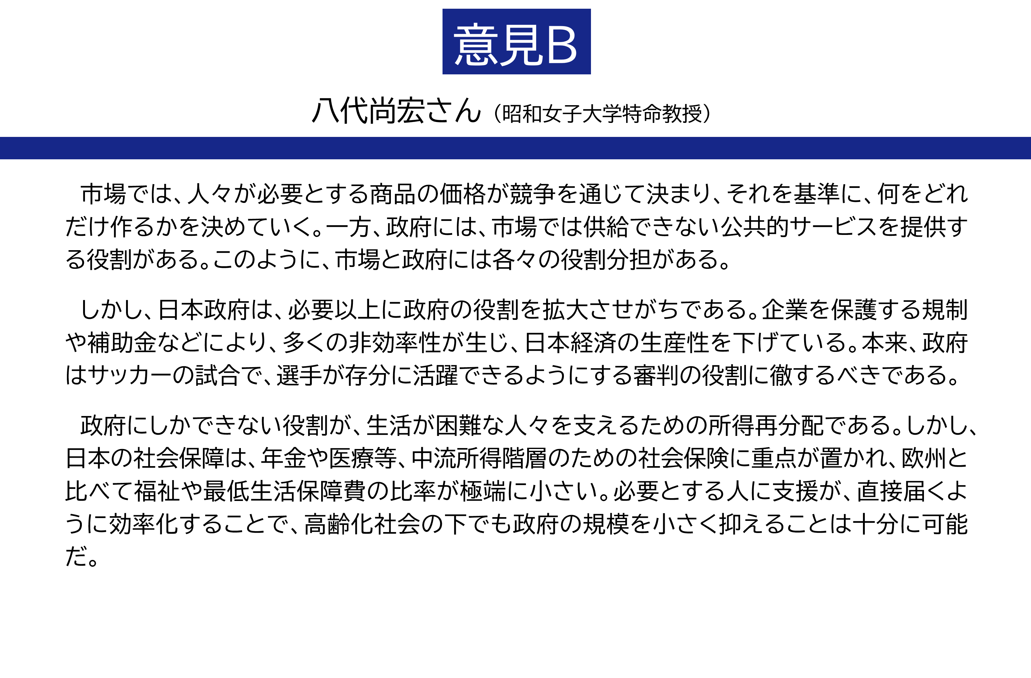 「今後、子育てとか親の介護とかいろいろなことがある。高齢になったときを考えると、アメリカのように極端に小さな政府になっていったりしてしまったときに、最低でも今の水準を保つことができるのかっていわれると、小さな政府に突き進むのがいいともいえないのかなと思います。大きな政府、小さな政府の中間もあると思うので、大きい小さいに縛られずに中くらい、テーマによって融通利かせていいとこ取りしてほしい」