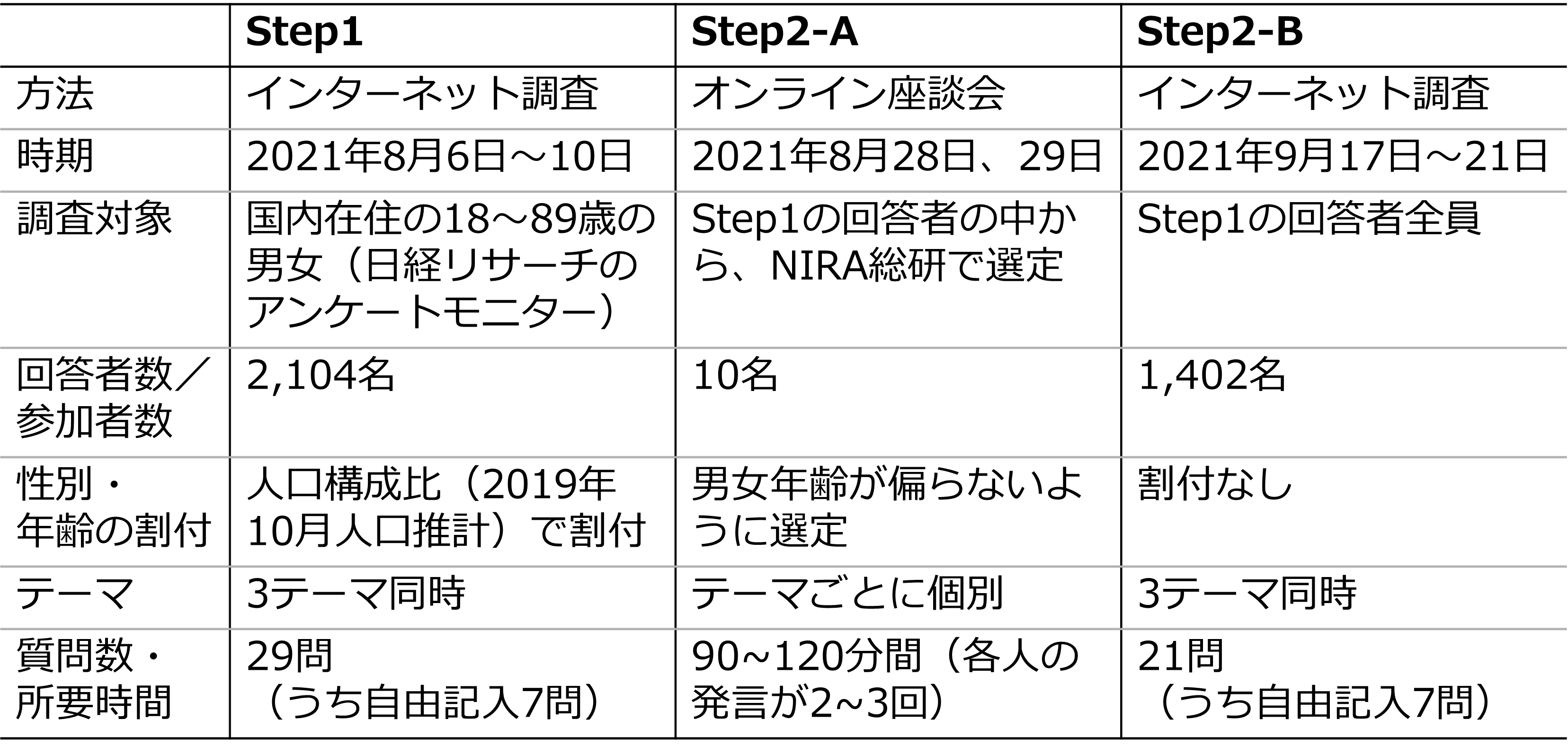 政策上の争点に対し、人々が合意につながるためのプロセスとして、熟議と熟慮の2つの方法が、どのように有効に機能するかを検証することが、本調査の主な目的となる。その検証のため、調査は以下の3ステップに分けて実施した。