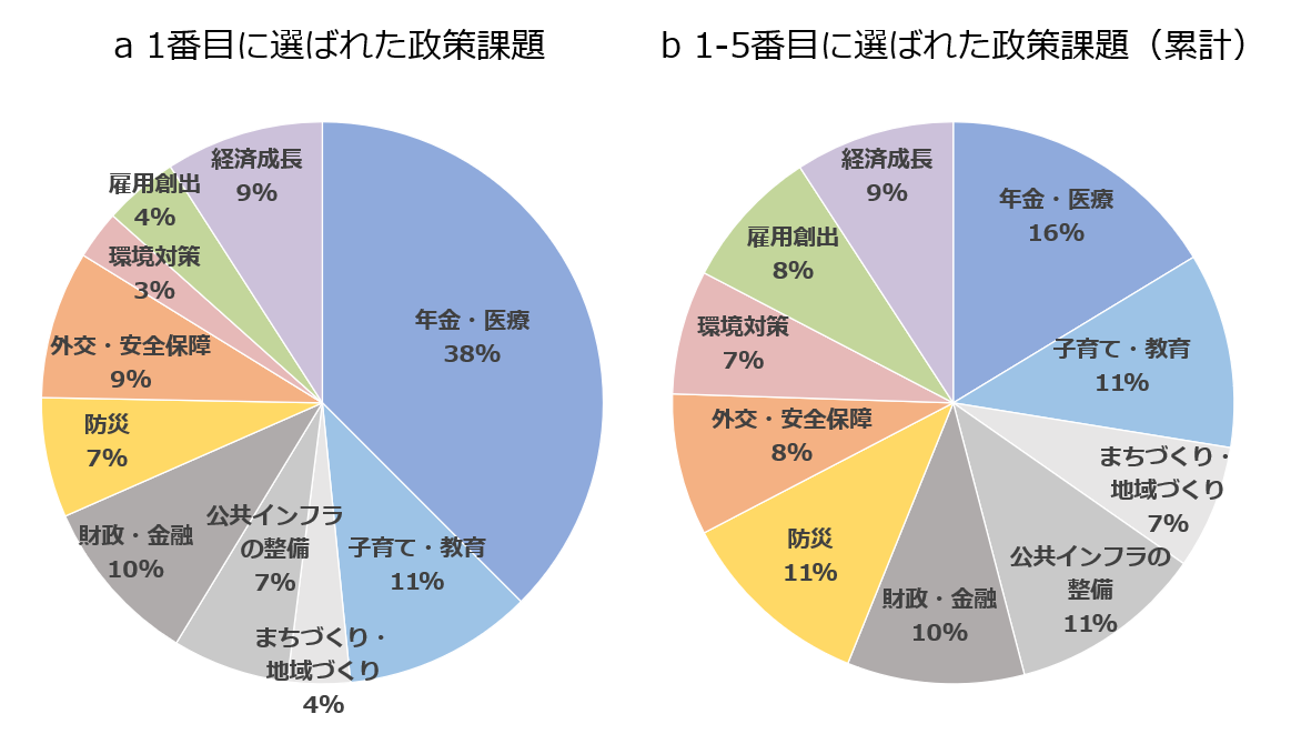 Step1の調査において、行政が取り組む主な政策課題10テーマについて、大切だと思う順に5つ選択してもらった。その結果を図表4に示す。1番大切だと思う政策課題では、4割近くの人が「年金・医療」を選び、次いで「子育て・教育」が多く選ばれており、社会保障への関心が高いことが分かった。1番目から5番目までの累計でも、「年金・医療」の割合が1番多いが、10個のテーマに偏りはあまり見られなかった。