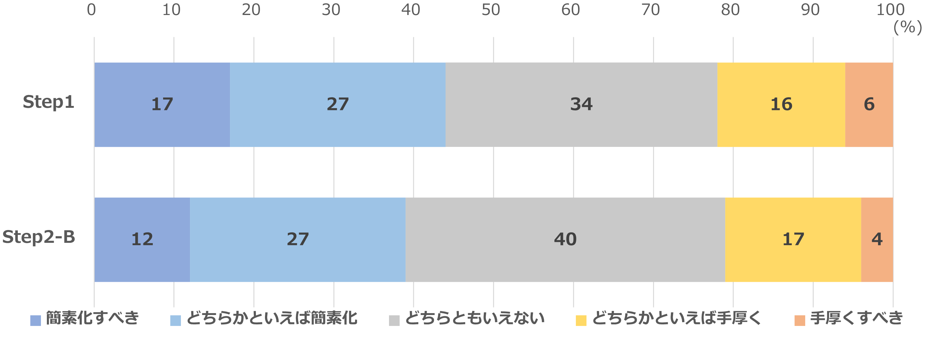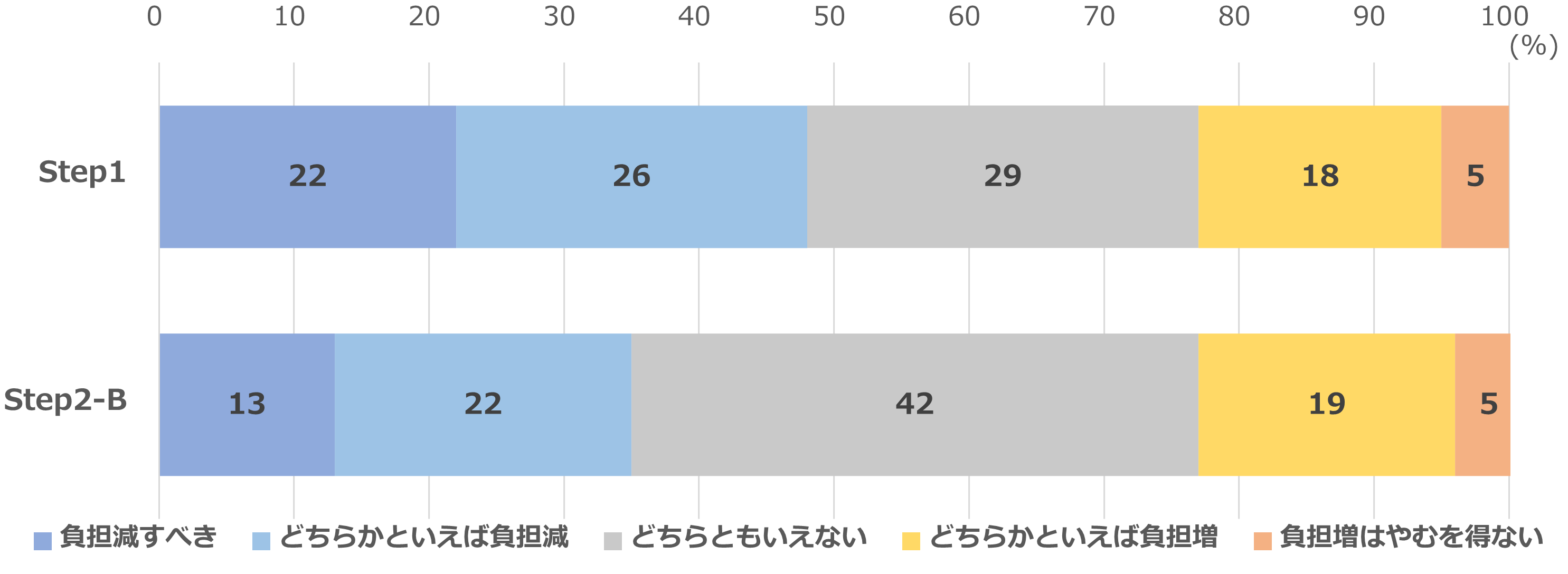 Step1Step2-Bともに、行政サービスは「手厚くすべき」よりも「簡素化すべき」が多い一方、国民負担は「増えるのはやむを得ない」よりも「減らすべき」と考える人が多い結果となった(図表56)。また、熟慮の前後、すなわちStep1からStep2-Bへの変化を見ると、多数派である行政サービス「簡素化すべき」と国民負担「減らすべき」が減った。ただし、行政サービス「手厚くすべき」と国民負担「増やすべき」はほぼ横ばいであり、代わりに「どちらともいえない」が増加した。「どちらともいえない」という回答は、しばしば何も考えていない人という印象を与えがちだが、むしろ、自分とは異なる立場の論考を読み、熟慮することで、立場を決められなくなった人もいるということが分かる。