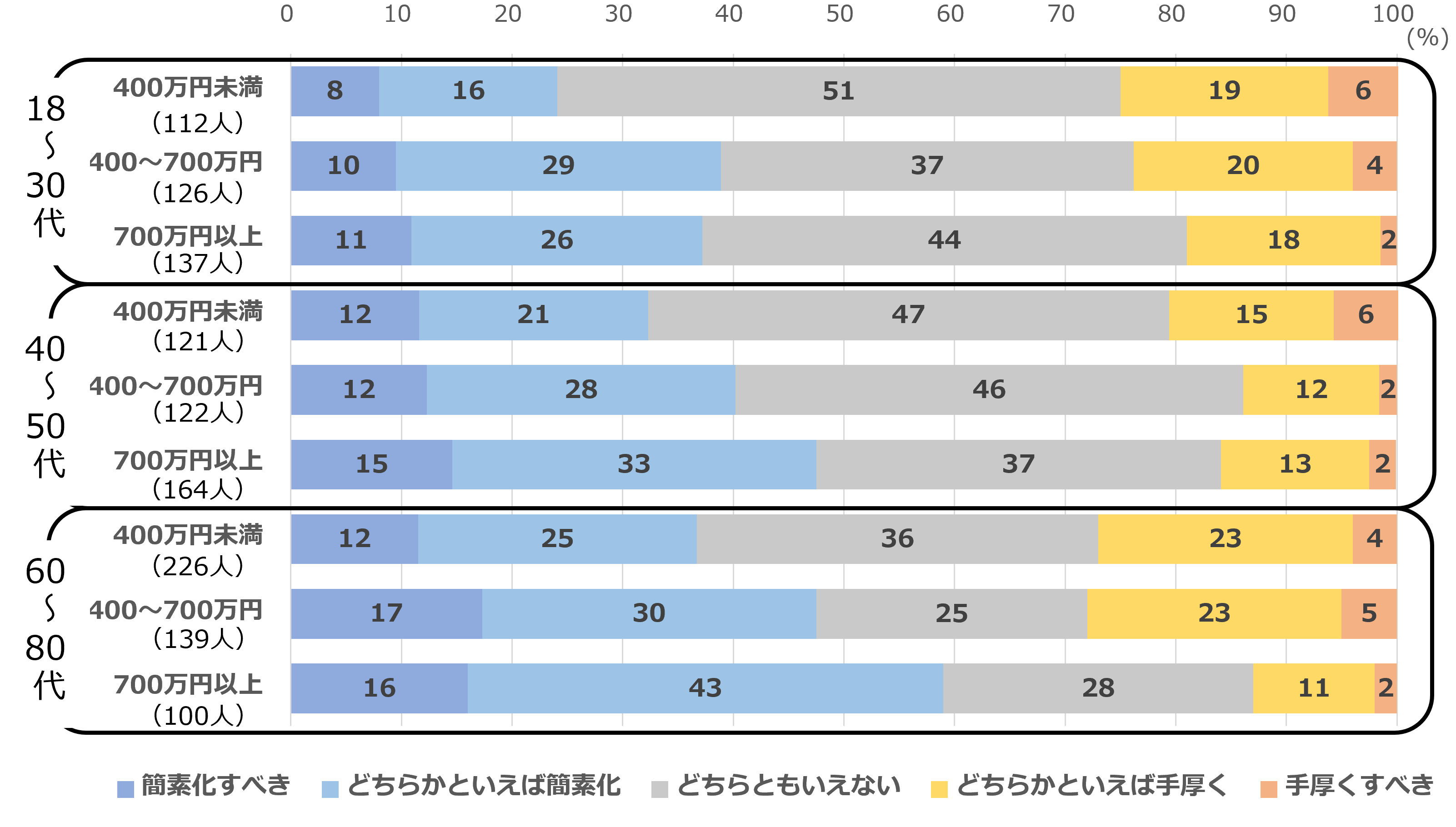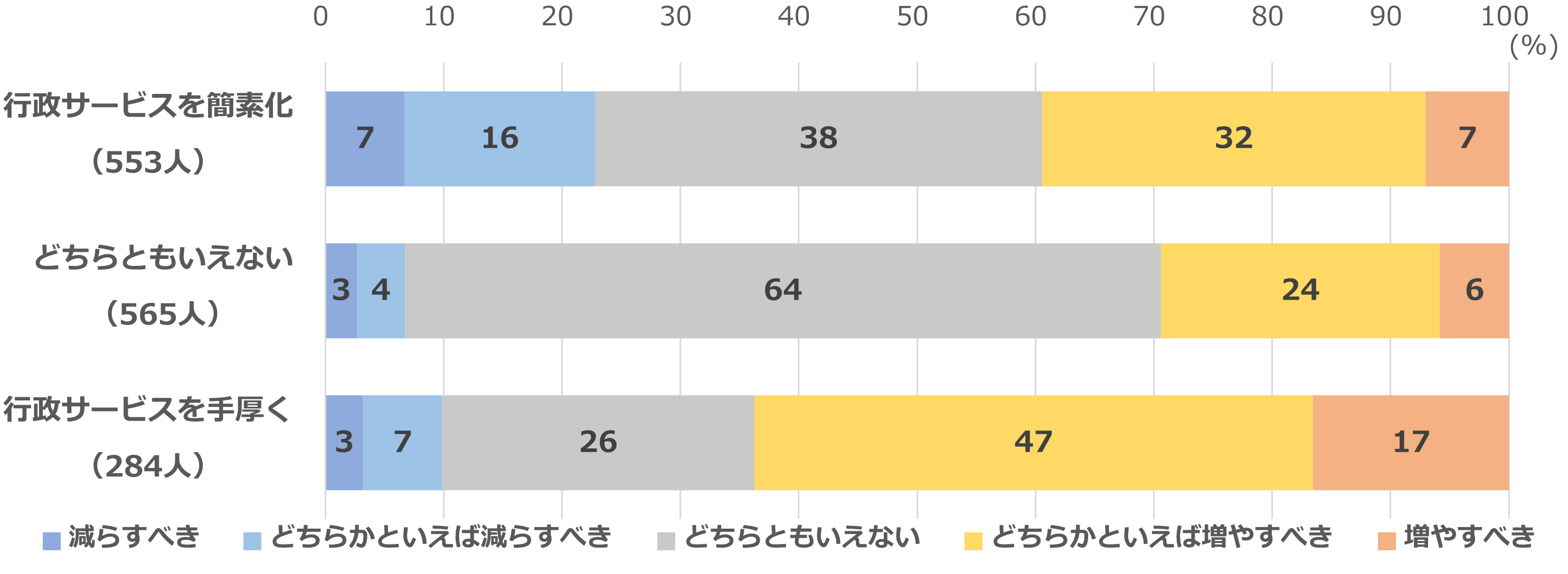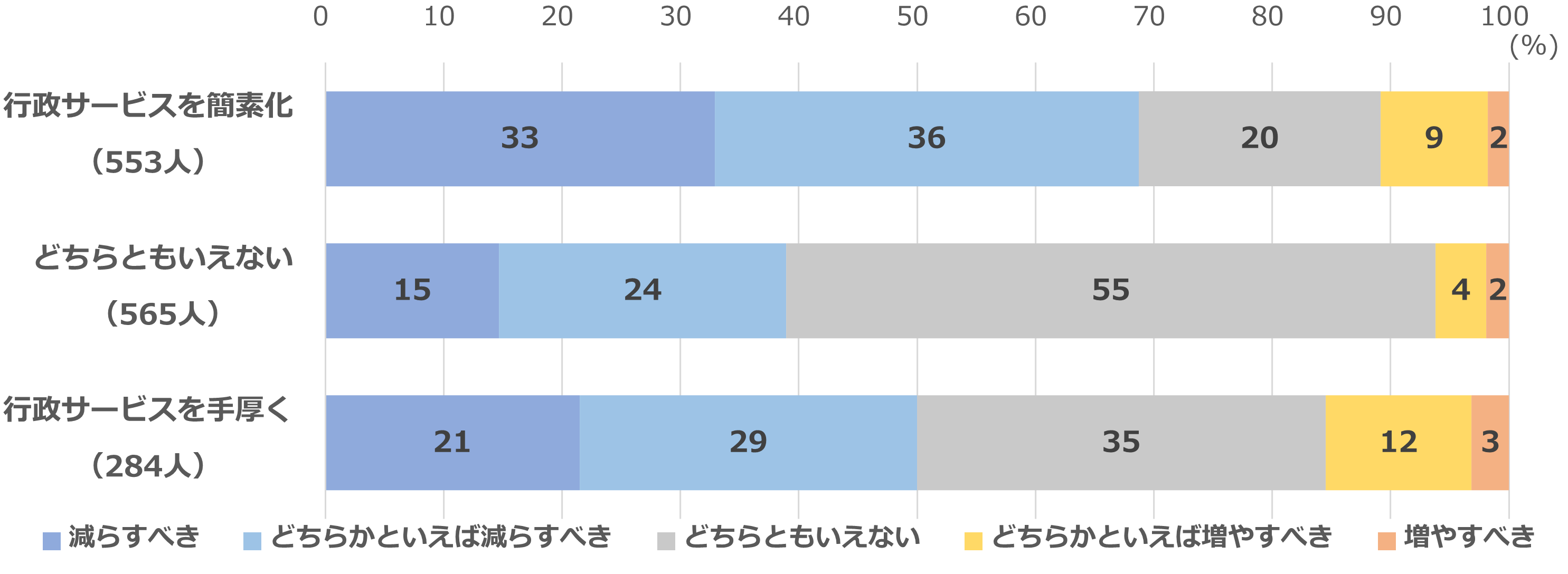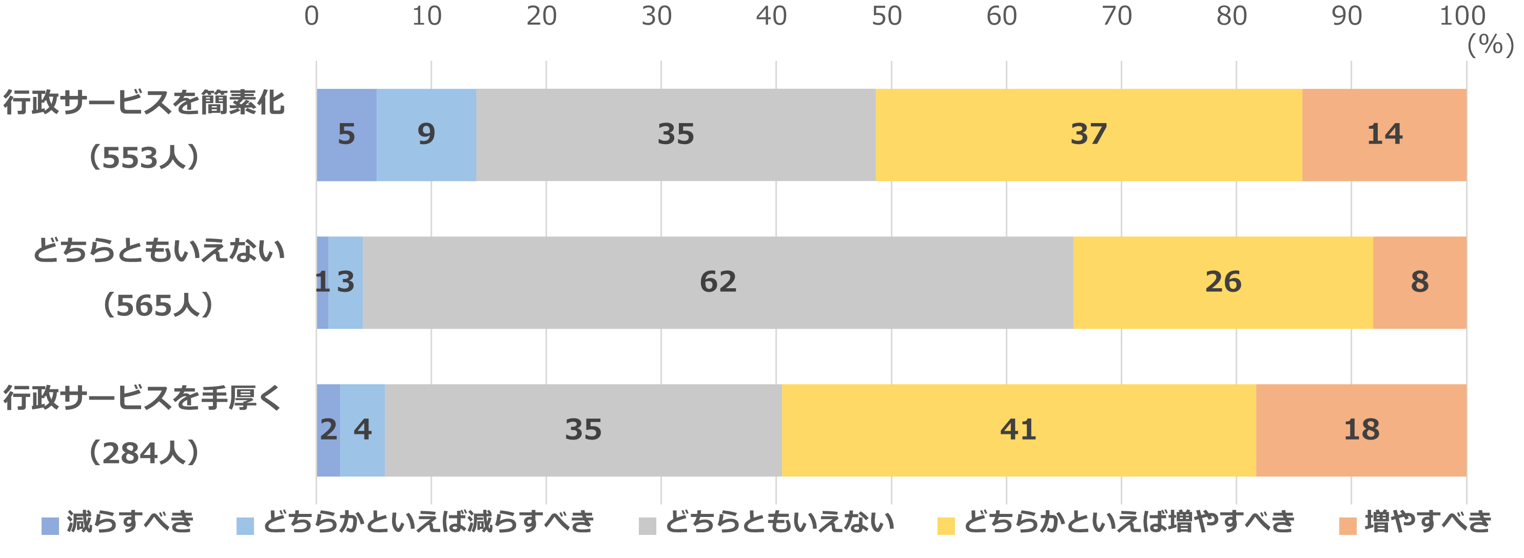 これら3つの費用項目に対する回答を、行政サービス全体に対する意見別に見てみる(図表101112)。行政サービスを簡素化すべきだと考えている人の多くも社会保障費と教育費については増やすべきだと答えており、逆に行政サービスを手厚くすべきとしている人でも、人件費は減らすべきという回答が約半数を占めている。このことから、行政サービスを簡素化するか/手厚くするかと質問するときと、社会保障費や教育費、行政の人件費などの具体的な項目を挙げて減らすか/増やすかを聞いたときとで、イメージする内容が異なっていることがうかがえる。行政サービスを簡素化すべきと考えていても自分や周りの人が享受できる社会保障や教育は減らしてほしくないし、手厚い行政サービスを望んでいても公務員は増やさなくても良いというのが人々の声なのである。