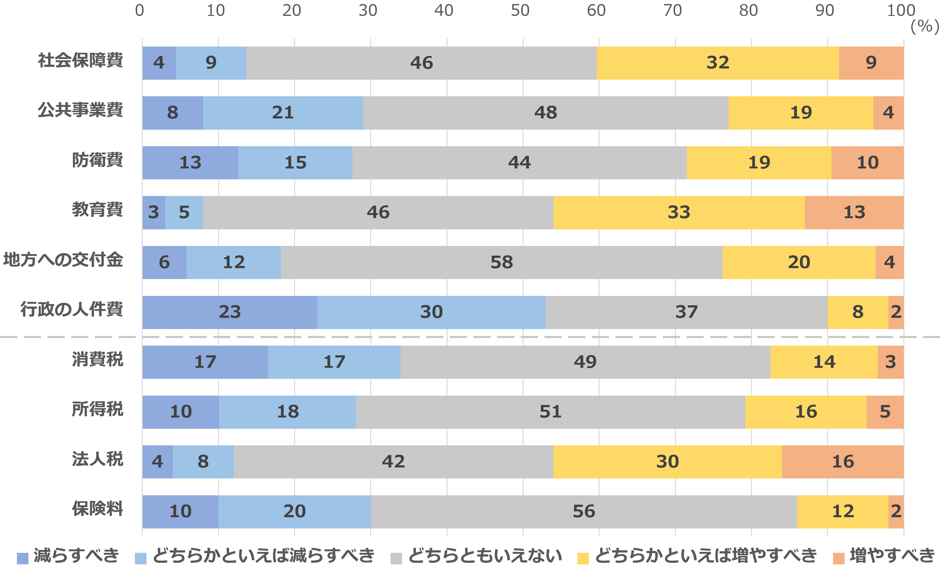 Step2-Bにおいては政府支出や国民負担に関する10の項目について、それぞれ減らすべきか増やすべきかを聞いた。図表9にその結果を示す。