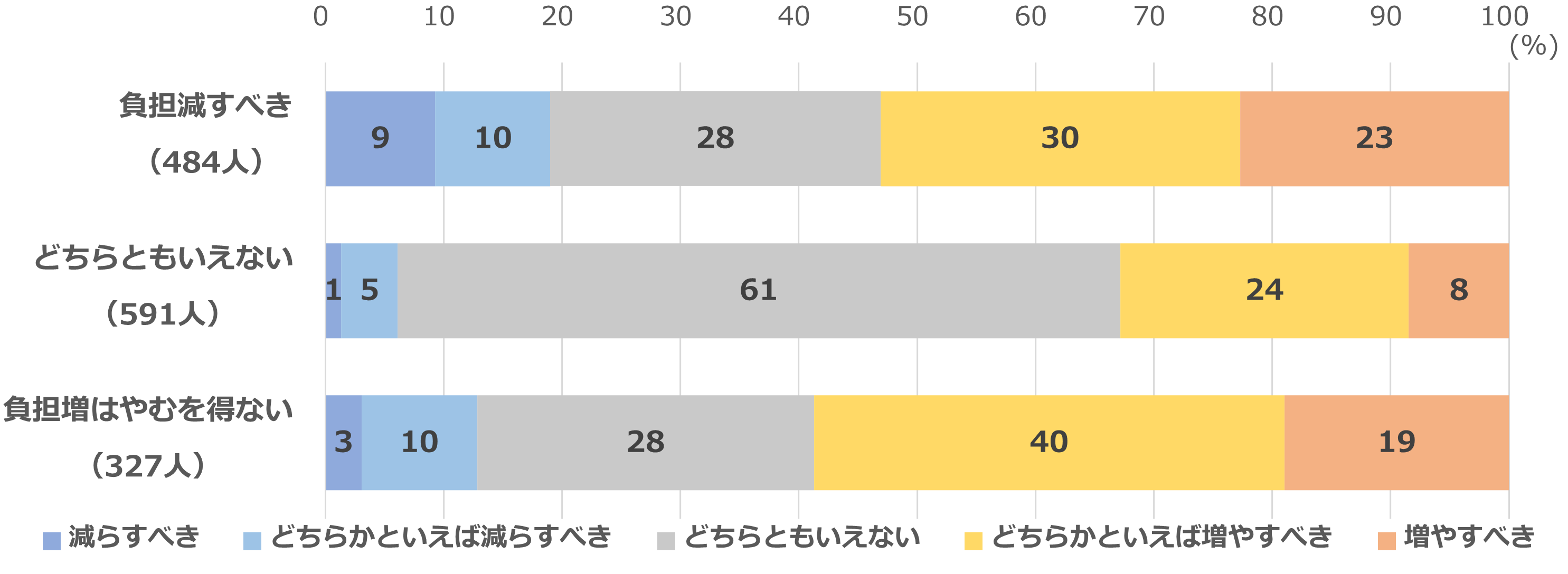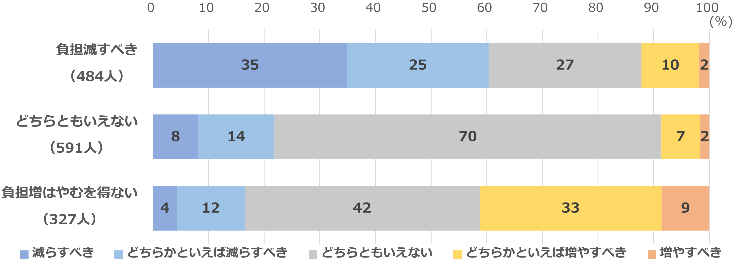 国民負担について、消費税に対する回答を、国民負担全体に対する考え別に見てみると、負担全体を減らすべきという人は、消費税も減らすべきという回答が、増やすべきという回答を大きく上回るが、全体的な負担増をやむなしという人の間では、消費税を増やすべきと考える人が、減らすべきよりも多くなっている(図表13)。同様の傾向が、所得税、保険料についても見られた。これらの項目は、多くの人が直接支払っているものであるため、国民負担全体に対する考えとリンクしやすいといえるだろう。