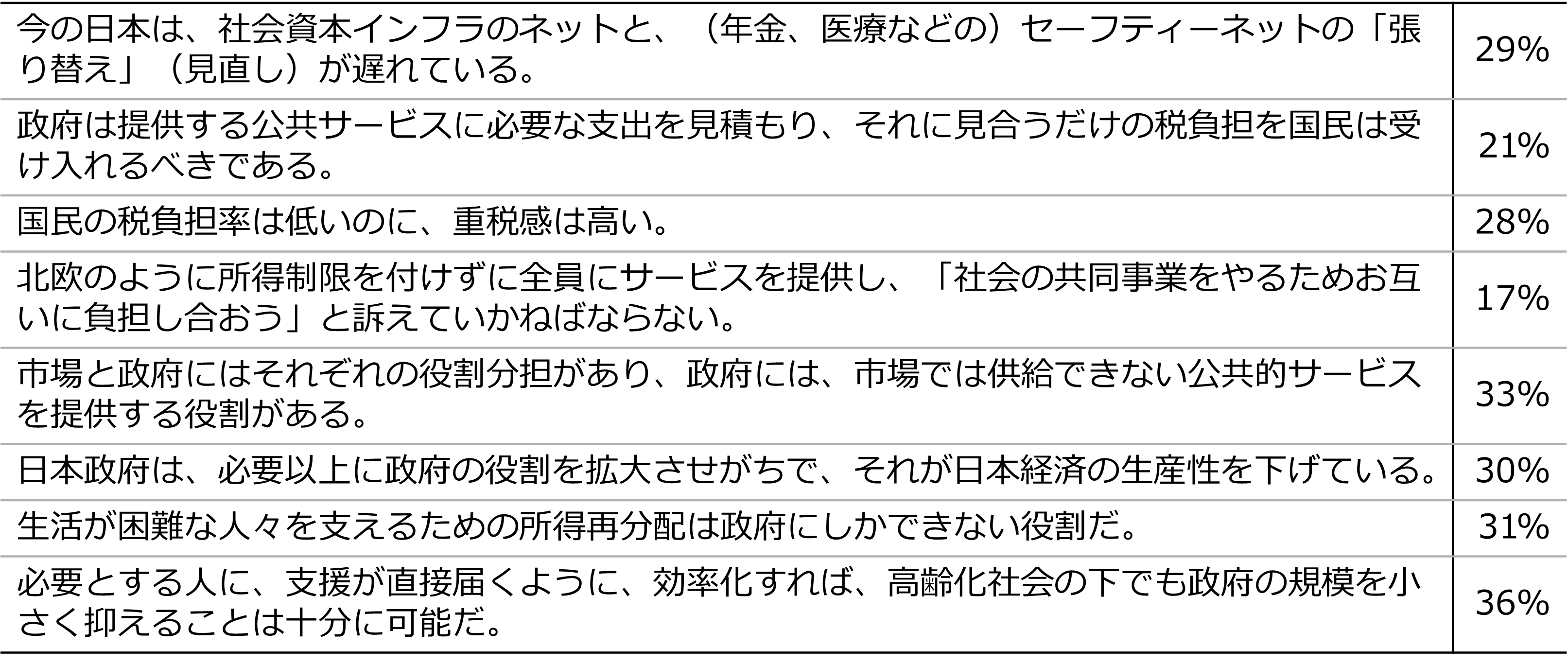 このうち、後期高齢者の医療費窓口負担引き上げに関する調査については、川本(2022)にて報告した。ほか3テーマについても、同一のアンケート調査において実施した。本稿では、残る3テーマのうち、政府規模と国民負担に関する部分について報告する。