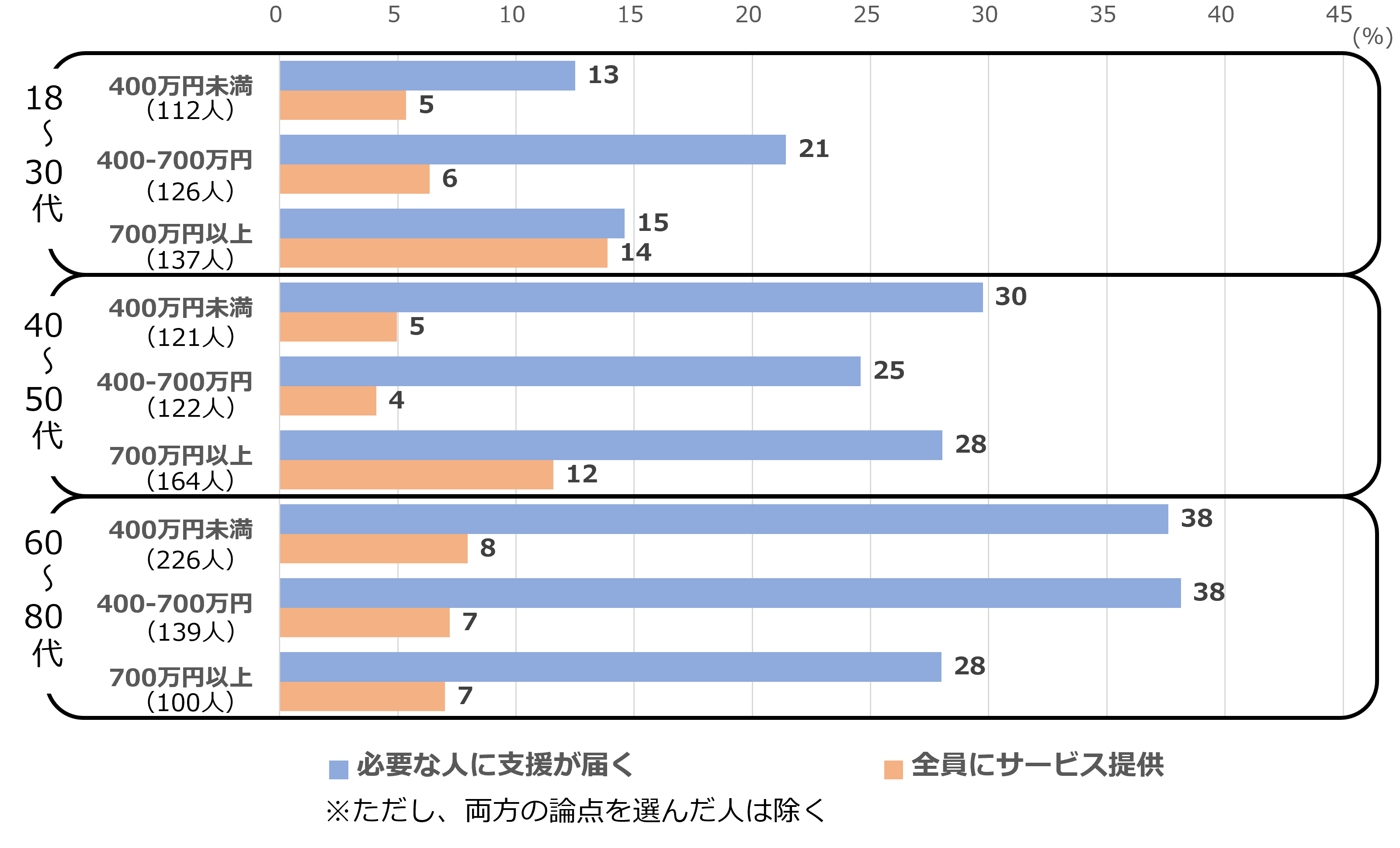 では、この2つの論点を選んだ人々の属性には、どのような違いがあるのだろうか。年齢・世帯年収別に選んだ論点を比較してみる(図表16)。なお、2つの論点を両方とも選んだ人は、どちらをより支持しているか不明なため、分析から除いている。どの年齢・年収層においても、「必要な人に支援が届く」を選ぶ人の方が、「全員にサービス提供」よりも多い。