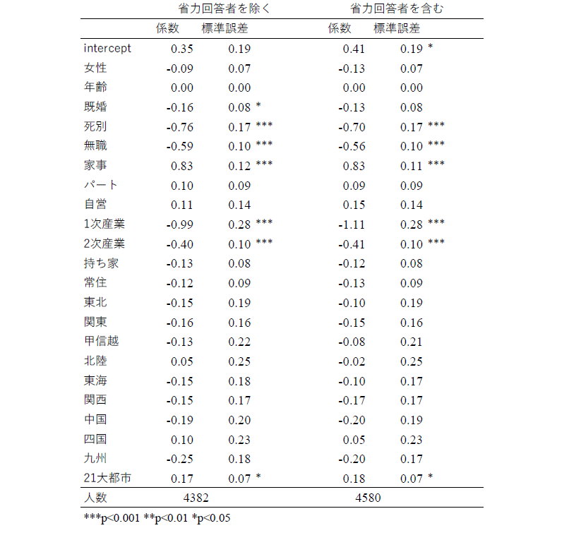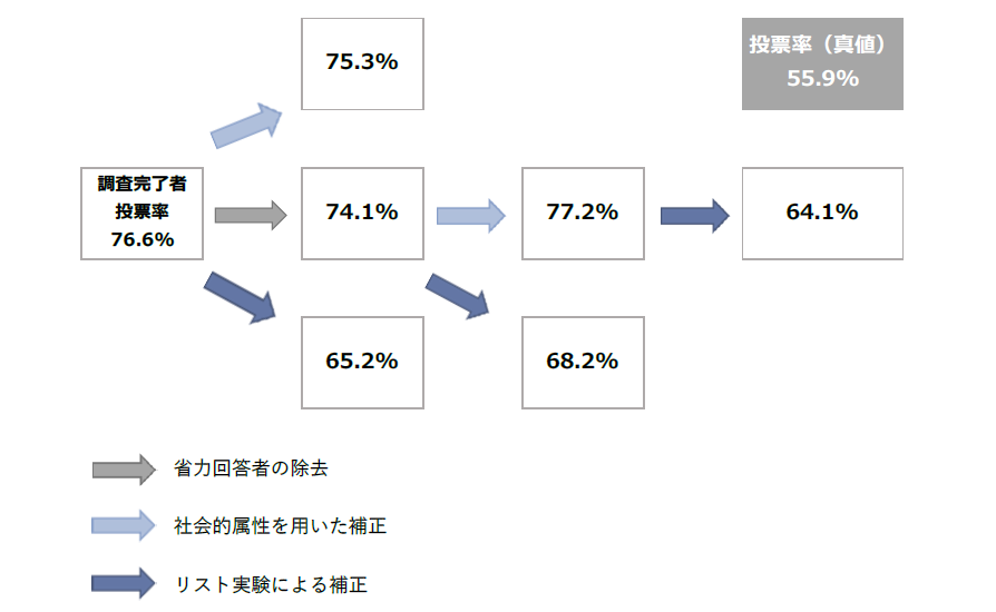 論文NIRAワーキングペーパーNo.5 2022.06.07 社会調査における投票率のバイアス この記事は分で読めます シェア Tweet 谷口将紀 NIRA総合研究開発機構理事長/東京大学大学院法学政治学研究科教授 大森翔子 NIRA総合研究開発機構研究コーディネーター・研究員 概要 社会調査の手法は、人々の生活様式、社会情勢の変化に合わせて多様化してきた。特にインターネット上で回答を行うインターネット調査の登場は、その利便さによって社会調査のスタンダードな方法を変えつつある。本稿では、社会調査における投票率(投票したかどうか)を取り上げ、インターネット調査において投票率を測定するときにどのようなバイアスが考えられるのかを考察した後に、2021年衆院選時に実施したインターネット調査データを用いて、サンプリングバイアス、省力回答者バイアス、社会的望ましさバイアスの補正を試みた。分析の結果、インターネット調査で計測した投票率は、社会的属性によるバイアスよりも社会的望ましさバイアスによって大きく歪められていることが分かった。3種類のバイアスを補正した場合でも測定誤差の4割が埋めきれておらず、非回答バイアスを含む未計測のバイアスの存在が示唆される。 PDFで読む (920.6KB) INDEX 1.はじめに 2.バイアスの可能性 3.検討方法 4.分析結果 4-1.サンプリングバイアスの補正 4-2.省力回答者バイアスの補正 4-3.社会的望ましさバイアスの補正 4-4.複数の方法を組み合わせた補正 5.結論と含意 付録 回帰分析における変数の定義 図表表1 傾向スコアを算出するロジスティック回帰分析表2 リスト実験の結果(調査完了者全員)図3 分析結果のまとめ 1.はじめに 社会調査は、人々の意識を数字として可視化する重要なツールである。その手法は人々の生活様式、社会情勢の変化に合わせて、「従来型調査」とも称される訪問面接調査や郵送記入式調査から、インターネット上で回答を行うインターネット調査の登場と多様化してきた。 社会調査の手法としては比較的新しいものとして捉えられるインターネット調査であるが、従来型調査と比較してその利点は多く存在する。中でも迅速性は大きな利点である。インターネット調査であれば、調査票の作成から回収まで、数時間で完結することも可能だ。例えば選挙期間中の世論調査(そして当選予測)など、結果を知るまでのスピードを優先する調査では、インターネット調査が強みを発揮する。 ほかにも、インターネット調査の強みは存在する。それはセンシティブな項目への回答のしやすさである。調査員に対して口頭で回答を伝えるタイプの訪問面接調査では回答をためらい、ときとして虚偽の回答をしてしまうような質問──例えば、宗教、性的志向、病歴、社会的に広く受け入れられているとは言えない価値観──についても、(モニター型)インターネット調査では回答者は調査者と会うことも、氏名を知られることもなく、好きな時間に、好きな場所で回答できることから、正直な回答を促しやすい、とされる。日本学術会議社会学委員会Web調査の課題に関する検討分科会(2020)は、この点をインターネット調査(Web調査)の強みとして挙げ、活用するべきだとしている。 しかし、実際のところ、インターネット調査はセンシティブ項目における正直な回答を促しているだろうか(注1)。社会調査において、上記の例に加えてセンシティブな項目とされることが多いのは、政治的な態度や行動である。学校教育に限らず、選挙で棄権することは好ましくないという社会的規範が存在する中で、調査で選挙に行ったか(行かなかったか)を問うのは「センシティブ」である。面接調査と比べれば回答しやすいとは言え、村上(2017)によれば、2017年衆議院選挙時のインターネット調査会社モニターを対象とした調査において、「投票に行った」との回答が72.3%であった(注2)。実際の投票率は総務省の発表で53.7%であったから、20パーセントポイント近く高い数値が示されていることになる。 NIRA総研では、インターネット調査における代表性──調査データが想定する母集団を正確に反映しているのか──のバイアスについて検討を行ってきた。本稿では、インターネット調査における「投票率(注3)」に着目して、そこに含まれるバイアスの原因を検討する。 2.バイアスの可能性 社会調査にバイアスは不可避としても(大隅、2002など)、投票参加、特にインターネット調査における投票率には、どのようなバイアスがあるだろうか。以下4種類のバイアスを取り上げよう。 (1)サンプリングバイアス サンプリングバイアスは、調査における目標母集団と回収された標本の体系的な誤差を指す(萩原、2009)。調査手法によって、目標とする母集団における分布と回収したデータにおける分布が乖離する。性別や年齢などの基本的属性において、その誤差がしばしば確認される。 NIRA総研では、国勢調査の質問項目を中心に、面接調査やインターネット調査に含まれるサンプリングバイアス