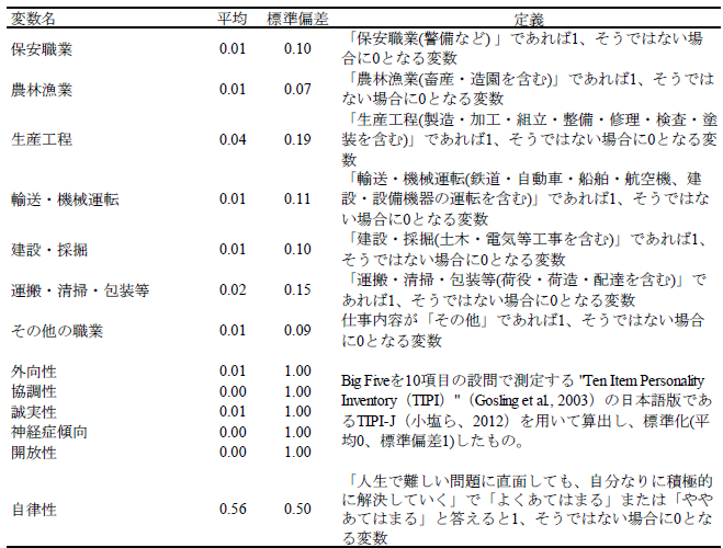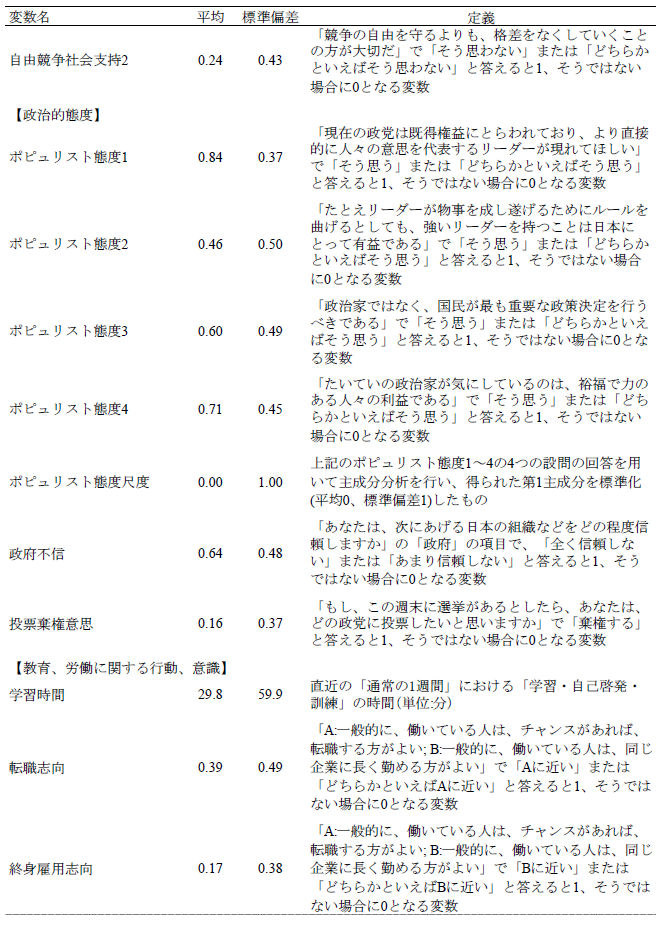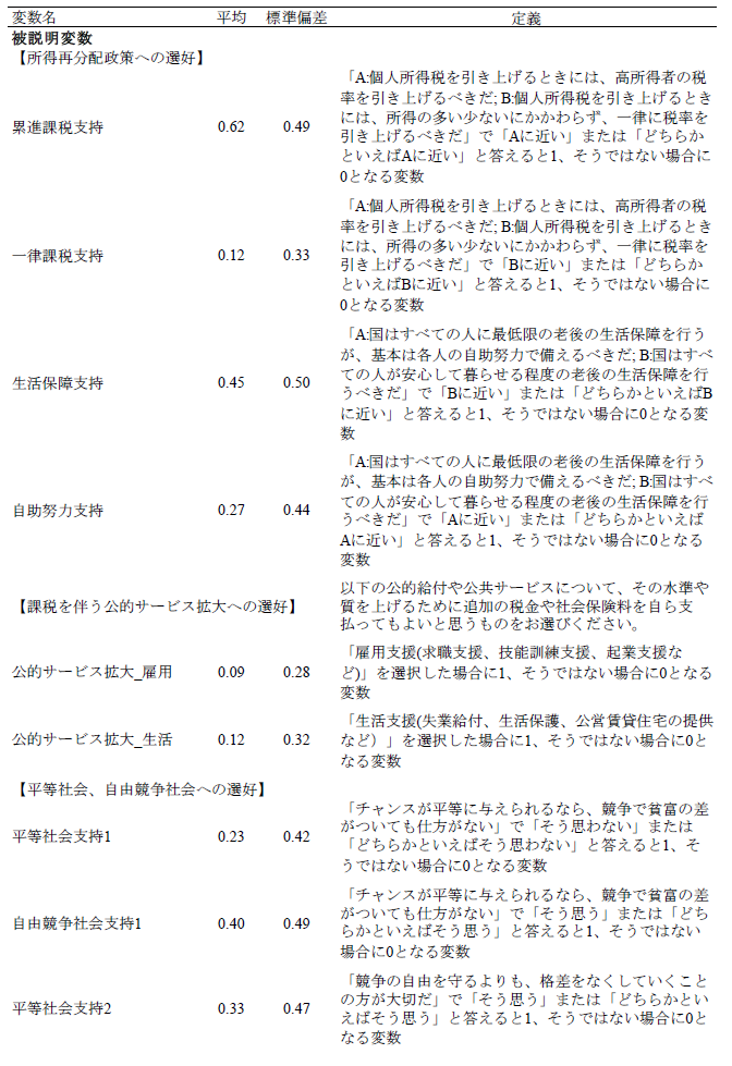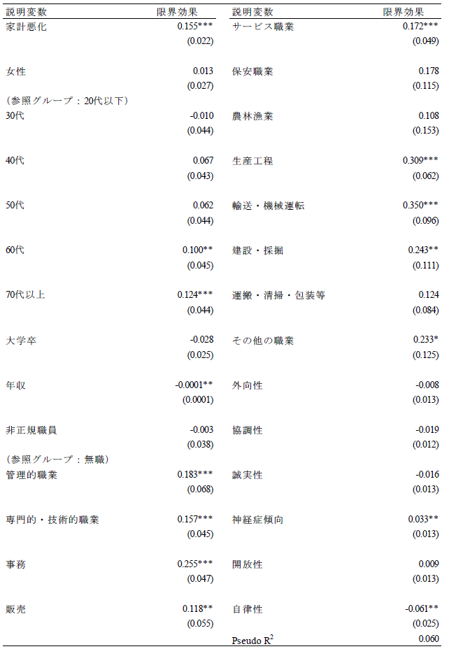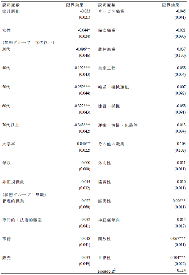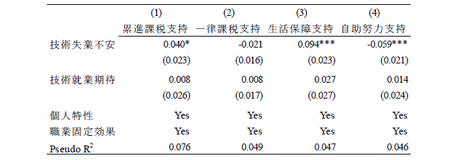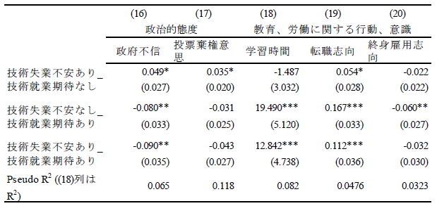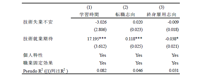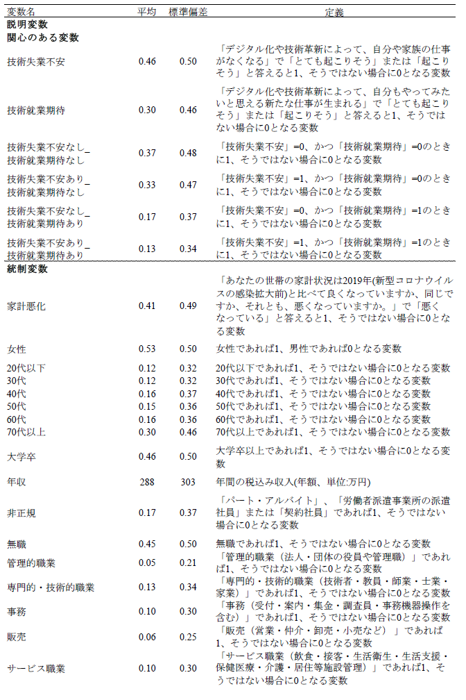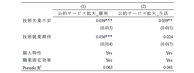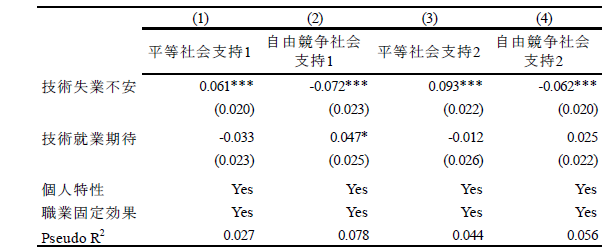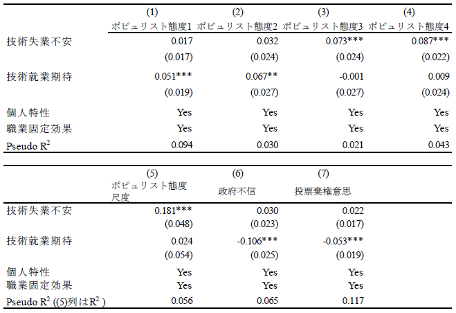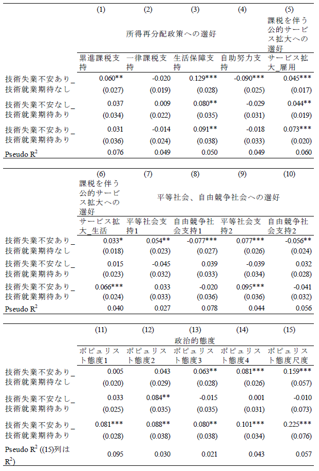 論文NIRAワーキングペーパーNo.6 2023.10.31 技術革新と政策需要との関連性失業不安と就業期待に着目して この記事は分で読めます シェア Tweet 井上敦 NIRA総合研究開発機構主任研究員 概要 本稿では、技術革新による失業不安(「技術失業不安」)、および就業期待(「技術就業期待」)に焦点を当て、これらと政策選好、政治的態度、教育および労働に関する行動や意識の関係を分析した。「第1回政治・経済・社会に関する意識調査(NIRA基本調査)」を用いて分析したところ、技術失業不安を抱く人は46%である一方、技術就業期待を有する人は30%に留まることがわかった。また、技術失業不安を抱く人は所得再分配、雇用支援および生活支援に関する公的サービスの拡大、平等社会を支持し、ポピュリスト態度が強い傾向が確認された。一方で、技術就業期待を有する人は雇用支援に関する公的サービスの拡充、機会均等の原則に基づく自由競争社会を支持し、学習時間が長く、転職志向があり、政府不信や投票棄権意向が弱い傾向が見られた。これらの分析結果に基づき、技術革新が生み出しうる政策需要とその対応について論じた*。 PDFで読む (1.2MB) INDEX 1.技術的失業がもたらす政情不安 2.データ 3.推定結果 3-1.技術失業不安、技術就業期待の決定要因 3-2.技術失業不安、技術就業期待と政策選好、政治的態度、教育や労働に関する行動や意識との関係 3-3.異質性 4.結論 図表表1 記述統計表2 技術失業不安の決定要因表3 技術就業期待の決定要因表4 技術失業不安、技術就業期待と所得再分配政策への選好との関係表5 技術失業不安、技術就業期待と課税を伴う公的サービス拡大への選好との関係表6 技術失業不安、技術就業期待と平等社会、自由競争社会への選好との関係表7 技術失業不安、技術就業期待と政治的態度との関係表8 技術失業不安、技術就業期待と教育、労働に関する行動、意識との関係表9 異質性 1.技術的失業がもたらす政情不安 「いま、世界は新しい病にかかっているのであり、聞いたことがなかった病名だという読者が多いだろうが、今後何年かに頻繁に聞くことになるだろう。技術的失業というのがその病名である。」(J. M. ケインズ『孫の世代の経済的可能性』山岡洋一訳) これは大恐慌のさなか1930年にジョン・メイナード・ケインズが書いたエッセイ“Economic Possibilities for our Grandchildren”の一節である。ここでケインズは技術的失業の概念を提示し、これが一時的な不適応の段階にすぎず、むしろ長期的には人々の生活水準が大幅に向上すると予測した。それから90年たった現在、技術進歩を通じて経済は著しく成長し、人々の生活は豊かになった。しかし一方で、情報技術の急速な発展による「第4次産業革命」と呼ばれる経済構造の転換に進み、自動化技術による失業や賃金低下への懸念が高まっている。 自動化技術には労働を減らす効果と増やす効果がある(Acemoglu and Restrepo, 2019)(注1)。これらの影響の程度は、技術の特性や労働市場などの経済構造に依存する。このため、実証研究の蓄積が俟たれるが、既存の実証研究では国や地域よって結果が一貫しておらず、明確なコンセンサスが形成されていない(注2)。 しかしながら、メディアなどで見られる世間一般の議論は、自動化技術が仕事を増やすことへの期待(「技術就業期待」、以下同)よりも、仕事を奪うことへの不安(「技術失業不安」、以下同)に大きく偏っているように思われる(注3)(注4)。自動化技術による技術的失業を楽観視することはできないが、悲観論が行き過ぎると、政情不安が生じ、新技術の社会受容が阻まれる恐れもある。歴史的には、19世紀の産業革命期、イギリスでラッダイト運動が起き、力織機に仕事を奪われた手織工などが機械を打ち壊した(注5)。欧州を対象にした近年の研究では、自動化技術による失業リスクに晒されると急進右派政党への投票行動を強めることが明らかになっている(Aneli et al., 2021; Caselli et al., 2021; Im et al., 2019)(注6)。2016年の米国大統領選挙においては、自動化技術の影響を受けやすい地域ほど経済ナショナリズムの政治方針を掲げたドナルド・トランプ氏への支持率が高いことが明らかにされている(Frey et al., 2018)(注7)。日本もこうした社会動向と無縁ではない。谷口(2018)はAIの発達が自分の暮らしを脅かすと認識している人ほど、政治に強い不信感を持っていることを明らかにした。これらの先行研究からは、自動化技術は人々の技術失業不安を介して、政策や政治への選好に影響を与え、政情不安を生む要因となることが示唆される。 技術革新がもたらしうる政情不安を避け、技術革新の恩恵を享受できるかは、技術革新による利益の分配的な帰結に対して、政府が適切に対応できるかに大きく左右されるように思われる。有効な策を講じるためには、技術失業不安を有する人々の特性や政策需要を理解する必要がある。具体的には、人々は技術失業不安を認識した場合、失業や賃金低下のリスクから身を守るために、所