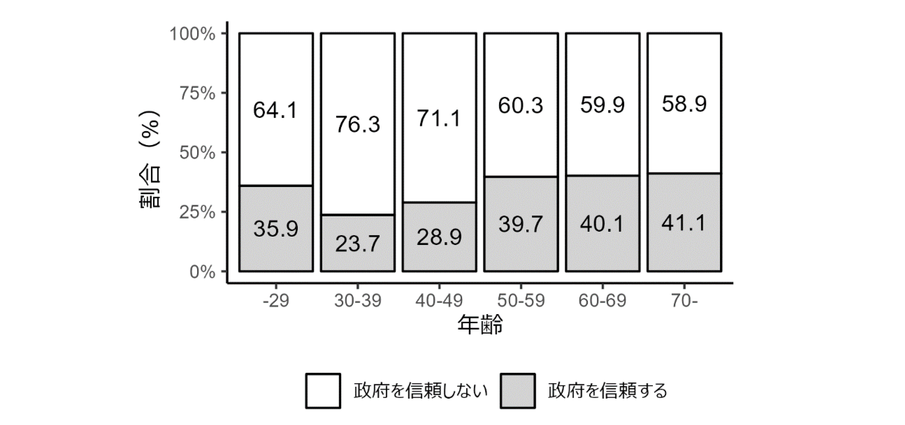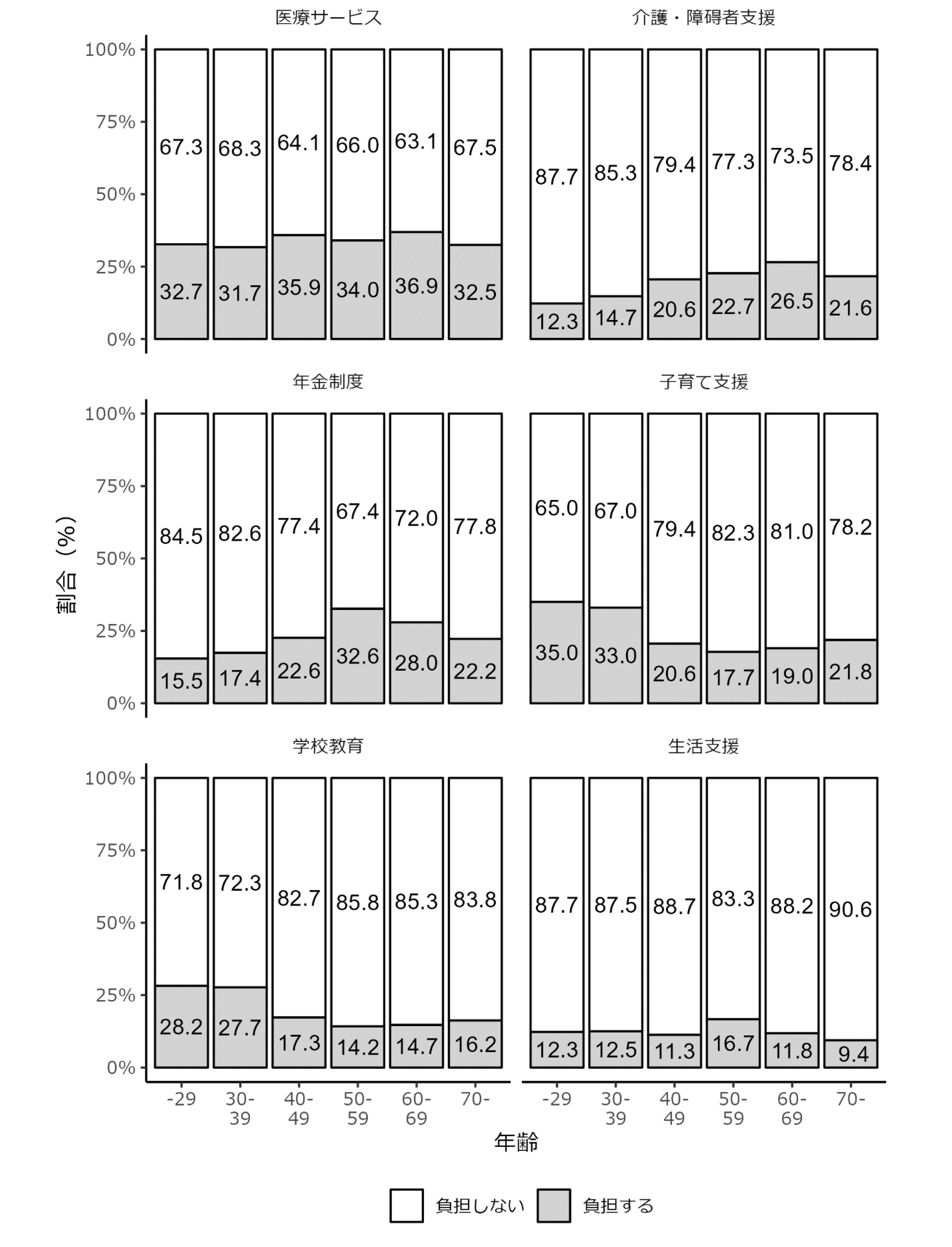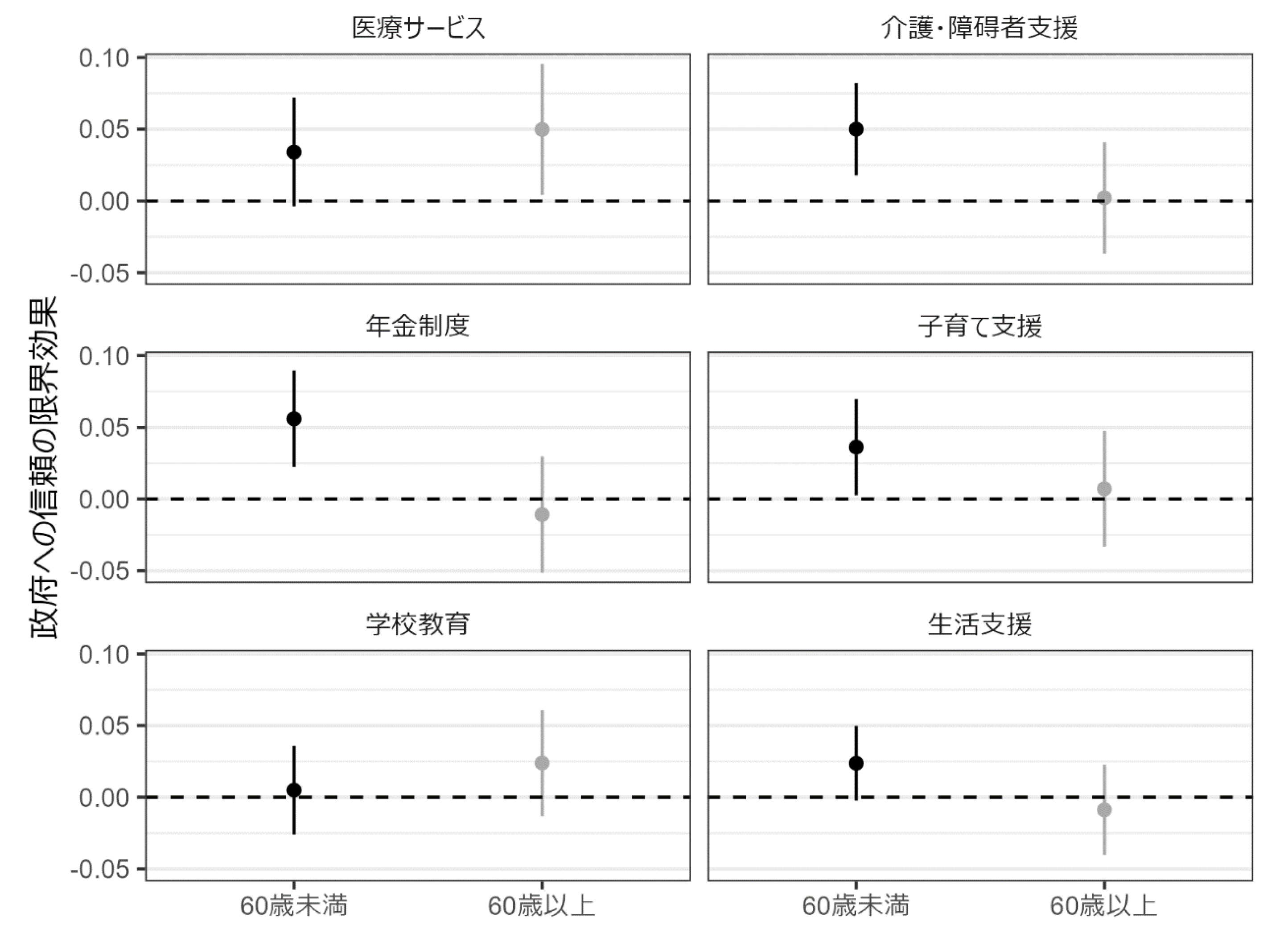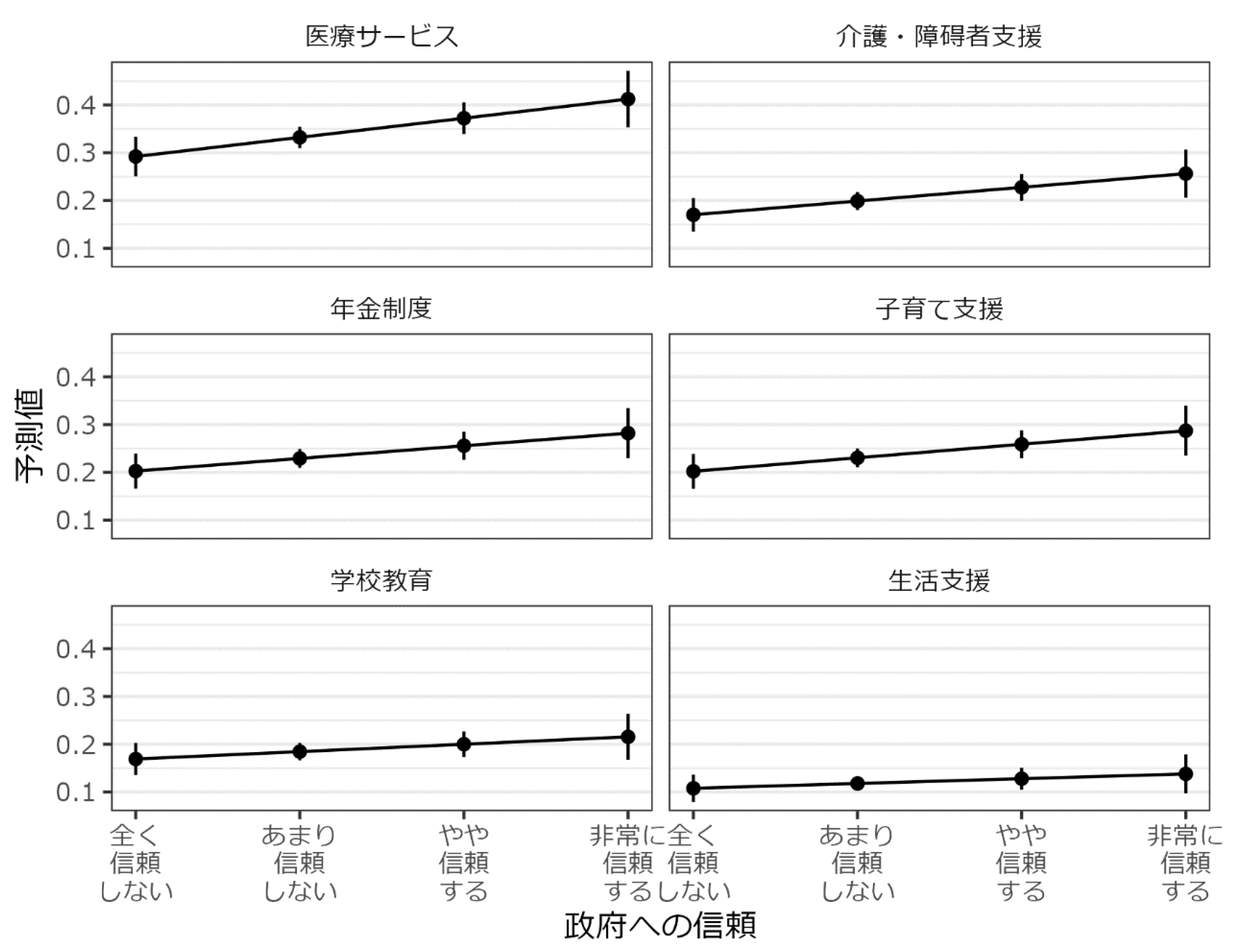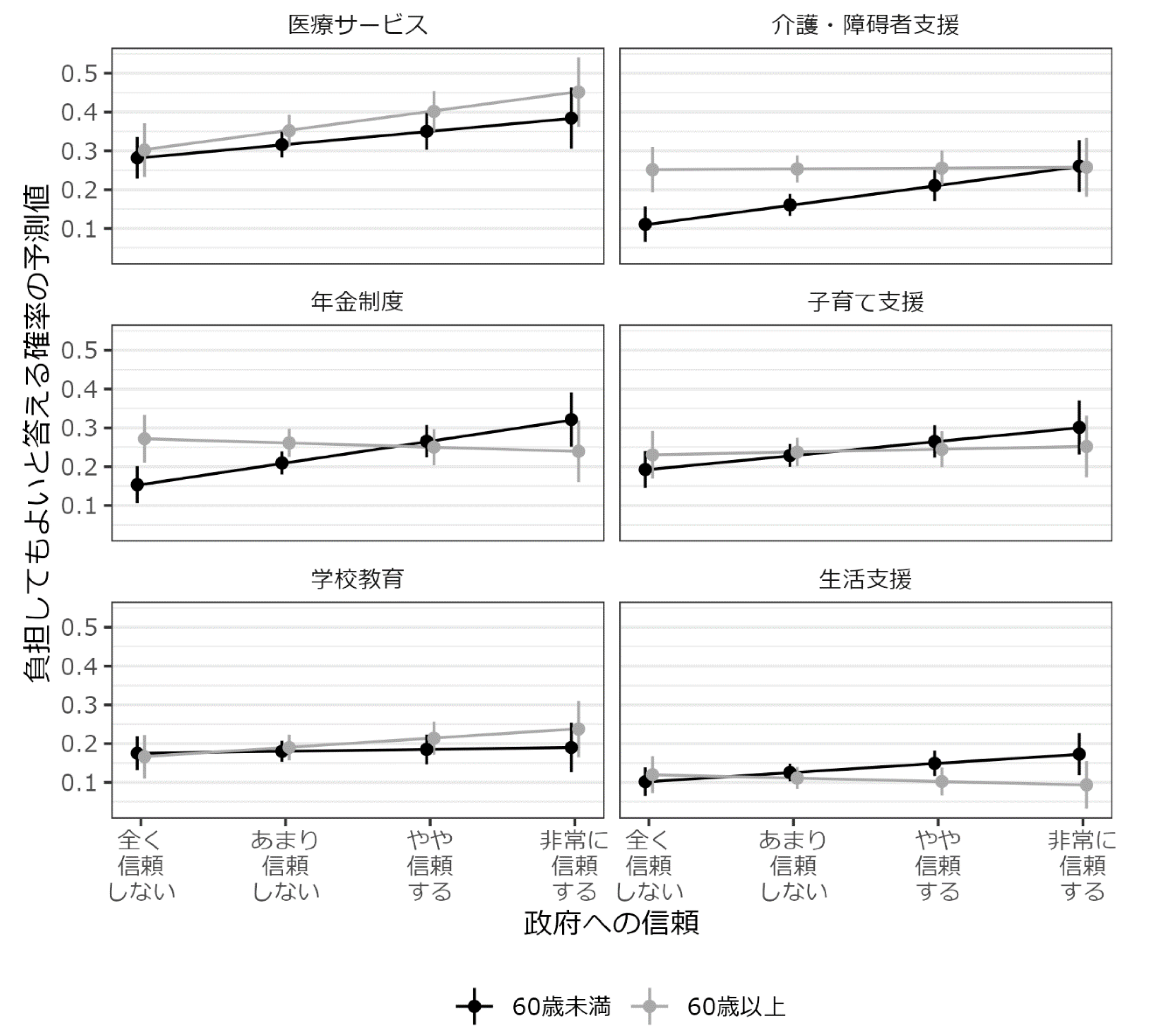 論文NIRAワーキングペーパーNo.7 2024.05.01 受益と負担をめぐる世代間の分断と政府への信頼 この記事は分で読めます シェア Tweet 竹中勇貴 NIRA総合研究開発機構研究コーディネーター・研究員 概要 政府を信頼する人は、公共サービスのための税や社会保険料といった負担を受けいれやすいと言われることがある。しかし、そのような議論は、ロジックがあいまいで、抽象的な一般論のような形で提示されることも少なくない。本稿は、政府への信頼は無条件に負担の受容につながるわけではなく、政府への信頼と負担の受容の関係は高齢世代よりも現役世代において特に強いことを明らかにした。 実際、2023年の「第1回NIRA基本調査」のデータを分析すると、特に介護や年金の分野で、政府への信頼と負担の受容の関係が現役世代において強く見られた。これらの分野では現役世代にとって給付を受けるのが遠い将来となり、受益の不確実性が高いといえる。それでも今すぐに負担するという意思決定をするためには、政府への信頼が必要となると考えられる。様々な政策が不確実な将来に向けて実施される今日、本稿の知見からは比較的若い世代における政府への信頼を高めることの重要性が示唆される。 PDFで読む (1.6MB) INDEX 1.政府への信頼は重要か? 2.政府への信頼が負担の受容につながるロジック (1)受益の不確実性と政府への信頼 (2)公共サービスごとの受益の不確実性の違い 3.分析の方法 4.負担の受容・政府への信頼と年齢の関係 (1)公共サービスへの負担の受容と年齢の関係 (2)政府への信頼と年齢の関係 5.政府への信頼と負担の受容の関係 (1)年齢を統制した回帰分析 (2)政府への信頼と年齢の交互作用 (3)考察 6.結論 図表図1 負担をしてもいいと答えた人の割合図2 政府を信頼する人の割合図3 政府への信頼と負担してもよいと答える確率の予測値図4 政府への信頼と年齢の交互作用図5 政府への信頼の限界効果の年齢による違い 1.政府への信頼は重要か? 近年の福祉国家は厳しい財政状況の中で財源を調達して様々な公共サービスを実施するという難しい課題に直面しており、日本もその例外ではない。日本は、他の国と比べると福祉の充実度のわりに国民の負担が小さい一方で、負担に対する人々の抵抗感はとりわけ強い国であると言われる(佐藤・古市 2014;持田 2019)(注1)。人々が負担を嫌う以上、世論の支持を求める政治家は人々の負担増を避け、国債発行などによって負担を先送りしようとすることになる。どうすれば人々が負担を受容するようになるかを明らかにする必要性は大きい(安中・鈴木・加藤 2022;高端ほか 2023)。 人々が負担を受容するようになるための方策の1つとして、政府への信頼を高めることが挙げられている(久米ほか 2018;林・伊多波・八木 2015)。日本で政府を信頼する人の割合はOECDの平均よりも低く、政府への信頼は重要な研究テーマの1つとなっている(善教 2013;総務省大臣官房企画課 2006-2010;田中・岡田 2006)。海外の研究でも、政府への信頼を高めることによって、再分配への支持が高まることをはじめ(Macdonald 2021;Peyton 2020)、様々な形で政府に対する人々の意識に影響することが明らかにされてきた(レビューとしてDevine 2024)。 しかし、政府への信頼に意味があるかを一概に論じることは難しい。政府への信頼については、それがどのようにして人々の意識に影響を与えるのかというロジックもあいまいなまま、とにかくポジティブな意義があるのだと、抽象的な一般論のような形で語られることも少なくない。 それに対して本稿は、政府への信頼という概念を詳しく検討することを通じて、政府への信頼と負担の受容の関係の強さは年齢によって異なる可能性を検討する。年金や子育て支援を思い浮かべれば明らかなように、公共サービスへの負担をめぐっては世代によって利害関係が異なり、意識が大きく分断されていることが指摘されている(井手・古市・宮﨑 2016;Vallee-Dubois 2023)。政府への信頼もまた、この世代という分断を踏まえて議論する必要があるのではないか。 以下、第2節では政府への信頼という概念の定義を論じるとともに、本稿で取り上げる公共サービスの種類ごとに、政府への信頼と年齢の関係を仮説的に論じる。第3節では、分析で使う「第1回NIRA基本調査」の概要を説明する。第4・5節では、データを実際に分析してその結果を考察し、最後の第6節で結論を述べる。 2.政府への信頼が負担の受容につながるロジック (1)受益の不確実性と政府への信頼 政府への信頼は、どのようなロジックで負担の受容につながるのであろうか。それを考えるためには、まず政府への信頼とは何かを明確にする必要がある。政府への信頼という概念の定義は様々であるが、本稿では政府への信頼を受益と負担をめぐる人々の損得勘定と結びつけて理解する(Rudolph 2017)(注2)。これは、近年の政府への信頼についての研究では国際的に盛んになっているアプローチである。 政府に限らず一般的な信頼の定義の1つに