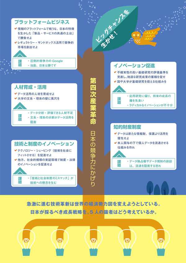 わたしの構想No.32 2017.11.10 第4次産業革命に挑む この記事は分で読めます シェア Tweet かつてないスピードで進む技術革新は、逆転のチャンスでもある。日本が採るべき成長戦略とそこで直面する課題を考える。 PDF(日本語) (1002.4KB) PDF (ENGLISH) (392.1KB) ABOUT THIS ISSUE企画に当たって 第4次産業革命、個の力を引き出せ 誰もが活躍できるビッグチャンスの時代 金丸恭文 NIRA総合研究開発機構理事長/フューチャー株式会社代表取締役会長兼社長グループCEO IoT、ビッグデータ、AIを中心とした急速な技術革新は、第4次産業革命とも呼ばれ、われわれの生活や社会を大きく変える可能性を秘めている。米国の巨大ITプラットフォーム企業が世界を席巻するなか、日本がこれからの時代に世界で存在感を示していくためには、どういった成長戦略が必要となるのか。プラットフォーム、技術の社会実装、知的財産制度、イノベーション促進、人材育成の5つの視点から、第4次産業革命において日本が直面する課題と、それを克服し、成長につなげるための戦略の道筋を考える。 EXPERT OPINIONS識者に問う 第4次産業革命において、日本はどのような成長戦略を採るべきか。その際に直面する課題をどう克服すべきか。 根来龍之早稲田大学ビジネススクール教授 徳田英幸国立研究開発法人情報通信研究機構理事長 林いづみ桜坂法律事務所弁護士 清水洋一橋大学イノベーション研究センター教授 竹村彰通滋賀大学データサイエンス学部長 インタビュー実施:2017年6月~7月インタビュー:尾崎大輔(NIRA総研研究コーディネーター・研究員) 企画に当たって 第4次産業革命、個の力を引き出せ 誰もが活躍できるビッグチャンスの時代 金丸恭文 NIRA総合研究開発機構理事長/フューチャー株式会社代表取締役会長兼社長グループCEO KEYWORDS サイバー経済圏、イノベーション創造型サンドボックス、大学の役割、政府の予算配分、データ活用、個人起点のビッグチャンス IoT(モノのインターネット)、ビッグデータ、そしてAI(人工知能)といった技術革新は第4次産業革命と呼ばれ、世界の経済勢力図を大きく変えつつある。今後、日本が世界において一定の地位を確立し、世界に貢献していくためにはどうすればよいか、さまざまな議論、提言がなされている。 これらについて述べる前に、大前提を明確にしておかなければなるまい。 1990年代後半に始まるインターネットの爆発的商業利用に関して、日本社会はあくまで投機的な関心しかもたなかった。その結果、イノベーションの本質を見逃し、敗戦国となってしまった。現在、米国ITプラットフォーム企業が世界を席巻し、例えばFAANG(Facebook, Apple, Amazon, Netflix, Google)と呼ばれる企業群の時価総額は約300兆円にもなる。物理的で目に見えるモノの「リアル経済圏」に加え、データやアイデアといった目には見えないモノが行き交う「サイバー経済圏」が重要性を増しているのだが、サイバー経済圏における日本の存在感は非常に小さいといわざるをえない。 プレーヤーを邪魔しない環境を作る では、イノベーションの本質とは何か? Googleの検索エンジンは、大学院生の研究から始まった。膨大な情報の索引を作るという、誰でも思い付きそうなアイデアを技術と格闘しながら完成させた。Facebook創業者のマーク・ザッカーバーグも、学生同士を結びつけるSNSを、試行錯誤のうえ自分で作った。つまり、ささやかなアイデアを思い付き、成功するか失敗するかにかかわらず、実行した人間だけがイノベーションを起こせるのである。起点となるのは、プレーヤーたる個人だ。いまやITに限らず、バイオでも材料でも、1、2人のプレーヤーがアイデアさえ思い付けば、リスクマネーを世界中から調達できる。 本号の識者の1人である根来龍之氏(早稲田大学)は、日本の厳しすぎる規制と問題の事前解決を重視しすぎる文化を問題点として指摘し、徳田英幸氏(情報通信研究機構)は社会的規模の実証環境の提供を訴える。 両者が主張するように、日本に必要なのはプレーヤーの邪魔をせず、自由に挑戦できる環境を用意することだ。その一例としては、内閣府の開催する未来投資会議が制度化を提言する「イノベーション創造型サンドボックス」が挙げられよう。これは、さまざまな分野の近未来技術について、柔軟に規制を緩和して実証実験をスムーズに行なうための仕組みである。利用者も、リスクを理解したうえでプロジェクトチームの一員、プレーヤーとなって参加することが特徴だ。 林いづみ氏(桜坂法律事務所)が主張するのは、新たな情報財としてのデータ活用である。日本社会は、政府や関係官庁の稚拙(ちせつ)さもあって、データ活用に対する不信感が根強い。だが、過剰な保護はサイバー経済圏での活動を阻害する可能性が高い。消費者保護とのバランスを取りつつ、データを活用して先進的なサービスを生み出せる環境を整備していくべきだろう。 イノベーションのために大学を改革せよ イノベーションを起こすには、基