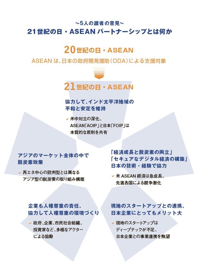 English version わたしの構想No.73 2024.08.09 日・ASEAN、21世紀のパートナーシップへ この記事は分で読めます シェア Tweet 近年、ASEAN経済は急成長を遂げ、日・ASEANのパートナーシップの再構築が急務となっている。これからの日・ASEANの協力のあり方を探った。 PDF(日本語) (2.6MB) PDF (ENGLISH) (226.9KB) ABOUT THIS ISSUE企画に当たって 日・ASEAN、21世紀のパートナーシップへ 友好協力50周年の先を共に創る 東和浩 NIRA総合研究開発機構理事/株式会社りそなホールディングスシニアアドバイザー 日本とASEANの協力の歴史は長い。昨年は友好協力50周年を祝賀する特別首脳会議が開催された。しかし近年、ASEAN経済は急成長を遂げ、また国際環境は大きく変化しており、日・ASEANのパートナーシップの再構築が急務となっている。これからの日・ASEANの協力関係はどのようなものであるべきか。その具体的ビジョンを描くべく、各分野の第一線の識者にお話を伺った。 EXPERT OPINIONS識者に問う 日本とASEANが共通して直面している課題は何か。これからの日・ASEANのパートナーシップはどうあるべきか。 紀谷昌彦ASEAN日本政府代表部大使 渡辺哲也東アジア・アセアン経済研究センター事務総長 竹内純子NPO法人国際環境経済研究所理事・主席研究員 町井健太郎東アジア・アセアン経済研究センタースタートアップ・エコシステム担当マネージャー(日本貿易振興機構から出向) 山田美和日本貿易振興機構アジア経済研究所新領域研究センター上席主任調査研究員 インタビュー実施:2024年6月~7月インタビュー:鈴木日菜子(NIRA総研研究コーディネーター・研究員) データで見る 日本とASEANの交流年表 実質GDP成長率 ASEANの電源別発電量(Electricity generation by source) ASEAN主要6か国へのVC投資額と投資件数の各国シェア(2023年) 企画に当たって 日・ASEAN、21世紀のパートナーシップへ 友好協力50周年の先を共に創る 東和浩 NIRA総合研究開発機構理事/株式会社りそなホールディングスシニアアドバイザー KEYWORDS 日・ASEAN連携、技術力、パートナーシップ、Look Southeast 昨年(2023年)は「日本ASEAN(東南アジア諸国連合)友好協力50周年」の節目であった。それは、アジアにおける「法に基づく秩序」が、力による現状変更への懸念により強い揺さぶりを受け、日本とASEANを取り巻く国際社会が大きな変動期にあるという点で、特別な意味を持った。これまで、ASEAN諸国は、中立と均衡をもって自律性を確保し、地域の安定と経済的なメリットを強したたかに享受してきた。その結果、ASEANは巨大な経済圏を形成し、国際的な存在感を高めることに成功した。しかし同時に、米国・中国の対立やインドの急成長がアジアを主な舞台として展開される中で、国際社会の不安定さや大国間の対立構造が、ASEAN内部の安全保障や地域秩序に影響を与え、かつ、ASEANの動向が大国間関係や国際秩序にも影響を及ぼしかねない状況になっている。 果たして日本は、政治的・経済的な不安定さを内包しつつも急成長するASEANの現状を、正確に認識できているのか。ASEANは日本にとって戦後賠償や経済技術援助の発端となった地域であり、日本企業の進出も活発に行われてきた、いわば「旧知の仲」ともいえる存在だ。交流の蓄積があるが故に、日本は、ASEANを「ODA(政府開発援助)の対象先」「大国に翻弄ほんろうされる国々」という旧来的な観点からアップデートできていないのではないか。 友好協力50周年を迎え、この先の交流樹立100年を見据えるいまこそ、ASEANにとって、課題解決のパートナーとして不可欠な存在であり続けるために、日本の認識を変える好機だ。ASEANを客観的に把握し、意識やパートナーシップを新たな形に変えることができれば、国際社会におけるアジアの地位向上、世界の課題解決への貢献、ひいては日本経済の再浮上を、ASEANと共に成し遂げられるかもしれない。 本号では、日・ASEAN関係を新たなステップに移行させるため、今後の日本とASEANのあり方、新たなパートナーシップ構築に向けた課題の解決で、日本に求められる取り組みを5人の識者に伺った。 インド太平洋を含めた信頼醸成の形成 日本とASEANが抱える課題は、もはや既存の支援体制では対処しきれなくなっている。今後のパートナーシップの構築をいかに図るべきか。 ASEAN日本政府代表部の紀谷昌彦大使は、地政学的要衝かつ重層的な地域協力のハブであるASEANの課題は、地域の平和と安定をいかに維持するかだと指摘する。国際秩序の変動に対し大国との対話をもって対処するためにASEANが打ち出した「インド太平洋に関するASEANアウトルック(AOIP)」への支援を軸に、日本とASEANを「真に対等なパートナー」と位置付けて課題解決に取り組むことで、信頼関係や解決策をインド太平洋地域、さらに世界へ広げられるうえ、政治や安全保障面で信頼の醸成につながるという。 急成長を続けるASEAN経済で、日本は他国の進出に比して後れをとっている。ASEANの「21世紀のパートナー」になれるよう、両者が対等な関係で課題解決に取り組む