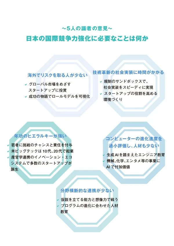 English version わたしの構想No.78 2025.06.20 日本だけがなぜ成長できないのか? この記事は分で読めます シェア Tweet 日本の課題の1つは、新しいビジネスが生まれにくいことではないか。どうすれば、日本は国際競争力を強化できるのか。 PDF(日本語) (3.9MB) PDF (ENGLISH) (225.9KB) ABOUT THIS ISSUE企画に当たって 日本だけがなぜ成長できないのか? 新たな市場を創出できる日本へ、今こそ変革を 金丸恭文 NIRA総合研究開発機構会長/フューチャー株式会社代表取締役会長兼社長グループCEO 日本の科学技術力や、国際競争力の低下が指摘されて久しい。日本の課題の1つは、新しいビジネスが生まれにくいことだ。新たな市場が創出されず、新規分野におけるGDPが伸びていないことが、成長の足かせとなっている可能性がある。日本で新規事業の開拓が進まない要因は何か。日本が国際競争力を強化するのに必要なことは何か。各界の第一線で活躍する識者に聞いた。 EXPERT OPINIONS識者に問う 日本で新規事業の開拓が進まない要因は何か。日本の国際競争力強化に必要なことは何か。 中原裕彦内閣官房内閣審議官(文部科学戦略官・文化戦略官) 古賀大貴Oishii Farm Corporation CEO レネ・エハサルエストニア防衛航空宇宙産業協会(EDIA)クラスター・マネジャー 西川徹株式会社Preferred Networks代表取締役最高経営責任者 リチャード・ダッシャースタンフォード大学アジア・米国技術経営研究センター所長 インタビュー実施:2025年2月~4月インタビュー:井上敦(NIRA総研主任研究員)、川本茉莉(NIRA総研主任研究員)、宇田川淑恵(NIRA総研研究コーディネーター・研究員) データで見る 規制のサンドボックス制度:電動キックボードLuupの実施例 世界のDeep-techへの投資総額と1資金調達ラウンドあたり投資額 日米の外国籍起業家への支援制度 エストニアの武器輸出額と軍事費の推移 企画に当たって 日本だけがなぜ成長できないのか? 新たな市場を創出できる日本へ、今こそ変革を 金丸恭文 NIRA総合研究開発機構会長/フューチャー株式会社代表取締役会長兼社長グループCEO KEYWORDS 前例主義、時代に合わない規制、新プレイヤー、挑戦意欲や創意工夫を生かす社会 半導体の爆発的な性能向上により、画期的なソフトウエアサービスが次々と生まれ、予想をはるかに超える速さでAI(人工知能)の進化をもたらした。1955年にショックレー半導体研究所がカリフォルニア州マウンテンビューに誕生して以来、米国における技術革新をけん引してきたのは「若者」だ。ビル・ゲイツ、スティーブ・ジョブズ、ラリー・ペイジ、マーク・ザッカーバーグ、サム・アルトマンといった、当時10代や20代の起業家たちの多くはチャンス到来と捉え、大学を中退して起業し、それまで存在しなかった若い企業を「巨大なガリバー」に成長させた。これらの新しい企業が新たなGDPと雇用の創出に大きく貢献して米国経済をけん引している。一方、日本では20世紀に各省庁が策定した「時代に合わない規制」が、新しい技術の開発や事業の誕生を阻み、その規制を見直すスピードも致命的に遅い。例えばライドシェア――先進国はもちろんのこと、今やアジア諸国でも日常生活に欠かせなくなったが、日本ではいまだに社会実装されていない。若者や新しいプレイヤーの活躍の場を極小化していては、新しい成長を自ら放棄しているのに等しい。日本人の潜在能力を信じ、もっと個人と組織の挑戦意欲や創意工夫が生かされる社会に転換すべきだ。 日本の成長を阻んでいるのは旧態依然とした法規制や前例主義、実績主義、年功序列――識者の方々もその点を指摘する。 規制を撤廃して実験――都会のビルで植物工場、養豚場も 内閣官房内閣審議官の中原裕彦氏は、問題点は社会実装の段階にあるとして、「規制のサンドボックス」の推進を説く。私自身、サンドボックスを推進する立場にあるが、より重視すべきは「場所よりも期間」であろう。どんな技術であれ、将来的に実を結ぶかどうか、事前に知ることはできない。ならば、実験期間を設けて規制を廃し、既存組と新規参入組で競争をさせて、実験後にあらためて必要な規制を考えるのが適切だ。 Oishii Farmの古賀大貴氏はニューヨークでいちごの植物工場ビジネスを起業した。米国には日本のような高品質の農作物は少なく、市場の求めに合致していたからだという。 日本でも植物工場のニーズは間違いなく存在する。だが、ビルで農作物を作っても農地とは認められず、住宅地に工場を作ってはならないという理屈で、植物工場や養豚場(中国では高層ビルで豚を飼育する「ハイテク養豚」が注目を集めている)を日本国内では実現できない。農林水産省の法規制は家族経営の保護、大企業参入の排除を前提としており、農業分野でダイナミックな生産性向上は望むべくもない。 技術革新の節目こそ若い人材を育てる環境をつくる レネ・エハサル氏はエストニアの防衛産業における産官学連携を解説しているが、ここで注目すべきはプレイヤーの違いだ。