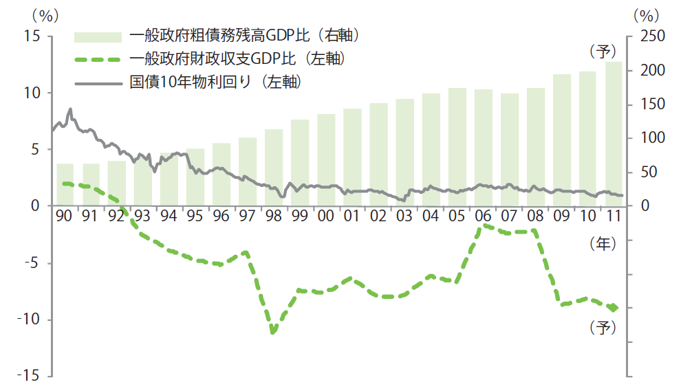 English version NIRAオピニオンNo.5 2011.10.28 歪みが制御不能になる前に財政の再建を この記事は分で読めます シェア Tweet 伊藤元重 総合研究開発機構(NIRA)理事長 概要 日本政府の抱える債務残高は世界の主要国の中でも際立って高い水準にあるが、国債の利回りは歴史的に見ても極めて低い水準で安定している。しかし、これにより経済の「活断層」には刻々と歪みが蓄積されており、ある時点でそれが撥ねて「地震」が起これば、日本の金融システムひいては経済社会全体に深刻な悪影響をもたらすことが懸念される。活断層の歪みが制御不能になる前に、着実に財政再建を実行すべきことを提言する。 PDFで読む (1.2MB) English(PDF) (194.7KB) INDEX 価格高止まりの日本国債 デフレが支える国債価格 経済の活断層にたまる歪み 国債価格の下落を起こす不安要因 財政再建は「増税と社会保障制度の見直し」で 価格高止まりの日本国債 日本政府の抱える債務残高は対GDP比で200%の水準に達しようとしている。世界の主要国の中でも際立って高い水準である。フローで見た財政収支でも、40兆円前後の税収で、90兆円を超えるような歳出を行っている。巨額の国債発行で何とか維持している状況である。誰が考えても健全な財政状況ではない。 さらに深刻なのが、少子高齢化による財政への負荷の増加である。社会保障費は膨れ上がる一方で、今後の財政運営はますます厳しくなるばかりである。過去の赤字が生み出した債務ばかりが取り上げられるが、本当に深刻なのは今後予想される社会保障費の膨張である。 このように数字上は深刻な財政状況であるにも関わらず、国債の価格は過去最高の水準をつけている。国債価格が高いほど国債の利回りは低くなる。10年物国債という長期の利回りでも、1%前後という歴史的に低い水準である。巨額の債務を抱える政府の債務証書である国債を、市場は非常に低い金利で引き受けている。こうした低い利回りは、結果的に政府の財政運営を助けているのである(図表1)。 しかし、国債の価格の高止まりが、ソブリンリスクの懸念を大きくさせる。引き受けた国債の価格が高いほど、そしてその保有残高が大きいほど、国債の価格が下落すれば金融機関は多くの損失を被ることになる。国債の金利が上がれば新規発行や借り換えに際して利払い負担が上がり、政府の財政運営はより困難になる。そもそも、史上最低とも言える超低金利の状態を永遠に続けることはできないだろう。 それでも、金融関係者の間には、国債金利は当分低い状態が続くと見ている人が多いようだ。日本の国債はその多くが日本の貯蓄資金によって消化されている。それを仲介している金融機関、たとえば銀行は、安全資産を潤沢に保有する必要性からも、現在の経済状況の下では国債へ資金を向けざるを得ない。潤沢な貯蓄資金があり、しかもそれを国債に向かわせざるを得ない状況では、国債の売り浴びせは起こりにくい。だから国債の金利は当分低いままだろうと言う。しかし、こんなに多くの国債を保有しても大丈夫か、と重ねて問えば、多くの人が不安な表情を見せる。誰も、国債の価格が今のまま高止まりするという確信は持てないのだ。 図表1 日本の財政状況と国債利回り 国債利回りの低位安定はいつまで続くのか (注)一般政府財政収支、同粗債務残高のGDP比の2011年の値は予測値。(出所)OECD, "Economic Outlook 89 Database,″ Datastreamより作成。 デフレが支える国債価格 多くの経済学者は、10年以上前から財政問題に警鐘を鳴らしてきた。このままの状態を続ければ、いずれ国債価格は暴落し、大変なことになるとも言ってきた。こうした見方に対して、「国債価格は高止まりではないか。経済学者はオオカミ少年だ」、というような批判が一部の政治家や金融関係者の間にあるようだ。しかし、こうした議論は危険だ。あたかも、これからも国債は大丈夫だという間違った見方につながりかねないからだ。 そもそも、ここまで政府債務残高が増えても、なぜ国債の利回りがかくも低いのか、つまり国債の価格がかくも高いのか、という点について確認しておく必要がある。 その要因の1つとしてデフレの存在が大きい。この10年以上、日本経済はデフレ的な状況にあった。物価が低下傾向にあるだけでなく、企業も家計もそして金融市場もそれを反映した行動をとってきた。家計部門はひたすら貯蓄に励んできた。将来に不安を抱えるほど、不要な消費は控える傾向にある。 図表2にあるように、株価の変動等による影響が見られるものの、家計部門が保有する(負債を除いた)ネットの金融資産残高の年間可処分所得に対する比率は上昇傾向にあり、最近では4倍前後まで拡大している。他の主要国の数値は低いだけでなく、これほど顕著には増えていないことと比べると、日本の家計部門がいかに防御的な姿勢であったかが分かる。だから内需がふるわないわけだが、同時に膨大な貯蓄資金が金融市場へ流入している。 企業部門も似た
