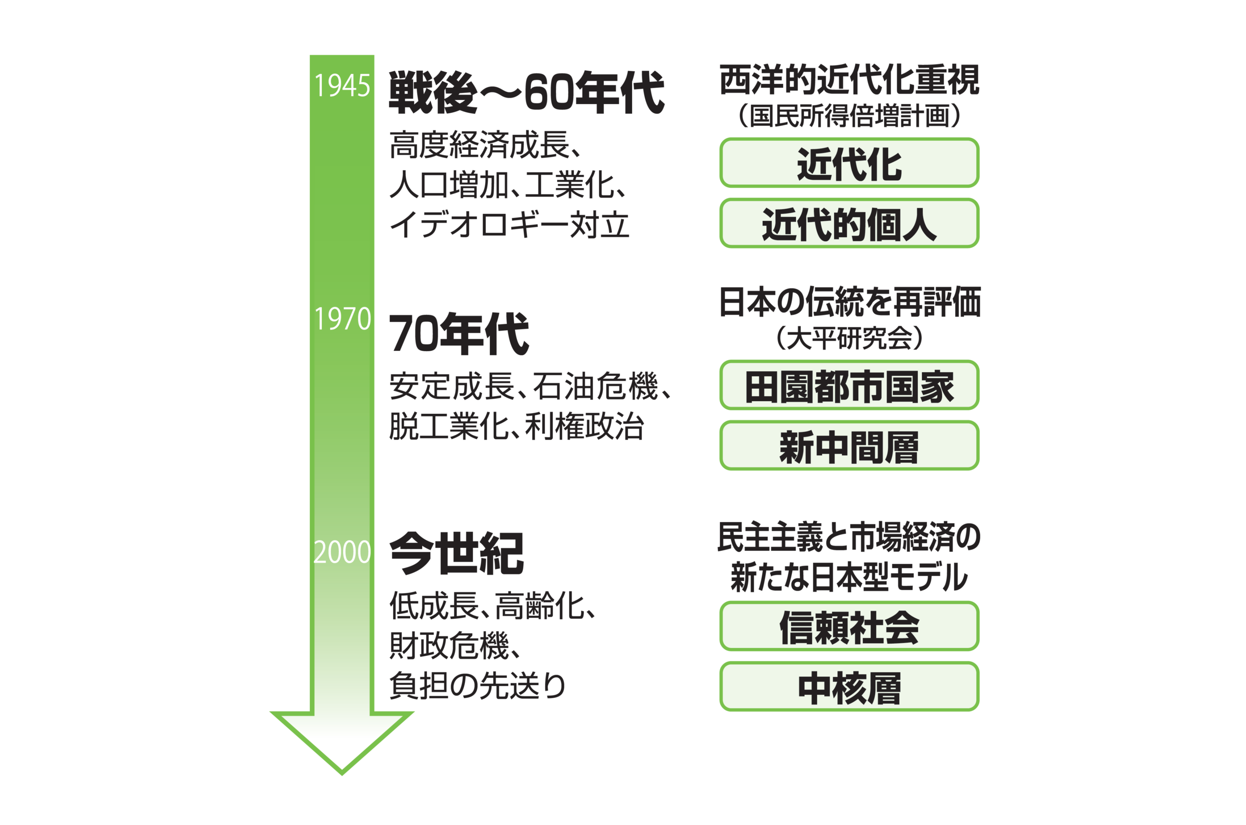 NIRAオピニオンNo.12 2014.12.19 中核層の時代に向けて この記事は分で読めます シェア Tweet 宇野重規 東京大学社会科学研究所教授 谷口将紀 東京大学大学院法学政治学研究科教授 牛尾治朗 総合研究開発機構(NIRA)会長 概要 21世紀の今日新たな日本の長期的指針を模索するためには、次の3つが必要である。第1は、未曾有のグローバル化によって揺さぶられる現代日本社会にとって何が自らの拠って立つ規範の根源か、その歴史と文化を振り返りながら問い直すことである。「日本とはいかなる社会なのか」、「何を大切にする社会なのか」を明らかにすることは、緊急の課題である。第2は、成熟社会を迎えてますます注目が集まっている、「人と人とのつながり」と「地域に根ざした暮らし」である。現代日本社会においては少子化や高齢化が進み、孤独化や社会的排除の問題も深刻になっている。この問題がとくに如実に現れると同時に、それを解決する鍵ともなりうるのが「ローカルな」場である。政治や行政における集中と分散の新たな組み合わせと、それに見合った経済構造の実現が重要である。第3は、それを可能にする政治のあり方である。1990年代以降の選挙制度改革はたしかに政権交代をもたらしたが、達成の実感には乏しい。今あらためて見直さないといけないのは、制度の基盤となる社会組織、さらにはそれを担う人間像である。民主主義をめぐる考察を制度→組織→人間へと深化させていかねばならない。以上の課題を、今こそ真剣に考えたい*。 PDFで読む (1.6MB) INDEX 1.「中核層」を軸に信頼社会を築け-財政再建、国民負担増の先にある日本社会の姿とは?- デフレ脱却後の真の危機 スマートな日本社会のあり方とは? 民主主義と市場経済の緊張の高まり 「日本の自殺」と大平研究会 日本型組織を再編せよ 「中核層」とは何か 政党政治の立て直し 「その先」にある日本社会の姿 2.中核層の時代に向けて-自らの人生と社会を選び取る人びと- 日本社会の基本条件 日本社会の未来像 信頼社会の構築に向けて 中核層とは誰か グローバル都市とコミュニティ 3. 続 中核層の時代に向けて-地方を創生するのは誰か- 行政サービスを公共サービスと捉え直す 地方政府のあり方を問う 地域に応じた課題 中核層が連携した地域社会をつくる 国は何をすべきか 政党が果たす役割とは? 付録 対談「中核層」が主導する情報社会の変革-政府と市場の亀裂は修復可能か- 脱原発論にも似た「ゼロ成長論」 時代を循環で捉えた「15年周期説」 内に向かう日本のアカデミズム 従来のエリートが不要になる 行政を補完するピア・ネットワークの誕生 1.「中核層」を軸に信頼社会を築け-財政再建、国民負担増の先にある日本社会の姿とは?- 日本経済に一条の光が差している。昨年末以降の円安によって輸出産業を中心に企業の業績が上向き、政府の補正予算と日銀の金融緩和の後押しもあって、日経平均株価はリーマン・ショック以前の水準を回復した。今年の春闘では賃金の引き上げ額が昨年を上回り、世論調査でも「日本の景気はこれから良くなっていく」という回答が6割を超えた(投票行動研究会〈JESV〉電話調査、2013年3月1~4日)。 しかし、この明るさはほんとうに日本の夜明けを告げる曙光なのか。それとも、蝋燭の炎が燃え尽きる寸前の輝きにすぎないのか。アベノミクスの1本目、2本目の矢が国民の喝采を受けるほどに、われわれの脳裏には大平正芳元首相の次の言葉が、四半世紀の時を超えて響きを増す──。 政治が甘い幻想を国民にまき散らすことはつつしまなくてはならない。(1978年12月9日付『朝日新聞』) 政治、そして民主主義にとっての最大の課題は、自らの置かれた状況を直視し、それがどれだけ厳しい選択であれ、国民自身が未来を選んでいくことにある。安易な楽観主義を排し、自らを厳しく律することができて初めて、真の意味での希望がよみがえってくることを忘れてはならない。 デフレ脱却後の真の危機 デフレからの脱却、名目3%以上の経済成長を緊急課題とする、安倍内閣の現下の経済運営に異論はない。しかし、わが国が直面する真の危機とは、デフレを抜け出したあともなお残る、高齢化社会と財政危機であり、かつ、そこから与野党が目を背けていることである。 3月末に公表された国立社会保障・人口問題研究所の推計によれば、2040年にはすべての都道府県で65歳以上の高齢者人口が3割を超し、半数近くの市町村では住民の40%以上が高齢者によって占められるようになる(国立社会保障・人口問題研究所「日本の地域別将来推計人口〈平成25年3月推計〉」、平成25年3月27日)。現在でさえ国・地方の長期債務残高がGDPの2倍に達しようとしているところ、さらなる少子高齢化による社会保障費の膨張は、わが国財政ひいては国民生活にただならぬ影響を及ぼしかねない。 経済成長をもたらせば財政再建は可能とする向きもごく一部に見られる。とはいえ、内閣府の試算によれば2011~2020年度の平均成長率が名目3%、