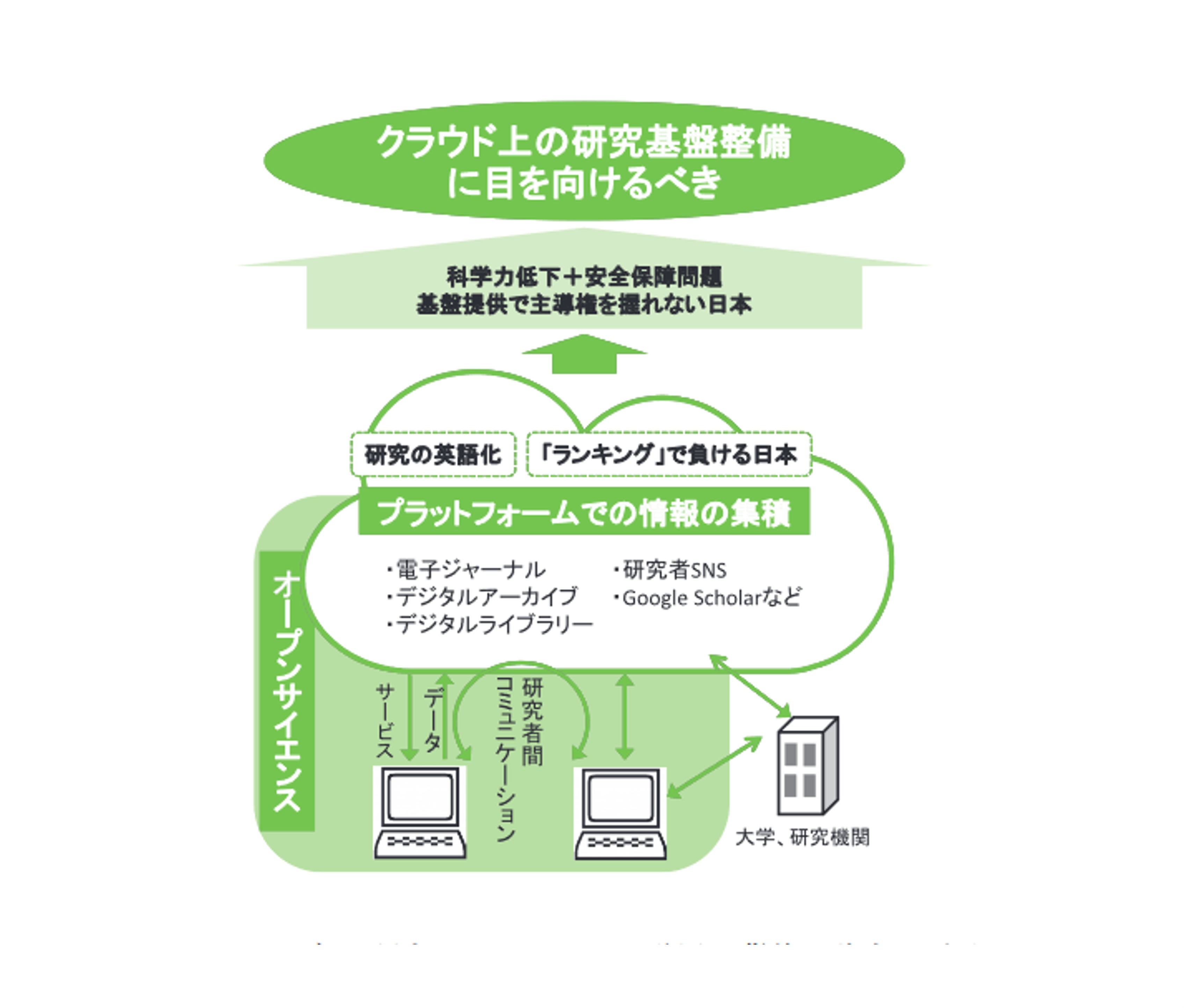 NIRAオピニオンNo.15 2015.05.21 孤立する日本の研究プラットフォーム放置すれば日本の科学そのものが衰退する この記事は分で読めます シェア Tweet 國領二郎 慶應義塾大学総合政策学部教授 概要 クラウドコンピューティングの発達を背景に、研究活動を支援する過程で、研究成果や評価情報を蓄積する国際的プラットフォームが形成されつつある。情報は集積することで、それ自体の持つ価値を高めることができる。この情報の性質が、今、研究成果の情報の集積と分析の競争を引き起こしている。しかしながら、日本は英語を共通言語とする研究プラットフォーム構築競争の中では全く主導権をとれていない。世界の研究状況が、海外プラットフォーム事業者にはリアルタイムで可視化され、日本の研究者には部分的にしか見えないという状況は、日本の科学の進展にとって重大なハンディキャップとなるだけでなく、安全保障上の問題にもなりうる。 同時に、ネットワーク化が科学のあり方そのものに大きな影響を与えつつあることにも注目すべきである。研究者をつなぐソーシャルネットワーク、市井の研究者もネットワークを介して参画しながら知を発展させるオープンサイエンス、科学的方法論の姿を変えつつあるビッグデータサイエンスなどの動きから日本は落伍してはいけない。 日本はこれまで個別の研究に注目し、大きな資金を投じてきたが、研究情報の電子化の基盤的なプラットフォーム(デジタルライブラリー、デジタルアーカイブ、電子ジャーナル)やそれを運営する人間の技能に対しては十分な注意を払ってこなかった。その状況を改めるべきである。多言語化やマルチメディア化などで、智のプラットフォームが進化する余地はまだ数多く残っており、これからでも的確な手をうつことでプレゼンスを高めることが可能である*。 PDFで読む (946.5KB) INDEX 世界の研究データベースを誰が握るか 智のプラットフォーム構築競争 ソーシャル化、オープン化する研究コミュニティー ビッグデータで科学そのものも変わる 研究基盤が孤立する日本 多言語化などで役割を果たせ 世界の研究データベースを誰が握るか 例えば安全保障担当者にとって、世界中の「どこで」、「誰が」、「どんな資金を使いながら」、「何の」研究をしており、「誰と協力」しながら行っているか、それが「どんな水準」に達しているか、研究にあたって「どんな他の研究の影響」を受けながら行われているか、そして「評価の高い研究はどれか」などと言ったことを、いつでも調べられるデータベースがあれば、極めて重要な情報源になる。それはどの国がどんな技術を手に兵器を開発したり、経済分野での競争力を手に入れたりしつつあるかを知る重要な手がかりとなる。 ところがそのようなデータベースは既に存在しているのである。クラウドコンピューティングの発達により、研究活動を論文執筆から共同研究者の探索、成果発表にいたるまで支援しつつ、そのプロセスの中でいつ、どこで誰がどんな研究をし、その成果のうちどれが高く評価されているかについての情報を蓄積する国際的プラットフォームが急速に発展しつつある。例えば、大手商業出版社であるElsevier(エルゼビア)社(オランダ本社)は、抄録・引用文献の巨大なデータベース(Scopus(スコーパス))のサービスを提供している。 しかも、そのプラットフォームの上に、世界の研究者が無報酬で研究成果を登録し、競い合っている。そのようなデータベースをもとに業績を評価されることが研究機関の評価の基準となっているからだ。現在、世界の大学が血眼になって上位につこうとしている「大学ランキング」なども、データベース上で論文がどれくらい引用されたかに大きな評価ウエートが置かれている。生命科学などを中心にScopusやWeb of Science(Thomson Reuters(トムソン・ロイター)社)と呼ばれる論文のデータベースに論文が登録されていないと、その論文は学術的には存在していないに等しい。そして、そこでの引用数が論文評価や研究機関の評価に直結し、研究費の獲得や学生の獲得にも大きく影響を与えるようになってきている。結果として研究者たちはScopusが対象としている論文誌に投稿するために激烈な競争を行っている。 国境を超えて形成される智のプラットフォームは、残念ながら圧倒的に英語の世界である。結果として日本語で書れた論文などは国際的に認知されず、日本の大学や研究者が低く評価されることになる。世界の中で評価が低いことは一流の研究者の輪から外されて研究の質も下がっていくことを意味しており、看過できない。 智のプラットフォーム構築競争 大きな求心力が生まれる中で、プラットフォームにデータを収集する手法もどんどん進化している。例えば、この文章を作成しているワープロソフトには、筆者が文献を引用するときに文献情報を瞬時に探せるサイトにつながるプラグインが搭載されているが、そのプラットフォームは、た