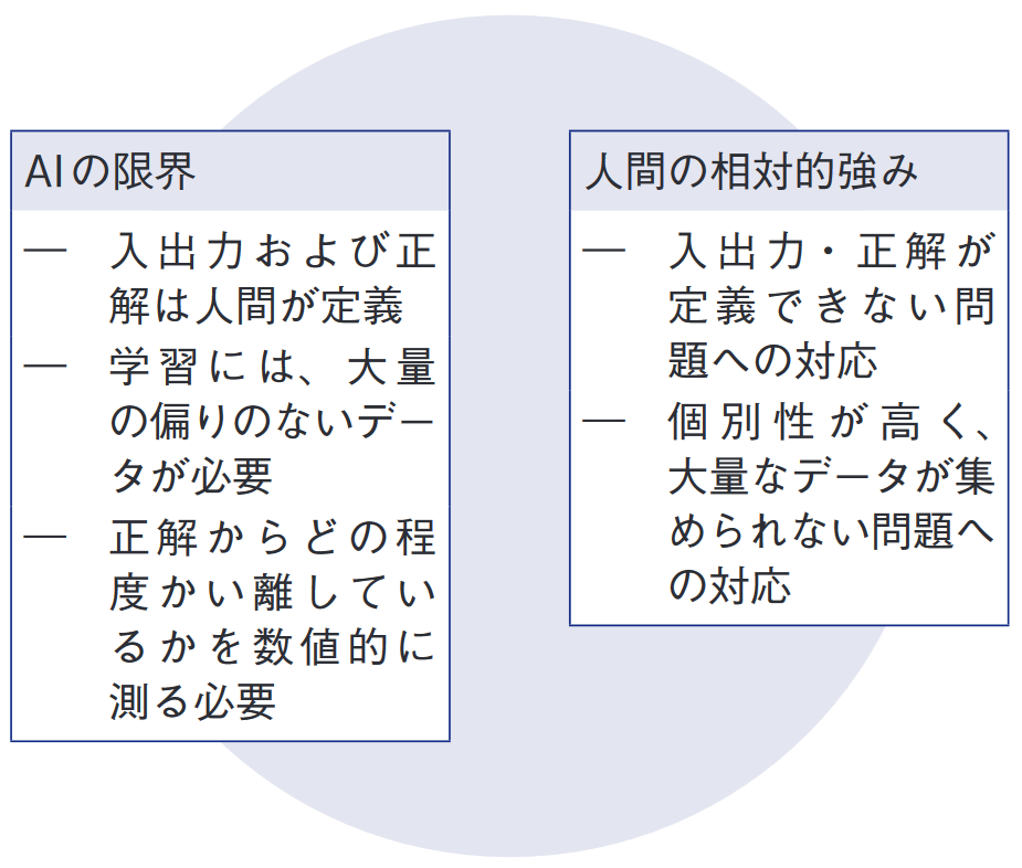 NIRAオピニオンNo.25 2016.11.04 AI時代の人間の強み・経営のあり方 この記事は分で読めます シェア Tweet 柳川範之 NIRA総合研究開発機構理事/東京大学教授 新井紀子 国立情報学研究所情報社会相関研究系教授 大内伸哉 神戸大学大学院法学研究科教授 概要 人工知能(AI)に関する技術進歩は目覚ましく、その成果を有効活用していく必要がある。しかし、そこには一定の限界も存在する。今の人間社会においては、AIが「正解」を導くには、そもそも人間が「正解」を明確に設定せざるを得ない。また、AIが学習していくには、大量のデータが必要になる。経営戦略面では、このような特性を正しく理解し、業務を再設計していくことが求められる。 再設計が非効率的な形でしか行われないと、より効率的にAIを活用する外国企業等に、競争で負けてしまう。AIの発展は、経営の現場を大きく変えていくに違いないが、そこには飛躍するための大きなチャンスも隠されている。適切に業務を切り分け、AIに代替させるべき業務は代替させ、人とAIとが融合的に業務を行えるようにすることにより、全体の生産性向上が期待できるし、AIの機能向上が、新たな仕事や新たな雇用も創出していくだろう。具体的には、業務フローの全体的な見直しや、経営全体の再編成が必要となってくる。また、その結果、産業の垣根も大きく変化するに違いない。社会全体としては、このような技術の変化を踏まえた、適切な雇用政策や教育制度の改革がより一層重要となるだろう。 PDFで読む (1.4MB) INDEX 1 はじめに 2 AIはどこまで進歩するのか 人工知能とは 機械学習の進展 機械学習の特徴と限界 人間の相対的強み 3 経営・産業構造への影響 経営戦略の重要性 明確化の必要性~AIではなく外国企業に負ける AIの制約は経営によって変えられる 経営の再設計が必要~AIと人間の融合を目指せ まとめ 4 雇用政策、教育制度の変革 雇用政策を考えるポイント 労働者にとって必要なスキルと教育 教育問題への含意 1 はじめに 人工知能(AI)に関する問題を考える際の、大きな課題のひとつは、どのようなレベルの技術革新や発展を想定するかという点である。将来どの程度の発展が見込まれるかについては研究者の意見も分かれており、確実な未来を予測することは難しい。また、技術革新が急速でもあることから、人間の能力をはるかに超えた知的存在としての人工知能が語られることもあるし、また目先の製品開発レベルでの人工知能活用が語られることもある。どのような時間軸で、どのような可能性レベルで考えているかを明確にしないと、議論がかみ合わず混乱してしまう。 特に社会や経済への影響という観点で考える場合には、どこまでの実現性があるのか、どの程度社会に実装される可能性があるのかという点に注意を払う必要があろう。そうでないと、地に足のついた政策論等はできないし、いたずらに楽観的に考えたり、実現可能性を考えずに過分に悲観的になってしまったりする。そこで本稿では、現在の技術水準である程度予想し得る現実的な未来像を想定し、そのうえで、それが社会や経済に対してどのような影響を与えるかを検討していくことにする。 本稿の主なメッセージは、以下の通りである。 ①人工知能に関する技術進歩は目覚ましいものがあるものの、一部で喧伝されているような、すべての面で人間の知能を凌駕するような人工物が開発される見込みは立っていない。社会科学としては、そのような未来を想定して議論することには、無理がある。②しかしながら、今予想可能な技術進歩のレベルであっても、社会や経済に与える影響は、かなり大きい。未来の技術ではなく、既に存在する技術レベルですら、それが社会に実装されていく過程で、産業構造が大きく変化する等経済に甚大なインパクトをもたらしうる。③この大きな影響をチャンスと捉える発想が必要であり、AIの限界を把握し、人間にしかできない強みを発揮させる、業務フローを大胆に見直すなど、今までの産業構造の枠組みを超えた再構築が、企業経営においても求められる。④また、そのチャンスを生かすうえでは、例えば雇用政策や教育等、政策面・制度面での改革も必要となる。 以下これらの点について、詳細に検討していくことにしよう。 2 AIはどこまで進歩するのか 人工知能とは 厳密な定義をすれば「人工知能」とは、人間と同等かそれ以上の精度で、人間が行う知的活動「全般」を実行する人工物のことを指すべきだろう。世間では今、人工知能ブームが訪れているが、残念ながら、そのような人工物が開発される理論的枠組みはいまだ存在しない。また、それが確立される見込みも立っていないのが正確なところだ。 将来の発展を期待して、脳科学との融合の可能性等が語られることはある。しかし、機能の実験科学的あるいは数理モデル的解明と、その実装との間にはかなりのかい離がある。例えば、その機能が科学的な意味では完全に解明されたとい