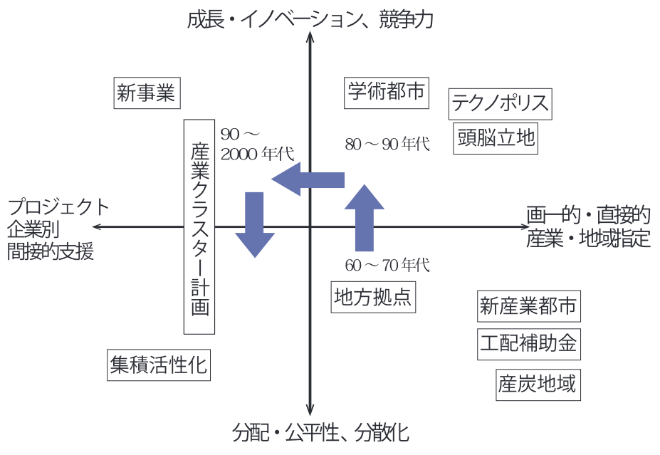 NIRAオピニオンNo.29 2017.03.01 コンパクトな産業集積へ柔軟なネットワークで支える この記事は分で読めます シェア Tweet 岡崎哲二 東京大学大学院経済学研究科教授 大久保敏弘 慶應義塾大学経済学部教授 齊藤有希子 独立行政法人経済産業研究所上席研究員 中島賢太郎 東北大学大学院経済学研究科准教授 原田信行 筑波大学システム情報系准教授 概要 90年代を境に、日本経済のけん引役が大都市圏から大都市圏以外の地域に移りつつある。地域経済の成長が日本の成長に不可欠となる中、近年、地域産業政策も見直されてきてはいる。しかしながら、地域経済が目を見張るような力強い成長軌道に乗っているとは言い難い。かつての補助金による企業誘致は、生産性の低い企業を集積させ、逆選択とよばれる問題を招いた。また、90年代末以降にはプロジェクト単位の支援にシフトしたものの、飛躍的な成長には至っていない。 そこで、本稿では、少数でも生産性の高い企業による「コンパクト」な集積を目指し、それをネットワークで支えることで柔軟性を付加する政策を実施することを提案する。各地域が比較優位を持つ産業を特定し、独自性を生かした生産性の高い企業による集積を、プロジェクトベースでの支援を行うことで形成していく。その際、既存の交通網を活用することで多様なface-to-faceのコミュニケーションを構築するとともに、地域金融機関などが率先してネットワークを築いていく。これからの地域産業政策は企業の「数」ではなく、「質」であることを認識すべきだ。 PDFで読む (988.5KB) INDEX 地域がけん引する時代 生産性の低い企業を誘引した補助金政策 プロジェクト単位の支援政策への移行 コンパクトな産業集積への転換 ネットワークによる柔軟性 ネットワークを形成する組織の活躍 さいごに 地域がけん引する時代 日本経済のけん引役は、90年代を境に、東京圏をはじめとする大都市圏から、大都市圏以外の地域に移りつつある。GDP成長率をみると、90年代以前は、東京圏のGDP成長率は他の地域よりも高かったが、90年代以降は九州圏や中部圏の方が高くなっており(図1)、状況が逆転している。地域経済の成長が、今後の日本経済の成長を実現するうえで不可欠となっている。 地域の力強い成長は、地域に立地する企業がその地域の産業集積やネットワークのメリットを活用することができるかどうかにかかっている。その背景には、グローバル化の影響を受けて、この四半世紀の間に、企業の戦略が大きく変わってきていることがある。企業は、単独ではなく、関連する企業や、時には競争関係にある企業とも連携しながら、グローバルな市場での競争に勝ち抜こうとする戦略をとっている。近年は、企業が必要とする技術の幅が広がり、また、革新のスピードも速まってきており、誰と、どのタイミングで、どういうネットワークを構築するかが、企業の存続を左右するようになっているともいえる。地域の企業が、産業集積やネットワークから享受できるプラス効果は大きい。 こうした状況を受け、日本の地域産業政策も近年、見直されてきてはいる。しかし、現時点で地域経済が目を見張るような力強い成長軌道に乗っていないのも事実である。 そこで、本稿では、地域産業政策の変化を踏まえ、今後の新たな地域産業政策の方策について検討する。 図1 県内総生産成長率の県別・期間別比較 (出所)R-JIPデータベース2015をもとに作成 生産性の低い企業を誘引した補助金政策 戦後、日本で本格的な地域産業政策が実施されたのは1960年代以降である。当時の政策では、国土の均衡ある発展の実現を目標とし、都市から地方への所得移転(再分配)を実施するために、企業誘致や大都市から地方への工場移転が促進された(図2右)。産炭法(1961年)や工配法(1972年)といった当時を代表する政策は、全国画一的なもので、政府が地域や業種を指定し、補助金や税制優遇によって地域への誘致を行う地域振興策であった。 80年代になると、地域間での再分配的な色合いは弱まり、成長や競争力強化が目的となっていった。全国一律で基準を設定する従来の手法ではなく、いくつかの市町村を限定し、税制上の優遇措置や補助金を提示する手法が採用された。テクノポリス法や頭脳立地法は、特定地域での先端技術に特化した産業集積を目指すものであった。 では、これらの補助金政策の効果はどう評価されるべきなのか。筆者らの工業統計調査を使った実証分析によると、補助金を受けた地域では、企業数が増え雇用は増加したが、地域全体の平均生産性の上昇は見られなかった。優遇措置を受けた地域に生産性の低い企業が集積した。補助金により強く魅力を感じるのは、どちらかというと生産性の低い企業で、そうした企業が集積する結果、地域全体の生産性の低下を招いてしまう、いわゆる逆選択と呼ばれる問題が生じている。成長や競争力強化の目的に照らすと、こうした政策に高い評価をつけることは難しい。