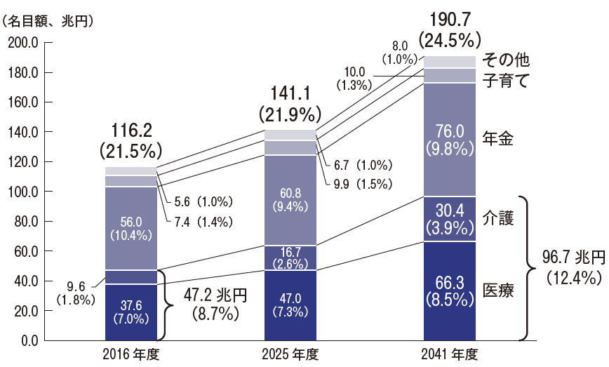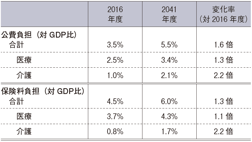 English version NIRAオピニオンNo.34 2018.03.20 人口変動が突きつける日本の将来社会保障は誰が負担するのか この記事は分で読めます シェア Tweet 柳川範之 NIRA総合研究開発機構理事/東京大学大学院経済学研究科教授 森田朗 津田塾大学総合政策学部教授 岩本康志 東京大学大学院経済学研究科教授 小塩隆士 一橋大学経済研究所教授 鈴木準 大和総研政策調査部長 田宮菜奈子 筑波大学医学医療研究系教授/ヘルスサービス開発研究センター長 福井唯嗣 京都産業大学経済学部教授 概要 2020年代に後期高齢者となる団塊世代、30年代後半に高齢者となっていく団塊ジュニア世代、そして減少の一途をたどる現役世代。確実に訪れる劇的な高齢化の進行は、わが国に重大な課題を突きつけている。われわれはこの現実の影響を直視するために、特に人口構造の変化に着目し、2041年度までの社会保障に係る費用の将来推計を行った。 現在進行中の政策を織り込んで推計した結果、社会保障給付費のGDPに占める割合は21.5%から24.5%へ上昇することが示された(名目額では116.2兆円から190.7兆円へ)。高齢化の影響により医療と介護の費用の増加は大きなものとなるが、特に介護の増加幅は大きい。減少を続ける現役世代には、支える対象の増加と支える側の減少が相まって、大きな負担がのしかかることになる。さらに医療は、人口要因に加えて急激な高度化にも留意が必要だ。 厳しい財政運営が続く中、社会保障制度が直面する問題が喫緊の政策課題であることは言うまでもない。今後確実に高齢化が進行していく中で、給付・負担構造の見直しや、さらなるリスクに直面する人々への対応など、課題は多岐にわたる。いま突きつけられている現実的な将来像に目を向けて、確実に政策を推し進めることが急務である。* PDFで読む (990.8KB) PDF (English) (612.4KB) INDEX 社会保障給付費の将来見通し 現役世代にのしかかる負担 人口構造の変化による影響に焦点 給付と負担の見通しに基づく議論が必要 提供体制の見直しと生産性の向上 わが国では今後、確実に少子高齢化が進行していく。2025年には後期高齢者となる団塊世代、30年代後半には高齢者となる団塊ジュニア世代、減少の一途をたどる現役世代。避けることのできない人口構造の変化により、社会保障は大きな影響を受ける。この現実を直視するためにも、社会保障費用の推移を中長期的に描き、それに基づいた対策を講じることが急務である。しかし、厚生労働省が2012年に社会保障税一体改革に向けた議論の中で社会保障に係る費用の将来推計を示して以降、推計は更新されておらず、8年後に迫った2025年以降の姿を描いていない。そこでわれわれは、少子高齢化による人口構造の変化に着目し、2041年度までの社会保障に係る費用を推計した(注1)。 社会保障給付費の将来見通し 社会保障給付費は、対GDP比で見ると2016年度の21.5%(名目額116.2兆円)から、2041年度には24.5%(同190.7兆円)へ、3%ポイント上昇する(注2)(図1参照)。これは、消費税率で6%分の税収に相当する。 内訳を見ると、医療給付費は、65歳以上の人口比率が大幅に高まることを反映し、2016年度の対GDP比7.0%から、2041年度には8.5%に上昇する(注3)。介護給付費は、2016年度の対GDP比1.8%から2041年度には同3.9%へ、倍以上となる。これほどの上昇は、今後65歳以上の高齢者の人口比率が高まるだけではなく、その中でも介護サービス利用量が特に大きい80歳以上の人口比率が高まっていくためである。医療と介護を合わせると、2016年度の対GDP比8.7%から2041年度には12.4%へと上昇する。 また年金給付費は、2016年度の対GDP比10.4%から、2041年度には同9.8%へと若干低下する。これは長期的な年金財政維持のために、現役人口の減少や平均余命の伸びに合わせて年金の給付水準の引き上げを自動的に抑えるマクロ経済スライドにより給付額が抑制されるためである。 子ども・子育て関連経費は、2016年度の対GDP比1.4%から2041年には同1.3%となる。現在進行中の政策により充実化が図られ、その後は子ども人口の減少を加味するとほぼ同水準となる。 図1 社会保障給付費の将来見通し (注)金額は名目額、カッコ内は対名目GDP比を示している。「その他」は、「社会保障費用統計」の給付費から医療・介護・年金・子育てを除いた額を各年の対GDP比で一定とおいている。 (出所)厚生労働省その他公開資料、および内閣府「中長期の経済財政に関する試算(2018年1月23日)」を用いて推計。 現役世代にのしかかる負担 高齢者の増加と現役世代の減少のさらなる進行は、保険料・税収入を支払いに充てる賦課方式的な財政の仕組みを基本とする社会保障制度において、「支えられる側」の増加と「支える側」の減少を意味する。それは、現役1人当たりの負担の急速な増加につながる。 医療・介護給付費の増加は、現行の制度を適用すると、約半分は本人および事業主の保険料収入で賄われ、残りは消費税収を財源とした公費となる。医療の保険料負担は、対GDP比で2016年度の3.7%から2041年度
