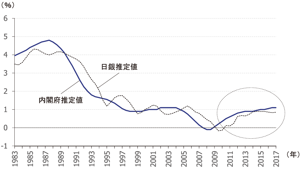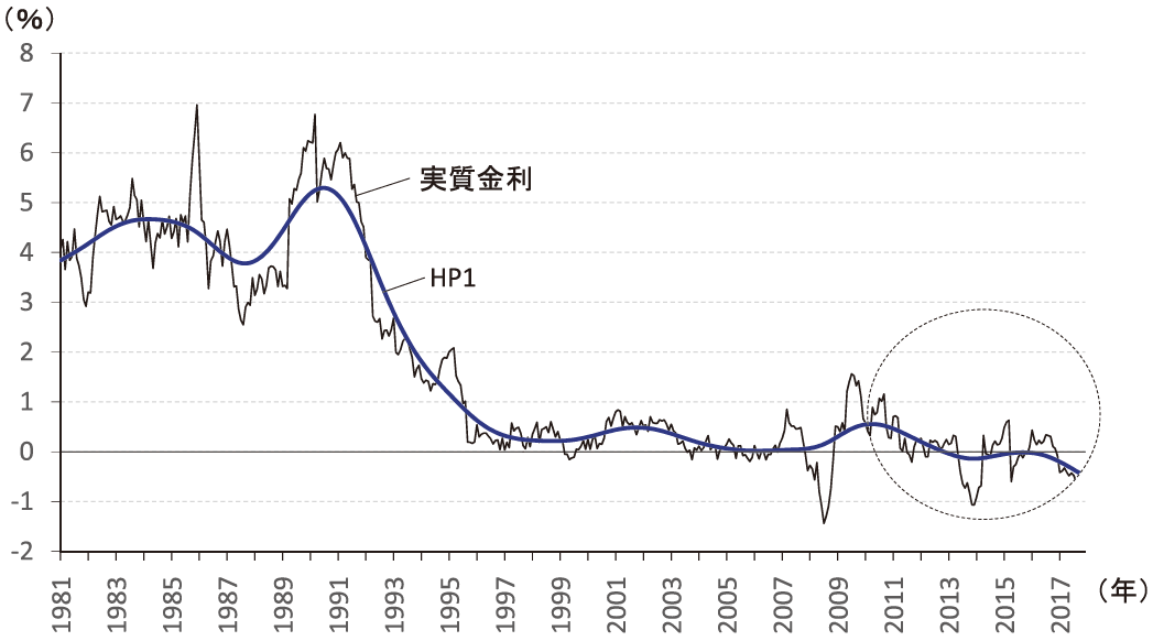 English version NIRAオピニオンNo.38 2018.05.30 金融政策はジレンマを乗り越えられるか均衡利子率の推計から示唆されること この記事は分で読めます シェア Tweet 宮尾龍蔵 東京大学大学院経済学研究科教授 新谷元嗣 東京大学先端科学技術研究センター教授 概要 黒田日銀総裁体制2期目の金融政策運営はジレンマを抱えている。2%物価安定目標の実現にはまだ相応の時間がかかる中、その早期達成を最優先として金融緩和をさらに強化すると、副作用への懸念は強まる。一方、緩和の正常化を急いだり枠組みの変更にまで踏み込んだりすれば、金融環境は不安定化し景気回復を遅らせることになる。 このジレンマを乗り越える1つのカギは、政策を変更せずとも金融緩和の効果が今後高まっていくかどうかにある。経済の実力が高まっていけば、政策金利の操作目標が仮に同じであっても、緩和の景気刺激効果は強まっていく。金融緩和策のメリットが増大すれば、副作用の問題は相対的には和らぐだろう。本稿では、景気を刺激も抑制もしない中立的な金利水準である「均衡利子率」(自然利子率とも呼ばれる)を推計し、金融緩和の効果が今後高まっていくかどうか検証する。 推定の結果、複数のモデルから、わが国の均衡利子率は近年上昇傾向にあることが示唆される。さらに、潜在成長率、企業設備投資など他の経済指標からも同様の傾向がうかがわれる。日本の均衡利子率は着実に高まってきており、その傾向が今後も続けば、政策効果、つまり金融緩和のメリットも増大していくと予想される。 PDFで読む (1.3MB) PDF (English) (1.9MB) INDEX 2期目の黒田体制が抱えるジレンマ ジレンマを乗り越えるには:金融緩和のメリットは増大していくか 均衡利子率の概念:長期的なトレンド要因とそれ以外の変動要因 均衡利子率の推計アプローチ ⑴ 1変数の時系列アプローチ(HPフィルター) ⑵ Laubach-Williamsモデル ⑶ DSGEモデル 均衡利子率は近年上昇基調にあると示唆される 他の経済指標からも、均衡利子率の上向き傾向がうかがわれる 金融緩和のメリットは増大していく地合いにある 黒田日銀総裁2期目の金融政策がスタートし、次の5年間の政策運営に注目が集まっている。2%物価安定目標の実現にはまだ相応の時間がかかるとみられる中、その早期達成を最優先として金融緩和をさらに強化すると、副作用への懸念は強まる。一方、性急な緩和の正常化や枠組みの変更にまで踏み込めば、金融環境は不安定化し景気回復にブレーキをかけることになるだろう。このジレンマを乗り越える1つのカギは、政策変更を行わなくとも金融緩和の効果が高まっていくかどうかにある。本稿では、景気を刺激も抑制もしない中立的な金利水準である「均衡利子率」(自然利子率とも呼ばれる)を推計し、金融緩和のメリットが今後増大していくかどうか検証する(注1)。 2期目の黒田体制が抱えるジレンマ 2013年、黒田総裁が着任して以降の金融政策運営は、2%物価安定目標の早期実現を最優先として必要な政策をすべて実行するというアプローチに転換した。着任直後である同年4月の政策決定会合で大規模な緩和政策──量的・質的金融緩和──を導入し、「2年、2倍、2%」と謳うたって政策アプローチの転換を印象付けたのは、まだ記憶に新しい。2014年10月には緩和を拡大し、さらに2016年1月にはマイナス金利政策にまで踏み込んで緩和の強化を図った。しかし、10年債利回りまでもがマイナスに転じるなど、副作用が意図せざる形で顕在化し、同年9月には長短金利操作(イールドカーブ・コントロール)政策へと移行、現在に至っている。 この間、日本経済は、当初は家計の消費がけん引し、その後は企業収益や雇用の改善が中心となって、息の長い回復を続けてきた。一方、物価上昇率については、いったんは1%近くのプラス領域へと浮上したものの、全体を通してみれば、上昇圧力は緩やかなものにとどまっている。日本銀行による直近の見通しでも、2019年度、2020年度の物価上昇率はどちらも1.8%と予想されている(2018年4月「経済・物価情勢の展望」)。2%物価安定目標を安定的に実現するには、まだ相応の時間がかかるとみられる。 2期目の黒田体制は次のようなジレンマを抱えている。1期目と同様のロジックで2%目標の早期達成を最優先として金融緩和をさらに強化すれば、資産価格バブルや金融機関の収益悪化、財政規律の低下といった副作用への懸念は、さらに強まると予想される。逆に副作用のリスクを重く見て、緩和の正常化を急ぐ、あるいは2%目標という枠組みの変更にまで踏み込めば、金融環境は不安定化し景気回復を遅らせることになる。緩和を強化することも後退させることも一筋縄ではいかず、困難な政策運営が予想される。日銀の金融政策運営は現在、このようなジレンマに直面しているのである(注2)。 ジレンマを乗り越えるには:金融緩和のメリットは増大していくか このジレンマを乗り越える手だてはないのだろうか。その1つのカギは、政策を変更