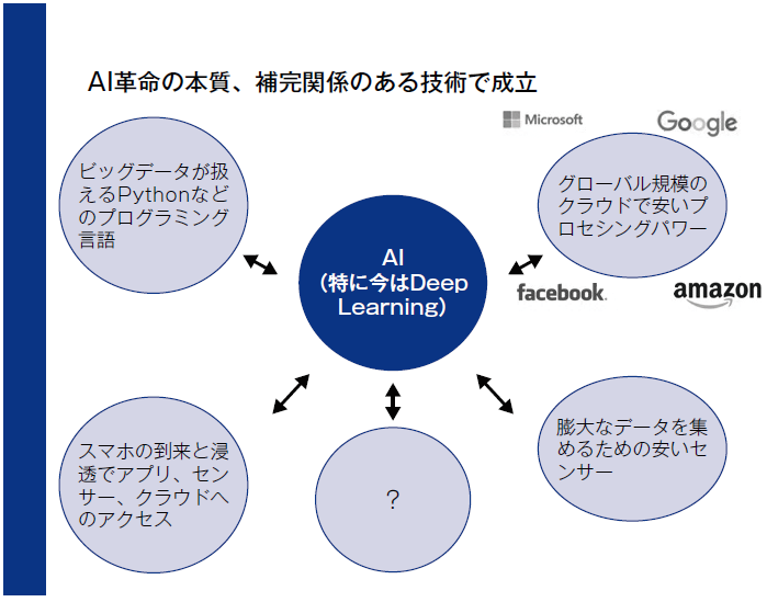 NIRAオピニオンNo.51 2020.07.03 「AI人材」育成の真価は課題設定能力シリコンバレーからAI革命の本質を踏まえて この記事は分で読めます シェア Tweet 櫛田健児 スタンフォード大学アジア太平洋研究所リサーチスカラー 概要 日本ではAI人材の教育が注目されている。政府は「AI戦略2019」を発表し、一部の大企業もAI人材育成に力を入れ始めた。新型コロナウイルスによって世界経済が大不況に突入する2020年は、松下幸之助が「不況時こそ人材育成の好機」という言葉を残しているとおり、体力のある大企業にとって、人材育成に力を入れるタイミングだ。 しかし、AI人材育成の取り組みは、「AI人材」に対する正しい理解がなければ多大なリソースの無駄となる。日本が最も必要なAI人材は、世界のトップ企業のように優れた基盤のAIツールを開発する人ではなく、AIツールを使いこなす「リードユーザー」となるための経営層と現場の従業員だ。そのためには、文系の人も理系の人も「課題設定能力」を身につけなければならない。 「課題設定能力」とは、ペインポイント(課題)を、徹底的にユーザー目線で深掘りする能力である。では、「課題設定能力」をどう養うべきなのか。一つは、トップ大学が社会人向けの本質的な教育を企業相手に行っているExecutive Educationにより、外からみた視座、徹底したペインポイント発掘、そしてAI活用や基本的なデータサイエンス経営を学ぶことである。さらに、産学連携による共同研究や人材循環を通じ、トップ研究者に産業界の問題意識を共有させることで、意味のある価値を共に作り出せる可能性が高まる。政府や企業は、課題設定能力に重点を置き、「AIを活用できる経営人材こそ日本に必要なAI人材」という視座で人材育成に取り組むべきだ。 PDFで読む (1.0MB) INDEX 序論:注目される「AI人材」と育成計画 そもそも現在の「AI」とは:「知能」というラベルの誤解と危険 AIによる新しい価値創造のメカニズム、具体例 新技術の歴史と生産性:補完関係にある別の技術と、活用法の開発と発見 AIでの価値創造:補完関係となっている別の技術やビジネス 日本ではどのようにAIは価値になりうるか:プロセスの仮説 日本がリードユーザーになるポテンシャル 真のAI人材は「課題設定能力」が高い人、ペインポイントの考え方 トップのAI人材を作り出す産学連携の仕組み 大学での「AI人材」育成の最前線、シリコンバレーとアメリカトップ大学 AI人材の議論の根底:「価値」を作ること、IT革命の本質 まとめ 序論:注目される「AI人材」と育成計画 日本では最近AI人材が注目され、政策面ではかなりの本気度をうかがわせる戦略を政府は発表している。その内容は世界を見渡してもかなり積極的なもので、紙面のトップに「AI人材25万人育成計画」という見出しで載った。それは、「統合イノベーション戦略」(2018年6月15日閣議決定)に基づいて、内閣官房長官を議長とする戦略推進会議が策定した「AI戦略2019」のことである(2019年6月11日公表)。 その中で、2025年に達成を目指している複数の目標には、1 )全ての高校卒業生が「理数、データサイエンス、AI」について基礎的な知識を習得することや、2 )データサイエンスとAIを理解して専門分野に応用できる人材を年に25万人育成し、3 )データサイエンスとAIを駆使して世界で活躍できるレベルの人材を毎年2,000人発掘・育成し、4 )そのうちの100人はトップクラスを目指すことが掲げられている。また、5 )社会人に対しても数理、データサイエンス、AIなどを毎年約100万人に教育するという計画が盛り込まれた(注1) 。 政府が積極的にバックアップして、日本が必要とする人材を育成するという「AI戦略2019」は、アメリカの「個人の市場価値は市場に任せるべきで、スキルは個人が自分で習得すべき」という、ハンズオフな基本スタンスとは大きく異なる。フィンランドやスウェーデン、デンマークといった北欧でみられる、手厚い人材育成サポートでハイエンドな付加価値を狙った取り組みに近い考え方である(注2)。こうした政策は、うまくいけば日本の強みになり、人材に投資しようという積極的な考え方の表れとして捉えることができる。 日本の大企業にも「AI人材」育成に力を入れているところが見受けられる。例えば、ダイキンは、2年かけて新入社員100人をAI人材に作り上げるというプログラムを実行中である(注3)。そのほかにも、オリンパスやキヤノン、コニカミノルタといった会社を始め、数多くの日本企業が「AI人材育成」の計画を立てている(注4)。既存の人材を切り捨てて新しく雇うだけではなく、育成しようという日本らしい取り組みである。 しかし、こうした「AI人材育成」の取り組みも、もう一歩踏み込んで具体的に考えていかないと多大なリソースの無駄になりかねない。そもそも、1 )現在、AIはどのように価値を作っているのか、2 )世界のトップ企業はどのような方法でAI人材を育成しているのか、あるいは雇っているのか、3 )世界のトップ大学はど