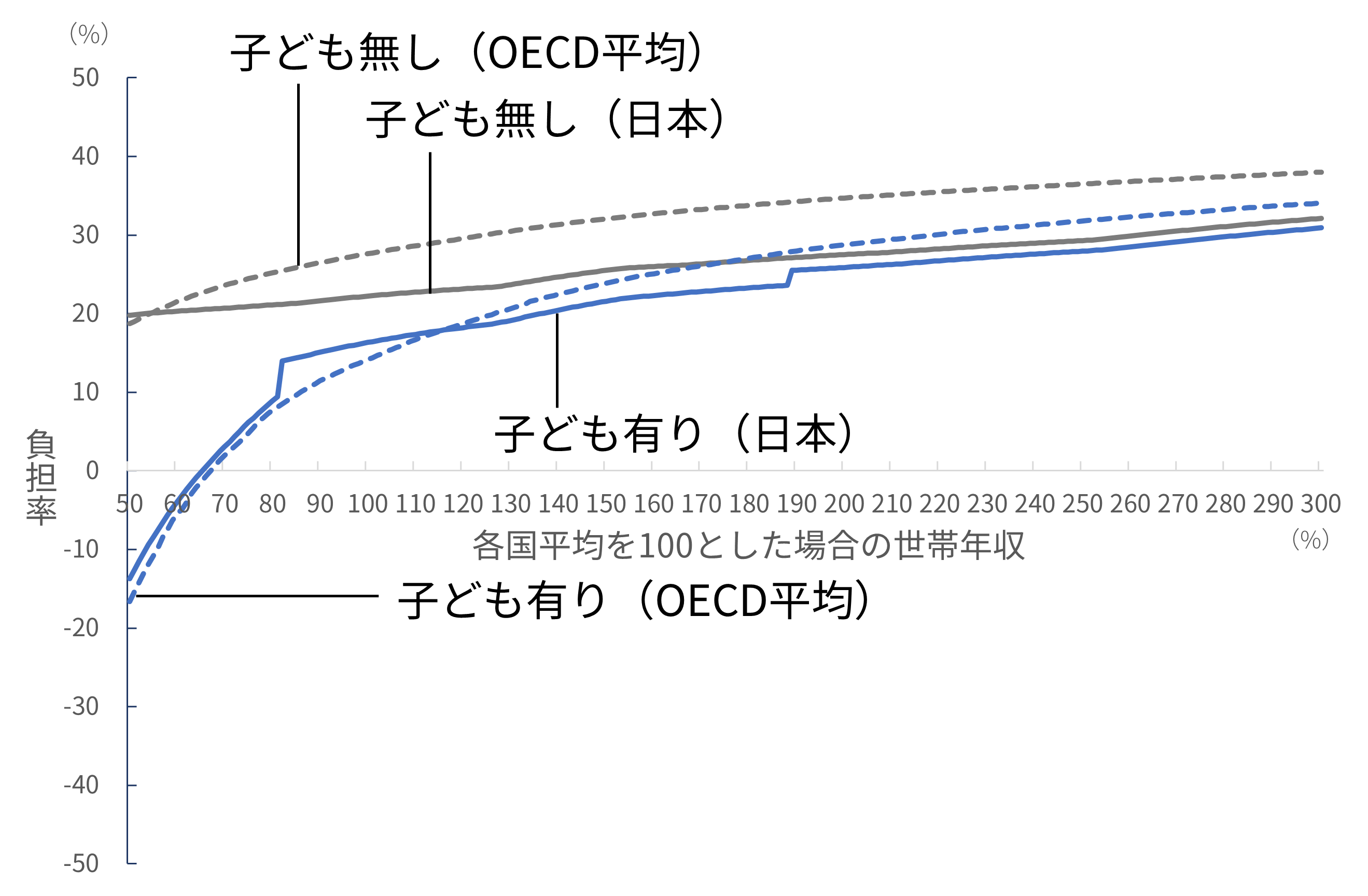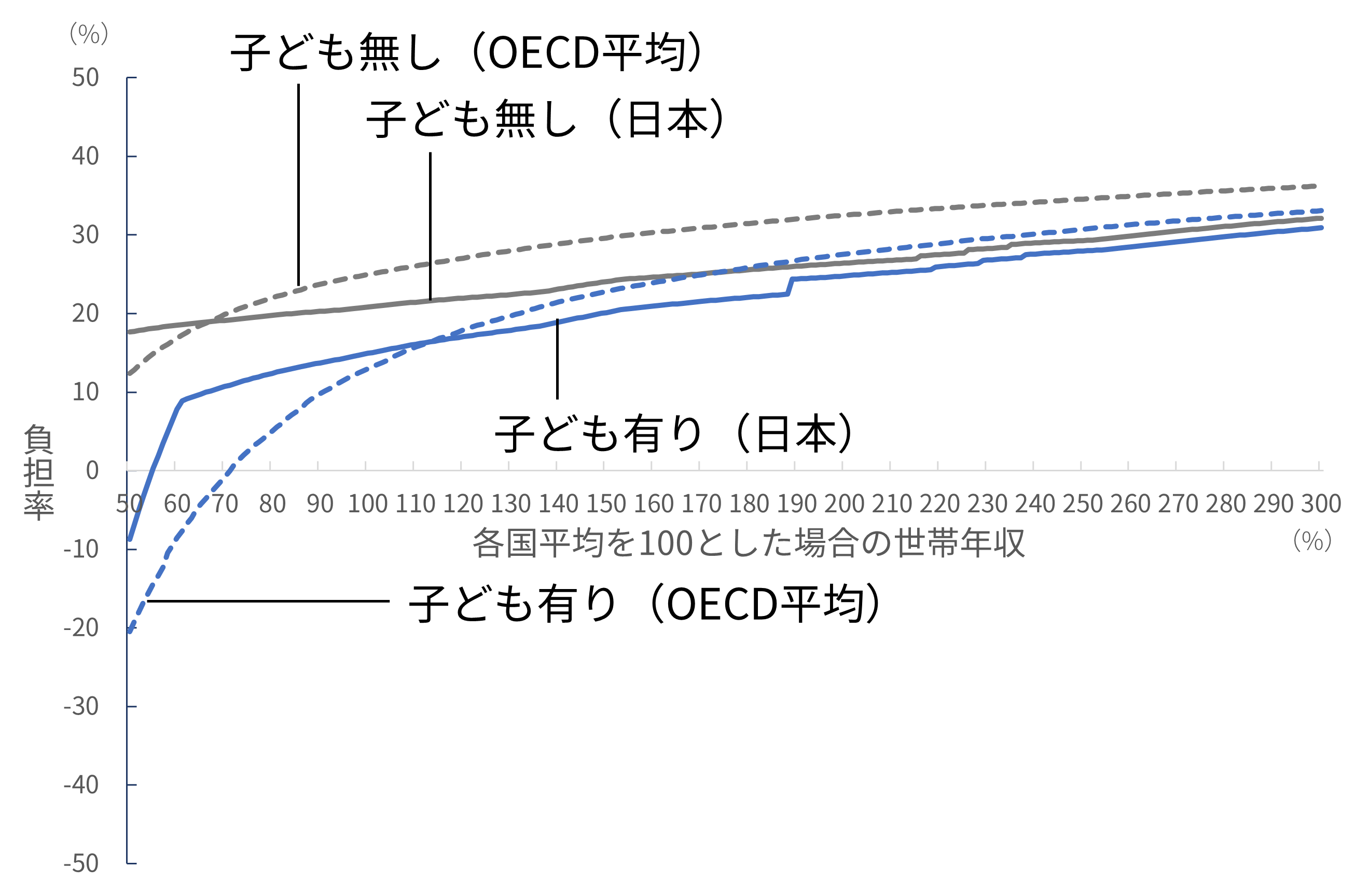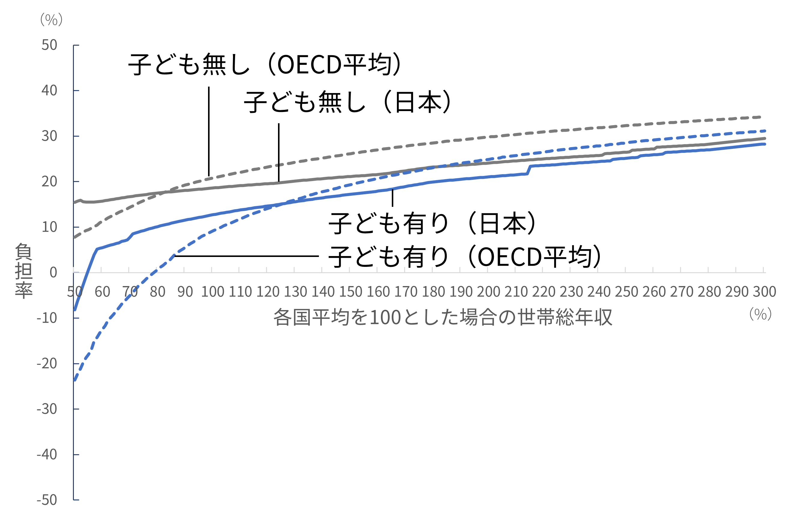 English version NIRAオピニオンNo.65 2023.05.16 子育て世帯の負担と給付の公正性は確保されているか被雇用者世帯の所得と負担率の国際比較分析 この記事は分で読めます シェア Tweet 翁百合 NIRA総合研究開発機構理事/日本総合研究所理事長 概要 少子化対策や女性活躍を後押しするためには、若者の所得を増やして将来不安を軽減することや、社会保険制度を働き方に中立的になるように設計することが重要である。こうした課題への政府の対応はまだ不十分であり、特に世帯単位でみた場合に税や社会保険料の負担や手当などの給付が公正なのかについては、本格的な検討や議論も行われていない。本稿は、税と社会保険制度の負担、児童手当などの給付の望ましい在り方を検討するため、OECDのモデルを用いて、被雇用者世帯の税や社会保険料の負担および給付を、国際比較を含むさまざまな角度から分析した。 分析の結果、日本は所得水準に応じた世帯の負担率に段差が存在し家計の行動に中立的になっていないこと、諸外国と比較して子どものいない世帯に比べて子どもがいる世帯への支援が薄いこと、そして、低所得層における負担率が他の所得層と比較して相対的に高いことが明らかになった。安心して子育てのできる環境を実現するには、負担と給付の公正性を確保する必要がある。そのためには、まずは低所得の子どもがいる世帯への支援を強化することが急務である。また、応能負担を強化するとともに、税や社会保険料の負担や手当などの給付を所得の一定水準で増減、廃止する手法も見直す必要がある*。 PDFで読む (1.8MB) PDF (English) (1.5MB) INDEX 1.はじめに 2.段階的にジャンプする日本の歪(いびつ)な負担率のカーブ 片働き世帯 共働き世帯 3.日本は子どもがいる低所得世帯の負担率が高い 片働き世帯 共働き世帯 大人1人世帯(単身世帯またはシングルマザー・シングルファザー世帯) 4.日本は低所得世帯の高い負担率、高所得世帯の低い負担率が特徴 大人1人世帯(単身世帯またはシングルマザー・シングルファザー世帯) 片働き世帯 共働き世帯 5.低所得の子育て世帯への支援が急務―応能負担を基本とした税と社会保険料負担および児童手当の設計の見直しを 1.はじめに 日本の少子化に歯止めがかからない。原因のひとつに、若者層の所得が低く、子育ての負担が大きいことがあると指摘されている。経済の低成長が続く中、将来に明るい展望が持てず、若年層の不安が広がっている。他方で、女性の労働参加が進んでいるが、社会保険、そして政府・自治体や個別企業が支給する手当といった制度が、働き方に中立な仕組みになっておらず、女性の働き方に制約を及ぼしている可能性がある。例えば、社会保険料の「年収の壁」などの問題である。すなわち、妻の所得がある水準を超えると、妻自身が社会保険料を支払うためにかえって手取り額が減少してしまい、共働き世帯の女性が、あえて労働時間を抑制し、所得増加の機会を逃しているとされる。 従前から政府は、少子化対策や女性活躍を旗印として掲げてはいるものの、働き方に中立的な制度への改革は実行に移されていない。現政権が取り組んでいる「人への投資」を、希望する就労や生き方へとつなげるためにも、若者の所得を増やして将来不安を軽減し、公正な税と社会保険制度、手当の仕組みを設計することが重要である。 本稿では、税と社会保険料の負担、手当などの給付の望ましい在り方を検討するために、日本の家計の実態をさまざまな角度から分析し、国際的な視点から浮かび上がる日本の特徴を指摘したうえで、今後の課題を提起する。具体的には、国際比較が可能な被雇用者の子育て世帯や共働き世帯への税と社会保険料の負担、手当などの給付がどうなっているのか、また、政策的な配慮がどの程度なされているのかを分析し、それによって女性の労働参加をはじめ人々の行動にどのような影響を与えているかについて考えていくこととする。 もっとも、公正性を取り上げるのであれば、以前から指摘されている国民年金第3号被保険者で、仕事をしていない専業主婦が、夫が保険料を支払うことにより基礎年金の支給を受けられるといった問題や、夫婦で遺族年金に差があるといった問題を、議論すべきであることはいうまでもない。しかしながら、それらの問題を完全に解決するには年金制度全体の抜本的な議論を要する。そのため、ここでは早急に検討すべき課題として、世帯の収入と税・社会保険料・給付の関係における不公正の是正に絞って話を進めることとする。 また、2014年に実施された社会保障と税の一体改革は、社会保障制度を維持するために消費税率を引き上げるという国全体でみた財源の確保を目的とした改革であった。だが、世帯単位でみたときに、税と社会保険料が適正な負担となっているかどうかについては、本格的な検討や議論が行われずに今日に至っている。そのため、本稿では、特に世帯別にみた税と社会保障の