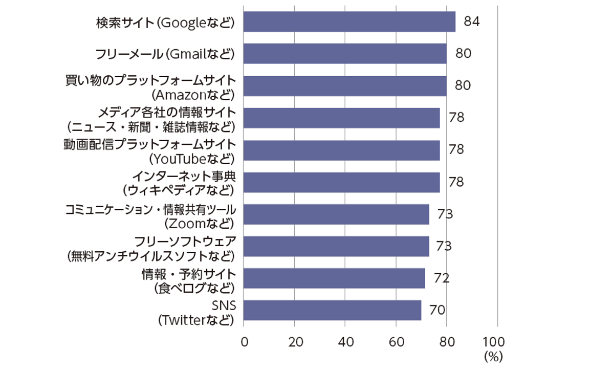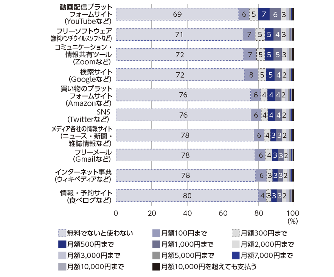 English version NIRAオピニオンNo.66 2023.05.19 大きく前進するデジタル経済をどう計測するかGDPの限界と新たな統計の試み この記事は分で読めます シェア Tweet 大久保敏弘 慶應義塾大学経済学部教授 概要 デジタル経済が広く浸透するなか、その経済活動をどう把握するか。「デジタル経済の計測」が国内外で議論されている。特に既存の代表的な経済指標であるGDP(国内で生産されたモノやサービスの付加価値の合計額)では計測困難な無料のデジタルサービスをどう捉えるかが焦点の1つだ。 本稿では、無料のデジタルサービスの価値を消費者の支払い意思額から検討する。就業者実態調査の結果に基づき、企業がデジタルサービスを有料化した場合の市場規模を試算すると、独占価格の仮定では、各種デジタルサービスは年間840〜950億円規模になり、例えば10種類のデジタルサービスを合わせるとおよそ9,000億円程度となった。 正確な統計がなければ国の現状はわからず、統計の衰退は国の衰退につながる。既存統計を維持しつつ、デジタル経済を多元的に計測する新たな統計の構築が喫緊の課題だ。データは世の中に散在しており、民間データの活用や、データ市場を構築してデータ売買の動きを捕捉するなど、官民挙げての様々な試行錯誤が求められる*。 PDFで読む (1.2MB) PDF (English) (1.2MB) INDEX 1.多岐にわたる分野でデジタル経済が浸透 2.GDPの限界と代替指標 3.デジタル経済の実態を十分捉えられない既存の統計 4.デジタル経済をどうとらえるのか 5.無料デジタルサービスの市場規模の試算:有料化すると各デジタルサービス月額2,000円~1万円、市場規模は840~950億円規模 6.新しいデジタル経済の実態に合わせた統計作りと既存統計の維持の重要性 1.多岐にわたる分野でデジタル経済が浸透 これまでも経済のデジタル化は着実に進行していたが、2020年以降のコロナ禍でその進行スピードは加速している。働き方について言えば、テレワークが浸透して、Zoomなどのオンライン会議ツールによる打ち合わせが日常的になった。企業で使われる資料も紙媒体から電子データへの移行が進んでいる。行政関連の手続きや各種生活サービスについてもオンラインから登録・予約申込ができるものが増えており、金融機関によるインターネットバンキングや、スーパーをはじめとした店舗でのレジ自動化や電子決済はもはや常識になりつつある。外食の注文・配達、レストランや美容院の予約、日々の買い物、書籍・音楽・動画の視聴など、さまざまなサービスをオンラインで利用している方も多いだろう。 こうしたデジタル化の流れをさらに加速させるのが、AI(人工知能)だ。自動化家電は急速に高度化しており、近い将来には完全自動運転も実現すると言われている。2022年には、AIを用いたチャットサービスのChatGPTが登場し、世界中の注目を集めることになった。 経済のデジタル化は、社会のあらゆる面について広く浸透し、生活の利便性は飛躍的に向上している。デジタル経済の実態を把握するため、大久保敏弘研究室とNIRA総研は共同で「テレワークに関する就業者実態調査」を9回にわたって行ってきた(注1)。図1は日常生活でのデジタル化の進展の同調査結果を時系列に並べたもので、コロナ禍前の2019年12月から2022年12月まで、1年ごとの推移が分かる。急激な変化はないものの、全体としては着実に経済のデジタル化が進んできていることが見て取れる。 図1 デジタル経済の浸透(クリックすると拡大します。) (注)2022年12月、2021年12月の結果は、「テレワークに関する就業者実態調査」の第8回調査結果(2022年12月から2023年1月に実施、n=9,804)、2020年12月、2019年12月の結果は第3回調査結果(2020年12月に実施、n=10,523)。 決済についてみると、クレジットカード決済はコロナ禍前から既に70%を超える人が利用していた(「よく利用している」と「ときどき利用している」の合計、以下同)。一方でデビットカードの利用は15%弱でコロナ禍でも利用に伸びが見られない。伸び率が大きいのがフィンテック(PayPayなどのキャッシュレス決済)で、コロナ禍前の38%から2022年末には50%にまで上昇している。このようにデジタル決済の利用は伸びているのに対して、現金の利用は81%から70%にまで減少している。コロナ禍で現金決済からデジタル決済、特にフィンテックに移行したことが分かる。 生活サービスについていえば、デジタルプラットフォームを利用した買い物やデリバリーサービスは着実に浸透しているようだが、シェアリング・エコノミー(宿泊、自転車や車など)は全体で見るとまだまだ少ない。 調査結果をさらに精査すると、「よく利用している」と答えた人の比率が時系列的に高くなっていることがわかる。図1から分かるようにクレジットカード決済、フィンテック、オンラインショッピング、インターネットバンキング、オンライン娯楽サービスでは「よく利用している」の増加傾向が顕著である。デジタルサービスは、一度使いだすと便利なため頻繁に使う