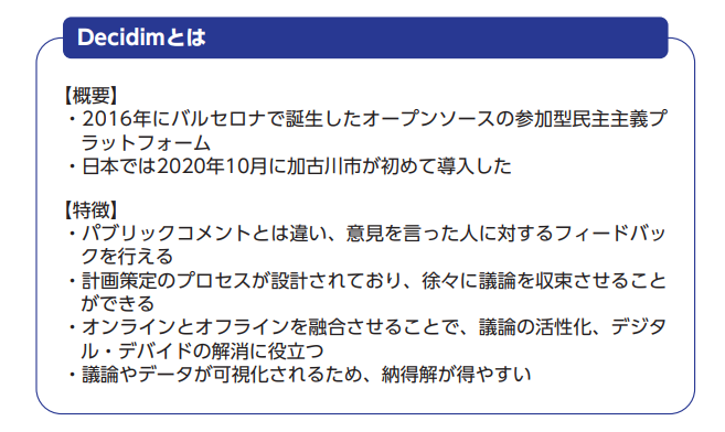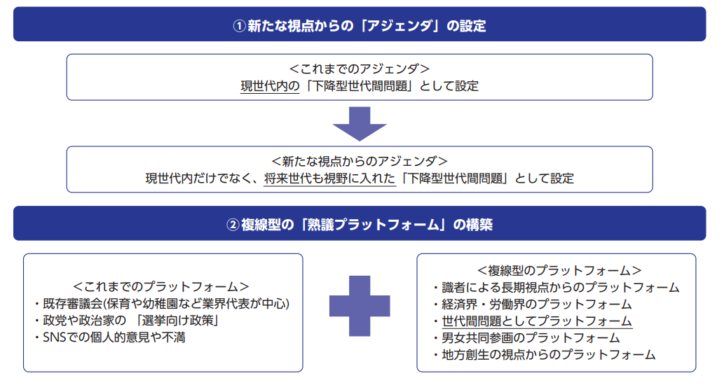 English version NIRAオピニオンNo.69 2023.06.23 少子化政策に関する合意形成は可能か参加型民主主義プラットフォームの構築 この記事は分で読めます シェア Tweet 谷口将紀 NIRA総合研究開発機構理事長/東京大学教授 概要 NIRA総研が2023年2月4日に開催したNIRAフォーラム2023では、テーマ1として「熟議民主主義」について議論した。考え方に大きな世代間格差が存在する少子化政策について合意に達するには、人びとの間での熟議が不可欠である。どうすれば熟議を経た政策決定の仕組みができるか。 1つは、新しい視点からの「アジェンダ設定」である。例えば、子育て支援では「人口減少」に直結する問題を設定し、従来の「現世代内」の問題設定でなく、「将来世代も視野に入れた」設定に変化させることが重要である。アジェンダ設定能力を持つ代表的なアクターとしてメディアがあるが、そこでの人材の成熟も不可欠である。 もう1つは、「熟議プラットフォーム」の再構築であり、IT技術の寄与も期待される。兵庫県加古川市では、インターネットプラットフォームを活用した熟議の実践例がある。このような熟議は、国全体レベルの政策課題の場合には難しい面もあるが、地方自治体主導での熟議が国政レベルの議論につながる可能性もある。 他方、政治が安定的で政権交代がほぼ起きず、行政が現場から得られる生きた情報を政治にぶつける力が弱まっているといった現状の日本の統治システム自体が、熟議による政策決定を阻んでいる懸念もある。 PDFで読む (1.1MB) PDF (English) (555.2KB) INDEX 新たな視点からの「アジェンダ設定」と「熟議プラットフォーム」の再構築 人びとが社会問題について「共通認識」「当事者意識」を持つために アジェンダ設定に必要なメディア、団体、人材の成熟を 参加型⺠主主義プラットフォームを活用した兵庫県加古川市の実践例と期待 参加型⺠主主義プラットフォームのバージョンアップを 統治システムの再考を 熟議の仕組みを民主主義に取り入れる NIRAフォーラム2023「テーマ1:熟議民主主義」参加者・秋山咲恵 サキコーポレーションファウンダー・上田健介 上智大学教授・大西祥世 立命館大学教授・奥村裕一 オープンガバナンスネットワーク代表理事・嶋田博子 京都大学教授・芹川洋一 NIRA総研研究評価委員/日本経済新聞社論説フェロー・曽我部真裕 京都大学教授・高安健将 成蹊大学教授・多田 功 加古川市役所企画部政策企画課スマートシティ推進担当課⾧(当時)・谷口将紀 NIRA総研理事⾧/東京大学教授・田村哲樹 名古屋大学教授・野中尚人 学習院大学教授・古田大輔 ジャーナリスト/メディアコラボ代表取締役・三神万里子 ジャーナリスト・山崎史郎 内閣官房参与兼内閣官房全世代型社会保障構築本部総括事務局⾧(敬称略・五十音順) 近年、政治参加を求める市民の声が世界的に高まっている。様々な社会問題に対する健全な世論を形成するには、人びとが互いに意見を交わすことが期待される。NIRAフォーラム2023「テーマ1:熟議民主主義」では、人びとによる熟議の成果を、議会を通じて公式な意思決定の場につなげ、政策に反映させるための仕組みづくり、ひいては新しい民主政治の在り方について議論した(注1)。 新たな視点からの「アジェンダ設定」と「熟議プラットフォーム」の再構築 社会保障政策の目的は、個人の生活上にあるリスクに対して、連帯し支えることである。その最大の問題は「お金を出す人たちが、本当に納得して出してくれるのか」ということだが、人びとが負担することを納得した上で合意し、連帯しているようには見えない。特に子育てや少子化政策に対しては、考え方に大きな世代間格差が存在する。合意に達するには、人びとの間での熟議が不可欠だ。どうすれば熟議を経た政策決定の仕組みができるかを考えなければならない。 介護保険制度、子育て支援といった社会保障政策に携わってきた内閣官房参与兼内閣官房全世代型社会保障構築本部総括事務局長を務める山崎史郎氏はこのように問題を提起した。山崎氏は、自らの経験に基づき、介護と子育てという社会保障政策における2つの事例を取り上げる。 介護保険制度の整備は、様々なステークホルダーが複線的、つまり様々な場所で政策に関する熟議を重ね、国民的合意に至ったいわば「成功例」である。そもそも介護保険の背景にある高齢化問題は、「遡上型世代間問題」であり、誰しも将来老いて経験することが予想できる、アジェンダ設定がしやすい問題である(注2)。それゆえ、人びとは当事者意識を持ちやすく、「共感」、「責任感」、「使命感」といった意識が醸成された。 一方で、子育て支援は、「下降型世代間問題」であり、男性や企業は「無関心」であることも珍しくない。子育てを終えた世代にとっては、子育てに従事した時代背景が異なることから、「共感」、「責任感」、「使命感」が醸成されにくい。このため、世論は盛り上がりに欠け、熟議がなされず、人びとの考え
