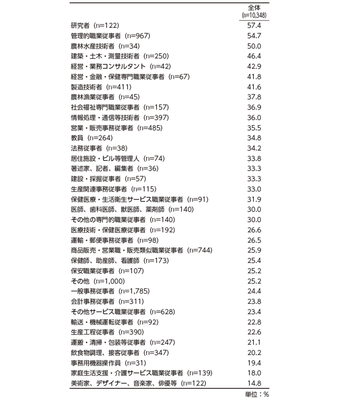NIRAオピニオンNo.73 2023.10.24 脱炭素社会実現に向けたグリーンジョブの推進就業者実態調査から見る現状と課題 この記事は分で読めます シェア Tweet 大久保敏弘 NIRA総合研究開発機構上席研究員/慶應義塾大学経済学部教授 概要 先進各国では地球温暖化・気候変動への対策が活発化しており、カーボンニュートラル、脱炭素社会実現への対策を講じている。多くの諸外国はグリーン産業への投資、税制優遇措置等を通じてグリーン経済の拡大を目指すが、同時に、グリーンジョブのスキルを持った労働者の育成にも取り組んでいる。日本も、従来型の「マクロ政策としての公共投資」だけでなく、「ミクロ政策としての人への投資」を進めることで、環境と働き方の好循環を起こす必要がある。 就業者実態調査の結果からは、日本の就業者の31%がグリーンジョブをしていることがわかった。また、グリーンジョブに従事している就業者の労働時間に占めるグリーンジョブの時間は25%であった。グリーンジョブへの就業者割合が高い欧州の国と比べると、日本の同割合は低く、伸びしろは大きい。グリーンジョブは賃金が高く、働く人の満足度も高くはあるが、グリーンジョブに求められるスキルは高度である。 グリーンジョブを推進するためには、グリーンジョブに求められる訓練メニューを明らかにし、グリーンジョブへの転換を希望する就業者が、適切な訓練を受け、必要なスキルを修得する支援が不可欠だ。政府には、就業者にリスキルの機会とインセンティブを与えることが求められる*。 PDFで読む (1.3MB) INDEX 1.日本におけるカーボンニュートラル、脱炭素社会実現の動き 2.「人への政策」の必要性 3.グリーンジョブの実態調査 ①グリーンジョブの割合 ②グリーンジョブへの労働時間の割合 ③職種別グリーンジョブ 4.グリーンジョブを行っている人の賃金や仕事満足度は高いのか? 5.どのようにしてグリーンジョブを増やしていくのか?「人への政策」の推進 1.日本におけるカーボンニュートラル、脱炭素社会実現の動き 2015年に採択されたパリ協定を受けて、各国では地球温暖化・気候変動への対策が活発化している。代表的なものが、温室効果ガス削減のためのカーボンニュートラルの推進・脱炭素社会の実現である。 こうした状況において、日本の取り組みは世界的に注目されている。これは、日本が過去の高度成長期における公害問題やオイルショックを経験したことで、巧みな環境規制や政策を行うようになり、その結果、企業が高度な環境技術や省エネ技術を持つに至ったからだ。 だが、近年のデジタル経済の拡大に伴い、日本では電力消費が増加している。特に、東日本大震災後は化石燃料を主体とした発電が中心となり、それが温室効果ガス排出量の大幅な増加につながっている。また、環境対策は、省エネや温室効果ガスの排出削減だけではない。リサイクル、生物多様性、生態系保全、エシカル消費など、多岐にわたる分野があり、日本が取り組まなければならない課題は数多い。 2020年10月、菅義偉政権(当時)は「2050年カーボンニュートラル」を掲げ、脱炭素社会を実現するための具体的なグリーン成長戦略を提示した。「環境と経済の好循環」のための新しい産業政策として、洋上風力・太陽光・地熱や水素、原子力、食料・農林水産業、半導体・情報通信、住宅、物流、自動車・蓄電池、船舶、航空機など14の重点分野を中心に補助金、税制改革、規制改革などの施策が進められる予定である。省エネを徹底し、水素や洋上発電などの再生可能エネルギーを拡充するとともに、次世代型太陽電池やカーボンリサイクルの分野でイノベーションを起こすことを目指す。さらに、環境投資のための金融市場の整備も進められるという。 この戦略に応じた多くの自治体は2050年二酸化炭素排出実質ゼロを表明、多くの大企業もカーボンニュートラル宣言をするなど、環境対策への機運が高まっている。 一方、EUや英国、米国も、2050年に向けたカーボンニュートラルを宣言し、環境政策を進めている。政策目標や方向性は日本と同じだが、具体的な戦略や取り組みは各国の実情に合わせて異なっている。 例えば、EUは「欧州グリーンディール投資計画(EGD)」を定め、2030年までの温室効果ガス排出を1990年比で55%削減する目標を掲げている。この実現に向けた資金として1兆ユーロの投資の動員を目指す。また、英国は2021年に「ネットゼロ戦略」を策定。10分野について重点的な投資を行うことで、2030年までに900億ポンドのグリーン投資の誘発、イノベーションの促進、雇用創出44万人、温室効果ガス累計1.8億トン削減を目指す。EUや英国の戦略は、炭素排出量の大きい産業から転出する労働者のリスキリングを政府が支援して、円滑な労働移動を後押しするというもの。例えば、英国では雇用創出目標を設定している。その戦略は日本と概ね似ているが、「グリーンジョブ」の創出と推進を掲げており、日本の戦略とはやや異