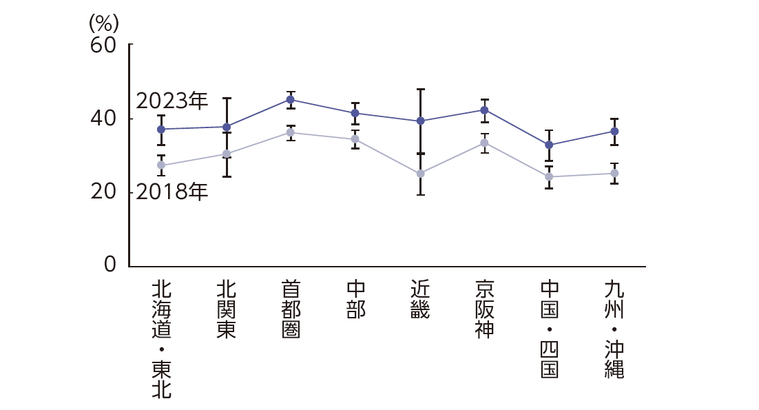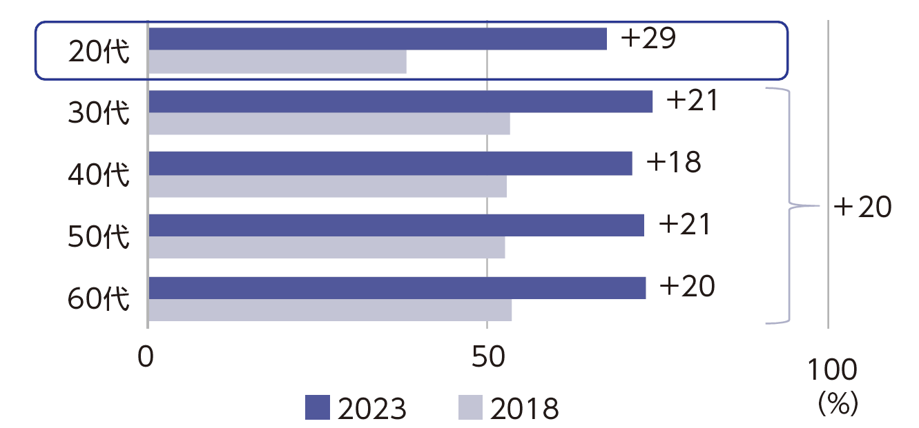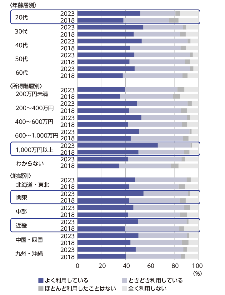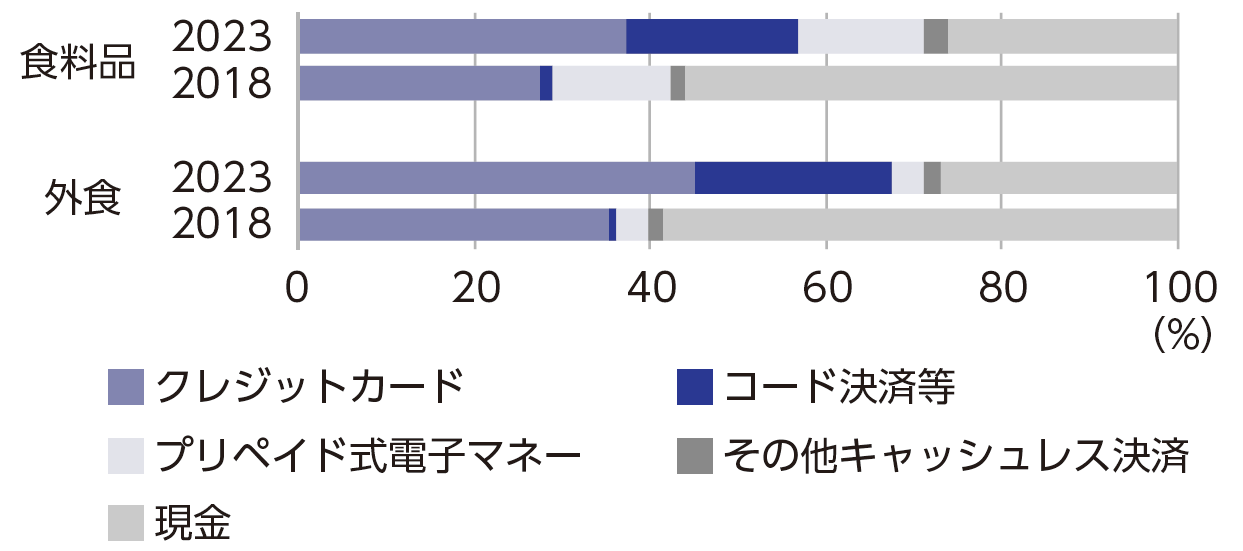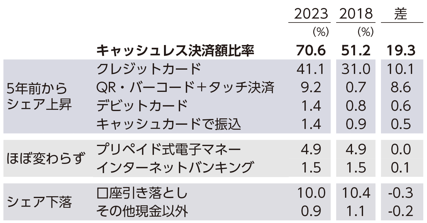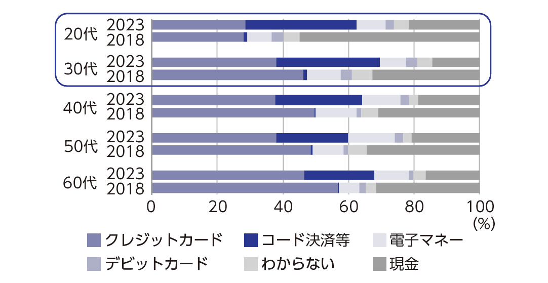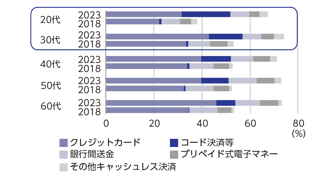 NIRAオピニオンNo.75 2024.01.04 大きく進捗したキャッシュレス決済コード決済の普及で若年層の現金決済志向は低下 この記事は分で読めます シェア Tweet 翁百合 日本総合研究所理事長/NIRA総合研究開発機構理事 概要 2018年からの5年間でキャッシュレス決済は大幅に増加し、決済額ベースでは7割を超えるまでになった。政府のキャッシュレス推進策とコロナ禍での人びとの行動変容に加えて、この間に多くのプラットフォーム事業者が加盟店開拓やポイントを活用した積極的な顧客開拓を目指して競争したことが奏功したと考えられる。 キャッシュレス決済額比率は、この間急速に普及したスマホで簡易に決済が行える、QRコード・バーコード決済およびタッチ決済(以下「コード決済等」)と、クレジットカード決済の利用拡大で上昇した。コード決済等は地域に関わりなく、どの年齢層・所得層でも広がったが、特に若年層に普及し、その現金決済志向を大きく変化させた。また、クレジットカード決済は若年層と低所得層の利用が進んだ上、Eコマースの広がりもあって、高齢層や高所得層にも浸透している。課題とされていた低所得層のキャッシュレス比率の低さは、この5年間でかなり解消されたと評価できる。他方、まだキャッシュレス比率が低いのは、医療・介護などの分野や個人送金であり、今後の一層の進展が期待される。 人手不足が深刻化するにつれて、企業としても生産性向上が大きな課題となっており、キャッシュレス化は今後も進むことが予想される。一方で、キャッシュレス化とともに、セキュリティの確保や個人情報の適切な管理と活用が、民間事業者にとってますます重要な課題となっている*。 PDFで読む (1.7MB) INDEX はじめに 1.低所得層と若年層で大きく進捗したキャッシュレス決済 2.コロナ禍の影響を受けた5年間の特徴的な動き (1)コード決済等が若者層をはじめ全世代、全所得層で広がり、現金決済からコード決済等へ明確にシフト (2)クレジットカード決済は、低所得・高所得層と若年層・高齢層で広がり (3)地域間のばらつきはやや縮小したが残存 3.ポイント利用の分析 4.キャッシュレス化の今後の展望と課題 はじめに 本稿では、2023年と2018年に実施した「キャッシュレス決済実態調査」に基づき、ここ5年間の消費者のキャッシュレス決済動向の変化を分析し、今後の課題について考察する(注1)。 2018年の調査を基に執筆したNIRAオピニオンペーパーNo.42(2019年2月)では、キャッシュレス化を国民全体に浸透させるには、次の3点が重要であると指摘した。①低所得層への普及、②郵便・医療介護といった公的色彩の強いサービスのキャッシュレス化の実現、③民間企業間での、付加価値の高いサービスを提供するための「競争」および個人間小口送金などのインターオペラビリティ(相互運用性)の高いサービスを構築するための「協調」の促進―である。利便性の高いデータ利活用社会を構築するためには、これらの課題への取り組みが不可欠である。 その後、キャッシュレス決済にポイントを付与するといった政府の推進策に加えて、2020年以降のコロナ禍がキャッシュレス化を後押しすることになった(注2)。そこで、本稿ではキャッシュレス化の進展の状況やその背景を分析した上で、5年前に提示した上記課題が解消に向かっているかについて確認し、残る課題を指摘することとしたい。 1.低所得層と若年層で大きく進捗したキャッシュレス決済 まず、図1の通り、コロナ禍(2020年1月~2023年5月)もあってキャッシュレス決済額比率は51%から71%に大きく増えた(注3)。内訳を見ると、その増加はクレジットカード決済、QRコード・バーコード決済およびタッチ決済(以下「コード決済等」という)でそのほとんどを説明できる(注4)。 図1 2018年と2023年のキャッシュレス決済額比率の変化 (注)QRコード・バーコード決済およびタッチ決済は、2018年調査では「プリペイド式電子マネー以外のフィンテック決済」としてたずねたもの。数値は小数点第2位以下を四捨五入。(出所)NIRA総合研究開発機構(2018、2023)「キャッシュレス決済実態調査」を基にNIRA作成。以下、図の出所は全て同じ。 所得階層別に見ると、図2の通りキャッシュレス決済額比率は全階層で上昇したが、200万円以上の所得階層での増加が18%ポイント程度(除く「わからない」回答者層)であるのに対し、200万円未満の低所得層が24%ポイントも増えている。この結果、所得階層別のキャッシュレス決済額比率の差異が5年間でかなり小さくなってきた。 図2 所得階層別のキャッシュレス決済額比率の変化 (注)グラフ右側の数値は所得階層別のキャッシュレス決済額比率の変化幅(%ポイント)を表す。 年齢層別では、20代以外の年齢層のキャッシュレス決済額比率が20%ポイント程度の上昇であるのに対し、20代では29%ポイントも上昇している(注5)(図3)。このことが、上記の低所得層のキャッシュレス決済額比率の上昇にも寄与していると考えられる。 図3 年齢層別に見たキャッ