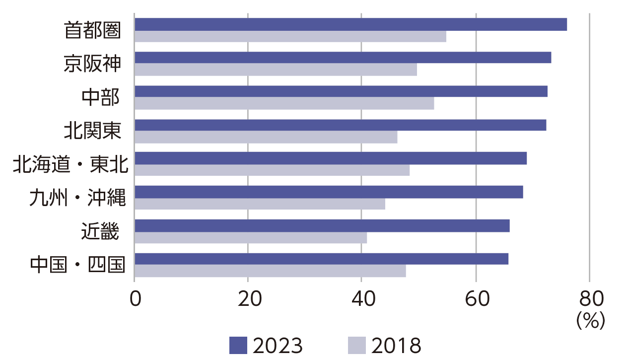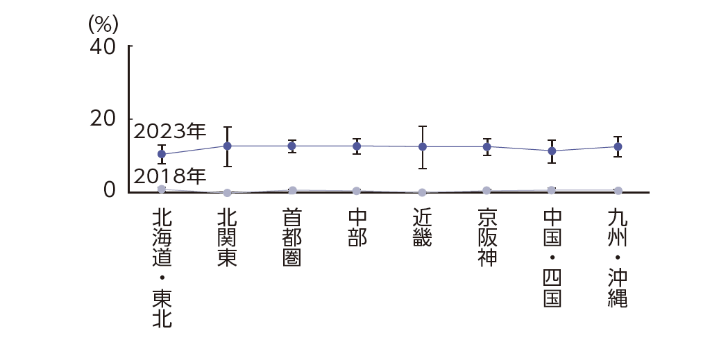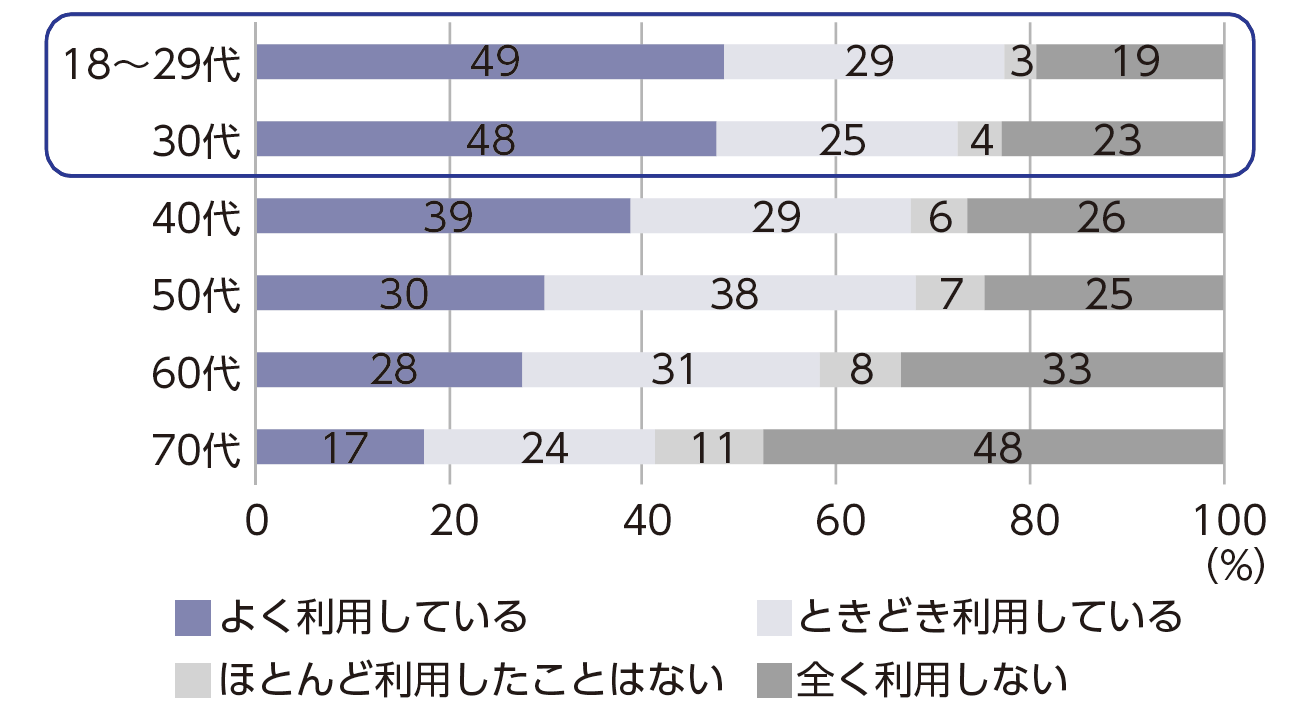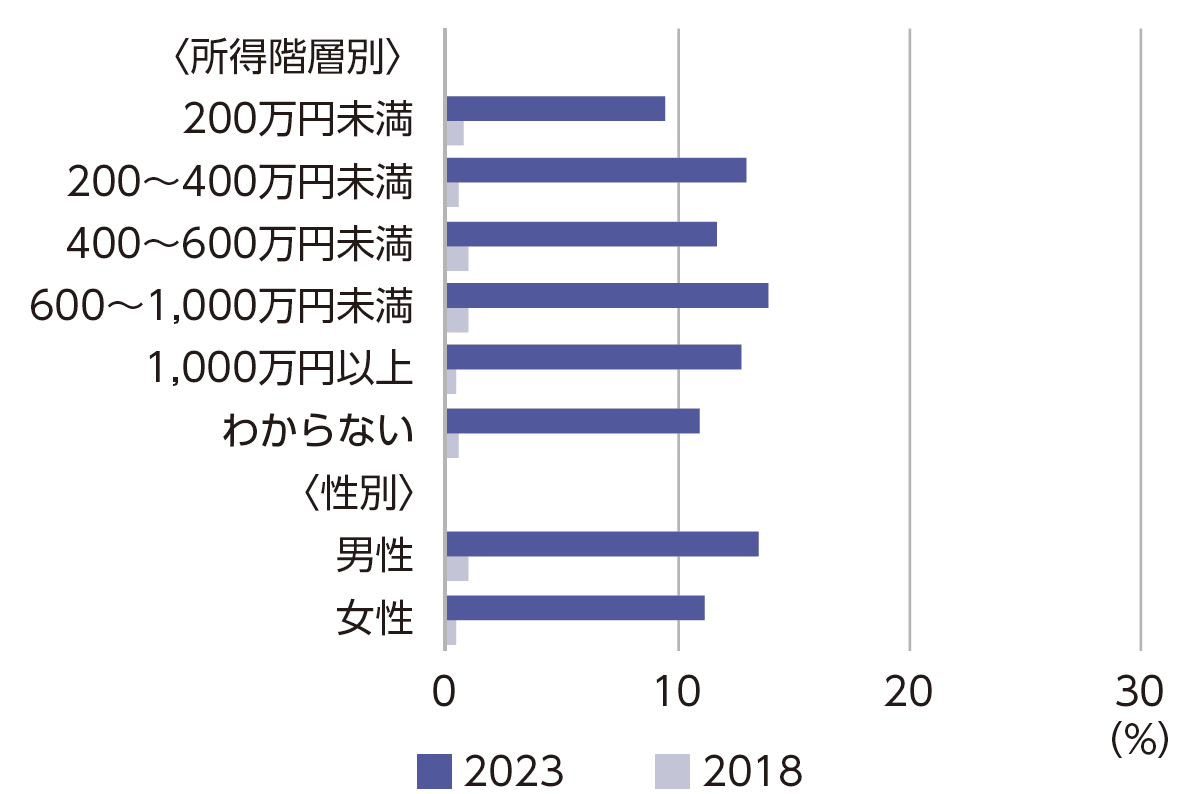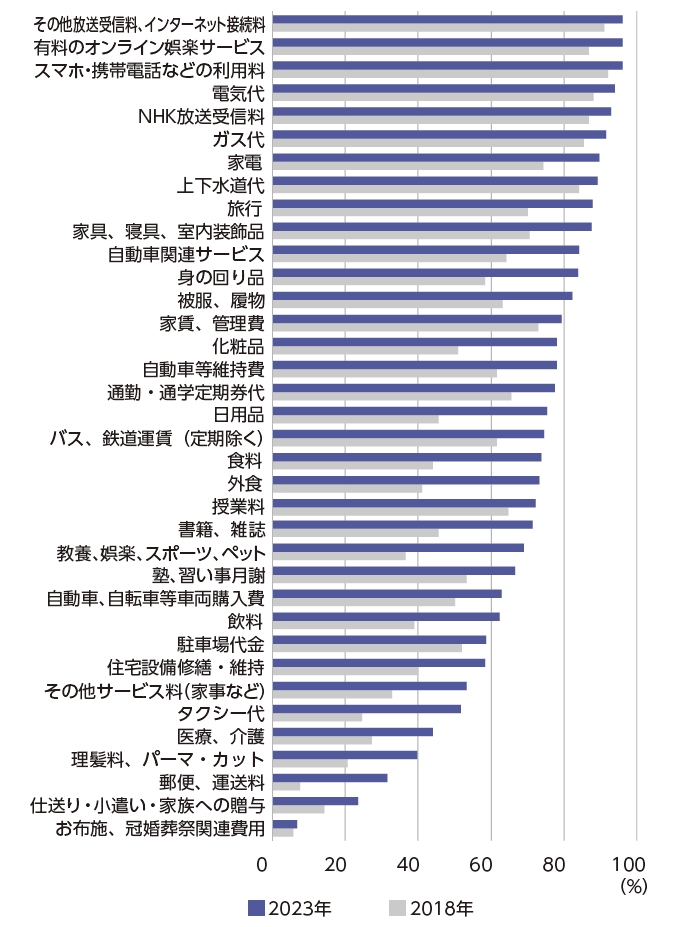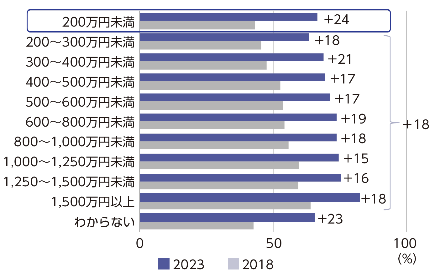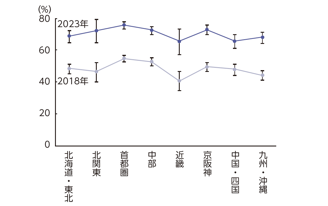 NIRAオピニオンNo.75 2024.01.04 大きく進捗したキャッシュレス決済コード決済の普及で若年層の現金決済志向は低下 この記事は分で読めます シェア Tweet 翁百合 日本総合研究所理事長/NIRA総合研究開発機構理事 概要 2018年からの5年間でキャッシュレス決済は大幅に増加し、決済額ベースでは7割を超えるまでになった。政府のキャッシュレス推進策とコロナ禍での人びとの行動変容に加えて、この間に多くのプラットフォーム事業者が加盟店開拓やポイントを活用した積極的な顧客開拓を目指して競争したことが奏功したと考えられる。 キャッシュレス決済額比率は、この間急速に普及したスマホで簡易に決済が行える、QRコード・バーコード決済およびタッチ決済(以下「コード決済等」)と、クレジットカード決済の利用拡大で上昇した。コード決済等は地域に関わりなく、どの年齢層・所得層でも広がったが、特に若年層に普及し、その現金決済志向を大きく変化させた。また、クレジットカード決済は若年層と低所得層の利用が進んだ上、Eコマースの広がりもあって、高齢層や高所得層にも浸透している。課題とされていた低所得層のキャッシュレス比率の低さは、この5年間でかなり解消されたと評価できる。他方、まだキャッシュレス比率が低いのは、医療・介護などの分野や個人送金であり、今後の一層の進展が期待される。 人手不足が深刻化するにつれて、企業としても生産性向上が大きな課題となっており、キャッシュレス化は今後も進むことが予想される。一方で、キャッシュレス化とともに、セキュリティの確保や個人情報の適切な管理と活用が、民間事業者にとってますます重要な課題となっている*。 PDFで読む (1.7MB) INDEX はじめに 1.低所得層と若年層で大きく進捗したキャッシュレス決済 2.コロナ禍の影響を受けた5年間の特徴的な動き (1)コード決済等が若者層をはじめ全世代、全所得層で広がり、現金決済からコード決済等へ明確にシフト (2)クレジットカード決済は、低所得・高所得層と若年層・高齢層で広がり (3)地域間のばらつきはやや縮小したが残存 3.ポイント利用の分析 4.キャッシュレス化の今後の展望と課題 はじめに 本稿では、2023年と2018年に実施した「キャッシュレス決済実態調査」に基づき、ここ5年間の消費者のキャッシュレス決済動向の変化を分析し、今後の課題について考察する(注1)。 2018年の調査を基に執筆したNIRAオピニオンペーパーNo.42(2019年2月)では、キャッシュレス化を国民全体に浸透させるには、次の3点が重要であると指摘した。①低所得層への普及、②郵便・医療介護といった公的色彩の強いサービスのキャッシュレス化の実現、③民間企業間での、付加価値の高いサービスを提供するための「競争」および個人間小口送金などのインターオペラビリティ(相互運用性)の高いサービスを構築するための「協調」の促進―である。利便性の高いデータ利活用社会を構築するためには、これらの課題への取り組みが不可欠である。 その後、キャッシュレス決済にポイントを付与するといった政府の推進策に加えて、2020年以降のコロナ禍がキャッシュレス化を後押しすることになった(注2)。そこで、本稿ではキャッシュレス化の進展の状況やその背景を分析した上で、5年前に提示した上記課題が解消に向かっているかについて確認し、残る課題を指摘することとしたい。 1.低所得層と若年層で大きく進捗したキャッシュレス決済 まず、図1の通り、コロナ禍(2020年1月~2023年5月)もあってキャッシュレス決済額比率は51%から71%に大きく増えた(注3)。内訳を見ると、その増加はクレジットカード決済、QRコード・バーコード決済およびタッチ決済(以下「コード決済等」という)でそのほとんどを説明できる(注4)。 図1 2018年と2023年のキャッシュレス決済額比率の変化 (注)QRコード・バーコード決済およびタッチ決済は、2018年調査では「プリペイド式電子マネー以外のフィンテック決済」としてたずねたもの。数値は小数点第2位以下を四捨五入。(出所)NIRA総合研究開発機構(2018、2023)「キャッシュレス決済実態調査」を基にNIRA作成。以下、図の出所は全て同じ。 所得階層別に見ると、図2の通りキャッシュレス決済額比率は全階層で上昇したが、200万円以上の所得階層での増加が18%ポイント程度(除く「わからない」回答者層)であるのに対し、200万円未満の低所得層が24%ポイントも増えている。この結果、所得階層別のキャッシュレス決済額比率の差異が5年間でかなり小さくなってきた。 図2 所得階層別のキャッシュレス決済額比率の変化 (注)グラフ右側の数値は所得階層別のキャッシュレス決済額比率の変化幅(%ポイント)を表す。 年齢層別では、20代以外の年齢層のキャッシュレス決済額比率が20%ポイント程度の上昇であるのに対し、20代では29%ポイントも上昇している(注5)(図3)。このことが、上記の低所得層のキャッシュレス決済額比率の上昇にも寄与していると考えられる。 図3 年齢層別に見たキャッ