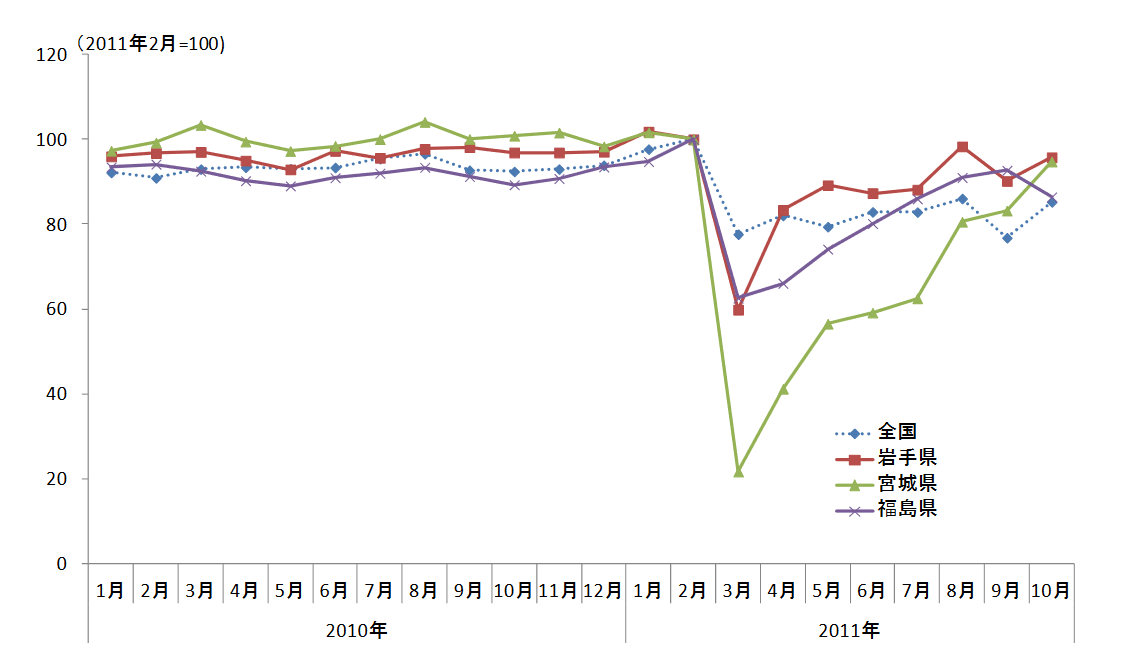 研究報告書 2011.12.01 東日本大震災復旧・復興インデックス(2011年12月更新) この記事は分で読めます シェア Tweet 総合研究開発機構 東日本大震災の被災者の皆様に心からお見舞いを申し上げます。 早期に復旧、復興できるようお祈りします。 概要 多くの犠牲者を出した東日本大震災から9ヶ月が経った。NIRAは、復旧・復興の状況の全体像を把握することを目的に、 「東日本大震災復旧・復興インデックス」を作成し、9月8日に公表した。 その後3ヶ月が経過した現下の復旧・復興の進捗をみるために、最新のデータにもとづいて、本インデックスを更新した。 「東日本大震災復旧・復興インデックス」は、大震災で津波被害を受けた地域(被災37市町村・県)を対象地域とし、 当該地域の被災後の復旧・復興状況の推移を関連する指標を合成して作成している。 全文を読む (3.9MB) Executive Summary (English) (279.2KB) INDEX エグゼクティブサマリー復旧・復興インデックスとは復旧・復興インデックスは、「生活基盤の復旧状況」を示す指数、生産や流通など「人々の活動状況」を示す指数(いずれも震災前を100とする)の2つから成り立っている。「人々の活動状況」指数は、地域の状況を表す10系列を分析したもの(バージョンI)と地方空港乗降客数・取扱貨物量も含めたもの(バージョンII)の2つのバージョンを作成した。*復旧・復興インデックスの作成方法の詳細は、本報告書の「資料7(50~51ページ)」を参照。 図表1 「生活基盤の復旧状況」指数の動き 被災3県の生活基盤(応急仮設住宅の入居率、電力・ガス・鉄道など公共インフラや瓦礫撤去率、義援金支払額、コンビニ店舗数など)に関する復旧状況は、8月から足踏み状態となっている(岩手県と宮城県で約8割、福島県で約7割)。とくに、福島県は原発事故の終息がみえず、復旧活動に制約があるため、他県に比べ指数が低い水準となっている。被災3県の復旧状況が伸び悩んでいる要因は、鉄道、瓦礫撤去率、医療施設数が十分に回復していないことにある。(クリックすると拡大します) 図表2 「人々の活動状況」指数(バージョンII) 被災3県ともに、9月時点で指数上は全国水準を上回っている。大型小売店販売額、診療報酬支払額、公共工事請負金額、有効求人倍率の上昇が影響した。しかし、これらの動きは一時的なものと考えられ、必ずしも本格的な復興を表すとはいえない。実際、民間部門の活動は回復途上にあり、鉱工業生産、大口電力使用量が伸び悩んでいる。とくに、宮城県では鉄鋼業、化学工業、水産加工業などの工場が本格的な操業再開に至っていない。 (注)10月は暫定値 図表3 市町村別にみた「生活基盤の復旧状況」 被災37市町村の復旧状況は、前回公表時に比べ、緩やかに進捗している市町村がある一方、なかには足踏み状態にある市町村もある。復旧度が高い10の自治体を左図に示した。①全体的に着実に回復している市町村(岩手県岩泉町・宮城県岩沼市・宮城県名取市・宮城県塩竈市)、②瓦礫の処理が復旧の課題となっているものの、着実に回復している市町村(宮城県七ヶ浜町・宮城県利府町・宮城県多賀城市)、③課題を抱えながらも、ガス・電力・道路などの復旧が全体としての復旧度を底上げしている市町村(宮城県仙台市・岩手県宮古市・岩手県久慈市)。 目次東日本大震災復旧・復興インデックス資料1 東日本大震災復旧・復興インデックス 採用系列の一覧表資料2 「生活基盤の復旧状況」指数―グラフおよび数値― 資料3 「人々の活動状況」指数―グラフおよび数値―資料4 市町村別にみた「生活基盤の復旧状況」資料5 「人々の活動状況」指数に含まれる個別指標―グラフおよび数値― 資料6 9月8日公表分との指数の比較資料7 東日本大震災復旧・復興インデックスの加工方法について資料8 「人々の活動状況」指数 個別指標別バックデータ 図表図表1 「生活基盤の復旧状況」指数の動き図表2 「人々の活動状況」指数(バージョンⅠ)図表3 「人々の活動状況」指数(バージョンII)図表4 復旧が比較的着実に進む市町村図表5 個別指標の動向 復旧・復興インデックス検討チームメンバー市村英彦 東京大学大学院経済学研究科・公共政策大学院教授柳川範之 東京大学大学院経済学研究科教授/NIRA理事澤田康幸 東京大学大学院経済学研究科准教授米岡大輔 東京大学大学院医学系研究科(国際保健)修士課程和川央 岩手県復興局産業再生課主査浜岡誠 岩手県復興局企画課企画専門員神田玲子 前NIRA研究調査部長斉藤徹史 NIRA研究調査部主任研究員森直子 NIRA研究調査部研究コーディネーター・主任研究員 引用を行う際には、以下を参考に出典の明記をお願いいたします。(出典)総合研究開発機構(2011)「東日本大震災復旧・復興インデックス(2011年12月更新)」 シェア Tweet 関連公表物 東日本大震災復旧・復興インデックス(2013年7月更新)-データが語る被災3県の現状と課題Ⅳ- NIRA復旧・復興インデックス検討チーム 東日本大震災復旧・復興インデックス(2013年3月更新)-データが語る被災3県の