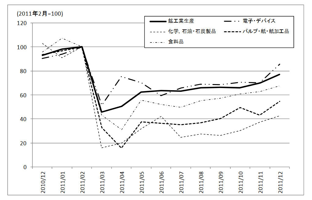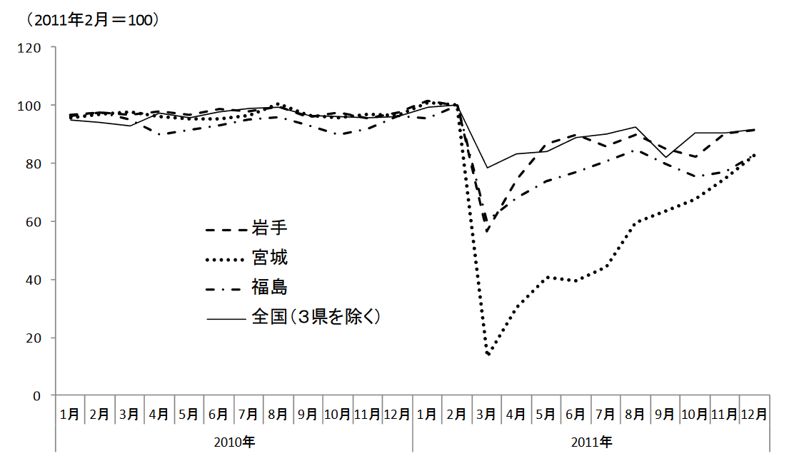 研究報告書 2012.03.01 東日本大震災復旧・復興インデックス(2012年3月更新)-データが語る被災3県の現状と課題- この記事は分で読めます シェア Tweet 総合研究開発機構 東日本大震災の被災者の皆様に心からお見舞いを申し上げます。 早期に復旧、復興できるようお祈りします。 概要 多くの犠牲者を出した東日本大震災から1年が経過する。NIRAは、復旧・ 復興の状況の全体像を把握することを目的に定期的に公表してきた「東日本大震災復旧・復興インデックス」の改訂を行った。今回は、 同インデックスを用いて被災3県の状況を掘り下げて分析するとともに、災害時の危機管理体制としてのデータの収集・ 分析に関する提言を行った。 全文を読む (6.9MB) Executive Summary (English) (321.7KB) INDEX エグゼクティブサマリー第1章 復旧・復興インデックスでみた被災3県の状況 「東日本大震災復旧・復興インデックス」は、大震災で津波被害を受けた地域(被災3県・被災37市町村)の復旧・復興の状況及びその推移を把握するために、さまざまな指標を合成して作成した次の2本の「指数」から構成される。①被災地での生活を支えるインフラの総合的な復旧度を示す「生活基盤の復旧状況」指数、及び②被災した人々やその地域の生産・消費・流通などの状況を時系列で把握する「人々の活動状況」指数。いずれも、震災直前の状況を100とした指数である。●被災3県の「生活基盤の復旧状況」指数は、昨年8~9月頃を境に数値の改善が鈍化している。特に、岩手県、宮城県と比べ、福島県では原発事故の影響で低い水準にとどまっている。瓦礫撤去や保険金支払いを更に進め、被災者が自らの生活再建に向けた取組を図っていく上での制約とならないようにしていく必要がある。復興計画の実施や土地利用計画の策定を受けて動き出す、瓦礫処理、鉄道復旧、貸出金などは、数値が低く止まったままである。 ●被災3県の「人々の活動状況」指数は、宮城県では引き続き改善が続いたが、岩手県、福島県では昨秋以降、一進一退の状態となっている。消費活動は震災前の水準まで回復しているが、産業活動の回復は不十分である。震災前の水準まで鉱工業生産が回復せず、水揚量も回復が遅れている。また、政策効果から悪化が抑えられているものとしては、倒産件数、有効求職者数がある。これらは制度の適用がされなくなった段階で悪化に向かう可能性が高い。 図表2 「人々の活動状況」指数の推移 (注)報告書 図表1-3 ●市町村別にみた「生活基盤の復旧状況」指数は、前回公表時に比べ、総じて足踏み状態。市町村の復旧度は、鉄道復旧度、瓦礫撤去率、瓦礫処理率に左右される。復旧度が高い10の自治体をみると、①全体的に着実に回復(宮城県利府町・松島町)、②瓦礫処理が課題(宮城県仙台市・名取市・塩竈市・岩沼市、岩手県岩泉町・宮古市)、③鉄道復旧と瓦礫処理が課題(岩手県洋野町・久慈市)の3つに分類できる。第2章 各県の現状と課題岩手県●生活基盤の復旧テンポは鈍化。復興バブルはみられず、沿岸部の雇用はなお厳しい。●鉱工業生産は震災前比10%減程度、漁業はなお復旧途上。漁港の損壊状況や後継者問題から廃業を選択する者も。●今後は、求職者の増大に留意しつつ、中小企業者・漁業者等への「かゆいところに手の届く」ような支援が重要。あわせて、復興計画を着実に実施できるような行政面での人的支援も重要。 図表3 岩手県の水揚量は回復途上 (注)報告書 図表2-4 宮城県●公共工事を中心に復興需要が急増。雇用状況も改善。●沿岸部では、サプライチェーンの復旧が道半ば。農林水産業の復旧スピードは遅い。●民間の生産活動の復旧・復興を後押しし、地域の雇用確保につながるものから優先的に政策を実施する必要。また、行政職員不足への対処、協力が重要。 図表4 宮城県の鉱工業生産の回復は低調 (注)※報告書 図表2-6 福島県●津波・地震被害のほか、原発事故の影響が色濃く、生活基盤の復旧は遅い。●公共工事がけん引し、消費活動や雇用は堅調だが、伸びは弱く、今後の懸念要因も。●農林水産業、観光業は壊滅的影響。原発事故収束への取組に加え、新たな企業の参入等を促進する枠組みの活用が重要。 図表5 福島県の若年者の県外「避難」者が増加 (注)報告書 図表2-7 第3章 統計・データに基づく復旧・復興政策を 災害からの復興政策を効率的で効果的なものにするためには、統計やデータを政策立案の基礎に置いて役立てることが必要である。現在の統計システムは、災害時に対応しきれないため、事前に特別のルールをつくるべきである。例えば、災害時には地方自治体が国に統計やデータを提供して情報を共有する仕組みや、業務統計の積極的な活用などが考えられる。今後は、こうした統計やデータの収集に加え、その解釈や評価も重視すべきである。 目次はじめに第1章 東日本大震災復旧・復興インデックス第2章 各県の現状と課題 第3章 統計・データに基づく復旧・復興政策をおわりに参考