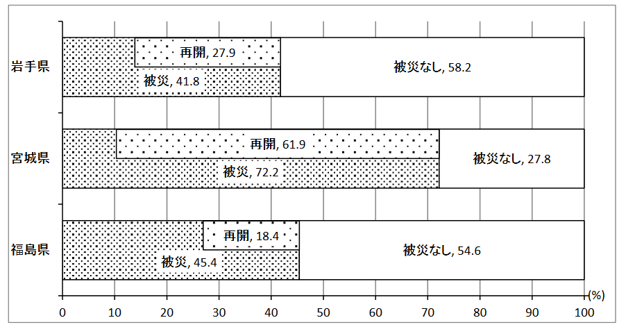 例えば、被災地の商工業者の多くが被災したが、「被災なし」と「再開」を合わせると(図表3)、岩手県では86%、宮城県では90%が事業を継続・再開している。しかし、福島県では73%にとどまる。他方で、県レベルでは新規設立法人企業数が前年比で増加し、また、被災地にも新規設立の動きがみられ、このような動きが今後も続けば、長期的な雇用が創出され、被災地の活気も高まってくるものと考えられる。