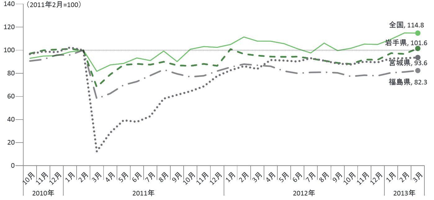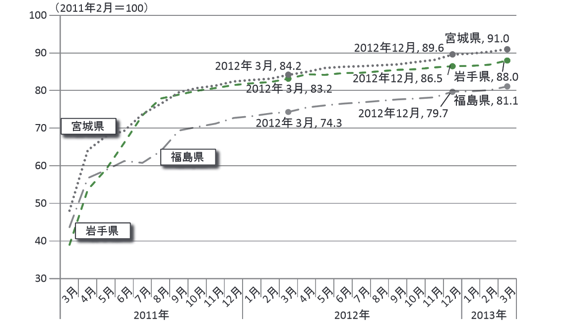 English version 研究報告書 2013.07.01 東日本大震災復旧・復興インデックス(2013年7月更新)-データが語る被災3県の現状と課題Ⅳ- この記事は分で読めます シェア Tweet 総合研究開発機構 概要 NIRA(総合研究開発機構)は、東日本大震災後の復旧・復興状況を総合的に把握するため、「東日本大震災復旧・復興インデックス」を開発した。 震災発生から2013年3月までの2年間の推移をみると、生活基盤の復旧・復興は、3県ともに緩やかに進んでいることがわかる。市町村により進み具合に差がみられるが、それは主に鉄道の復旧と瓦礫の処理の状況の違いによる。 被災地の生産・消費・流通などの活動状況については、福島県で回復の遅れがみられるなど、3県の間で進捗に違いがある。 さらに、応急仮説住宅では高齢者の「1人暮らし」が増えており、女性は子育てや就労でストレスを抱えている。被災地では、生活面での課題が山積しており、今後、状況の把握と対応が求められる。 全文を読む (3.2MB) Executive Summary (English) (164.3KB) INDEX エグゼクティブサマリー●2011年秋以降、生活基盤の復旧は緩やかに進む(図1) 生活基盤の復旧は、3県とも緩やかに進んでいるが、直近1年間をみると岩手県のテンポはやや緩慢である。瓦礫処理は3県ともに大幅に改善し、人口移動関連の指標も改善傾向にある。他方、教育・医療分野の進捗は依然として鈍い 図表1 「生活基盤の復旧状況」指数の動き (注)「生活基盤の復旧状況」指数は、鉄道復旧度や瓦礫撤去率など、被災地での生活を支えるインフラ17項目について、震災前の状況を100としたときの総合的な復旧度を示すもの。 ●市町村別では、鉄道復旧と瓦礫処理の進捗が復旧度を左右している 被災37市町村の復旧は緩やかながらも着実に進んでいる。鉄道復旧や瓦礫処理が地域の復旧の進捗に影響を与え、その目処がついた岩手県普代村の復旧度は100に達した。岩手県洋野町、宮城県利府町などでも高い復旧度となった。●2013年に入り、活動状況は上昇傾向にある(図2) 震災後、生産活動を中心に回復が進んだが、2012年春以降はほぼ横ばいで推移した。2013年に入ると、岩手県が高い伸びとなり、直近では震災前の水準を上回っている。宮城県は緩やかながら上向いているが、福島県は低い水準で推移している。 図表2 「人々の活動状況」指数の動き (注1)データ処理のため、ここでは被災3県と全国を直接比較できないことに注意を要する。(注2)「人々の活動状況」指数は、鉱工業生産指数や大型小売店販売額など、被災した人々やその地域の生産・消費・流通などの地域の活動について、被害と復旧・復興の状況を時系列で把握するもの。 ●福島県の農業・漁業・医療の復興に課題がある 岩手・宮城県では、被災した農業経営者・漁業者の多くが事業を再開したが、福島県での再開は低調のままである。医療分野では、岩手・宮城県で医師数が震災前水準に近づいたが、福島県では回復していない。●応急仮設住宅に高齢者の「1人暮らし」が増えている 応急仮設住宅には高齢者の居住割合が多く、「1人暮らし」が増加している。女性にとっては、子育て環境や就労環境が十分に回復していない。高齢者や女性のストレスが大きく、世代間、男女間の健康格差の解消が必要である。 目次第1章 東日本大震災復旧・復興インデックス第2章 インデックスの年次指数化に向けて第3章 データを活用した復旧・復興期の政策形成に向けて参考資料1 東日本大震災復旧・復興インデックス 採用指標の一覧表資料2 「生活基盤の復旧状況」指数 -グラフおよび数値-資料3 「人々の活動状況」指数 -グラフおよび数値-資料4 市町村別にみた「生活基盤の復旧状況」資料5 「人々の活動状況」指数に含まれる個別指標 ―グラフおよび数値―資料6 指数の更新状況について資料7 東日本大震災復旧・復興インデックスの加工方法について資料8 人々の活動状況指数 前月差に対する個別指標別の寄与度 図表図表1 「生活基盤の復旧状況」指数の動き図表2 「人々の活動状況」指数の動き図表3-1-1 「生活基盤の復旧状況」指数の動き図表3-1-2 指数の各構成指標の状況( 2013年 3 月と 2012 年 3 月の比較)図表3-2-1 「人々の活動状況」指数図表3-2-2 「人々の活動状況」指数を構成する個別指標の状況参考図表1 雇用のミスマッチの状況について参考図表2 震災前水準を上回った場合のデータ固定化処理を行わずに作成した「人々の活動状況」指数図表3-3 復旧が比較的着実に進む市町村図表3-4-1 農業経営体の事業再開状況図表3-4-2 漁業経営体の事業再開状況図表3-4-3 企業の事業再開状況図表3-4-4 休廃業件数は震災後に増加図表3-4-5 新規設立法人企業数が震災後に増加図表3-4-6 震災前に比べて福島県および宮城県で貸出金が増加図表3-4-7 被災地では事業所数・従業員数とも大幅減少 図表3-4-8 生徒の県外就職率が震災後に上昇(2012 年 2 月時点の状況)図表3-4-9 福島県では学校が再開しても教員が減少、岩手県および宮城県では2012年以降横ばい図表3-4-10 医師・
