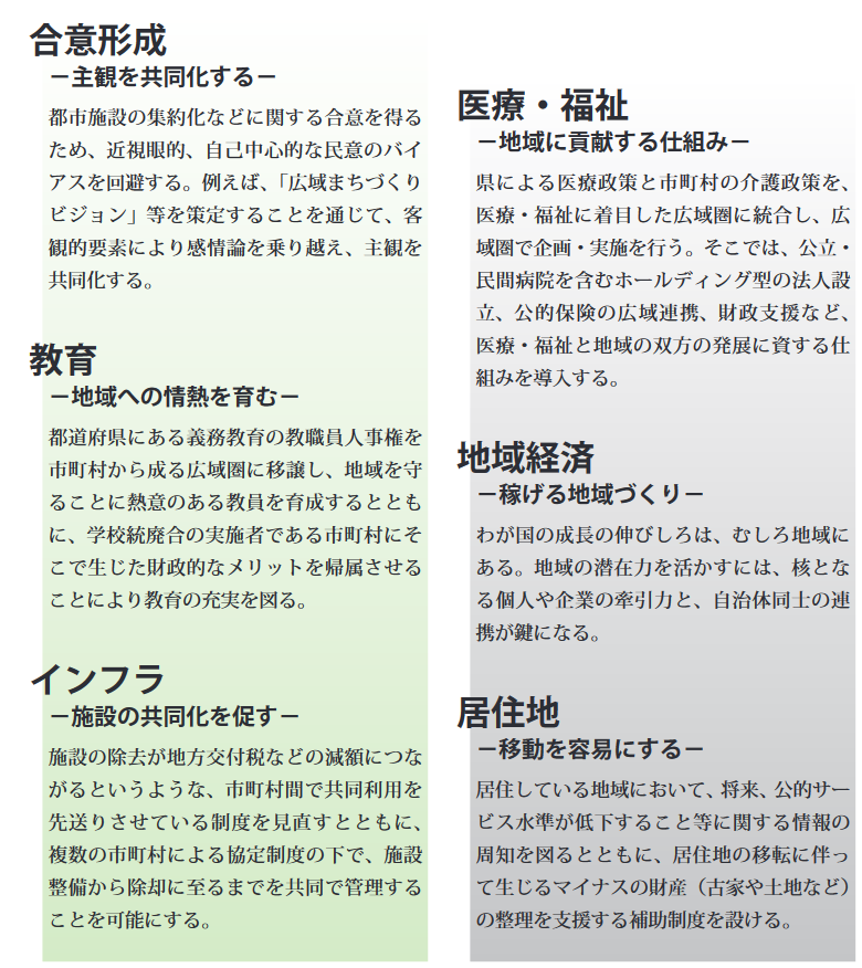 選べる広域連携に向け、「合意形成」「医療・福祉」「教育」「地域経済」「インフラ」「居住地」に関する6つの分野から実現すべき具体的な方策を提言する。