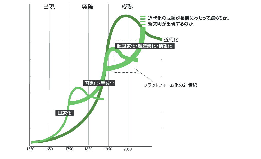 研究報告書 2015.10.01 プラットフォーム化の21世紀と新文明への兆し この記事は分で読めます シェア Tweet 公文俊平 多摩大学情報社会学研究所所長 田中辰雄 慶應義塾大学経済学部准教授 山口真一 国際大学グローバル・コミュニケーション・センター 助教/専任研究員 足羽教史 インクリメントP株式会社知的財産法務部部長 鈴木謙介 関西学院大学社会学部准教授 山内康英 多摩大学情報社会学研究所教授 概要 西欧主導によって始まった近代化を、文明のパワー(手段)を指標に捉え直すと、近代は、「国家化」、「産業化」、「情報化」の3つの波が複合的に重なり、基本的特徴を残しつつも次の新しい局面に進みながら発展を遂げてきたことがわかる。21世紀に入ると、これらの波がそれぞれグローバル化、デジタル化(第3次産業革命)、ソーシャル化(第1次情報革命)として表れ、政治、経済、社会の各領域で、プラットフォーム化と呼べる社会変化を起こしている。 例えば、支援や協力の国家間ネットワークの基盤構築、アップルやグーグルなどの企業による産業プラットフォームの誕生、そして、フェイスブックなどのソーシャル・コミュニケーション・プラットフォームの形成である。良質なプラットフォームが広く普及し、よく機能するようになれば、人々の生活の質は持続的に向上し、「平和」、「繁栄」、さらには「楽しさ」も実現することが期待できる。 今後については2つのシナリオが考えられる。1つのシナリオでは、情報化の刺激により、国家化と産業化の新しい局面である「超国家化」と「超産業化」が出現し、これらの局面と情報化の局面の3つが複合する形で進展し、われわれは成熟した近代を迎える。一方、人工知能技術の劇的な進化により、対極的なシナリオも見え始めた。それは、人工知能に代表される「超知能」の出現によって、成熟した近代は新文明へと移行するというものだ。 いずれのシナリオにおいても、「超国家化」、「超産業化」、「情報化」という以下に示す局面に着目し、それらがもたらしうる国家や産業の質的変化や社会変化にどう向き合うかが問われている。 研究成果1 総論を読む (3.9MB) 研究成果2 各論を読む(足羽教史) (806.6KB) 研究成果2 各論を読む(鈴木謙介) (582.1KB) 研究成果2 各論を読む(山内康英) (1.1MB) INDEX エグゼクティブサマリー●「超国家化」-超国家的な統治機構の必要性 21世紀にわれわれが直面する環境破壊、悪性のウイルスの蔓延やサイバーテロなどの地球規模の課題は、もはや一国では対処できない。また、経済政策や経済制度についても、グローバルな共働の必要が自覚され始めている。そのため、国家を超えた超国家的な統治機構の必要性が次第に高まるだろう。国連やEUなどは、まだ萌芽的なものにすぎないが、「超国家化」の出現を示唆している国際的な動きだと見ることができる。●「超産業化」-加速する経済の不可視化多くのビジネスの過程が電子化・機械化され、不可視になっている。この動きは、今後一層加速を続け、経済の成長と繁栄を持続させる一方、人間を「無業」にする。これは、知能を持った機械がいずれ人間を置き換える過程の進展とも捉えられる。ただし、その進展過程は、知能を持った機械が実現する生産性の極端な高さとその増大の加速的な持続によって特徴づけられるという意味では、これまでの産業化とは質的に異なり、「超産業化」と呼ぶことがふさわしい。●「情報化」-挑戦と事前適応という 2 面性 情報化により「超国家化」と「超産業化」が出現し、その結果、国家を超えた統治機構と無職が常態となる状況が生まれる。これは、国民としてのアイデンティティと勤労の価値を消滅させる危険性をもたらす。しかし同時に、情報化はネットワーク化された仲間たちと「共働・通有」しながら、その特徴である「賢さ」や「楽しさ」の追求に生きがいを見いだすという新しい社会環境を生み出している。そして、この社会環境は、「人間化した機械」と人間が共生してくための前提条件ともなっており、情報化の「事前適応」という特性を表している。 ●近代化の成熟局面における課題 「超国家化」、「超産業化」、そして「情報化」が出現する近代化の成熟局面において、われわれは、情報化が間接的に引き起こす、国民としてのアイデンティティや勤労の価値の消滅の危険という挑戦に適切に対処することが求められる。 図表1 近代化の各展開過程における文明のパワー(手段)をS字波で表す 目次研究成果1総論 第1章 これまでの私の近代化論 第2章 21世紀の位置づけ 第3章 長期ビジョン 参考 大局面および小局面の特徴比較の補足補論 産業化の変遷と課題研究成果2各論 デジタル技術の飛躍的進化により変貌する近未来 (足羽教史) 情報化Ⅰ=ソーシャル化 (鈴木謙介) 国家化Ⅱとナショナリズム (山内康英) 図表図表Ⅰ-1-1 近代化の3局面イメージ図表Ⅰ-1-2 近代化の3つの大局面図表Ⅰ-1-3 “nation”の出現頻度図表Ⅰ-1-4 “sovereign state