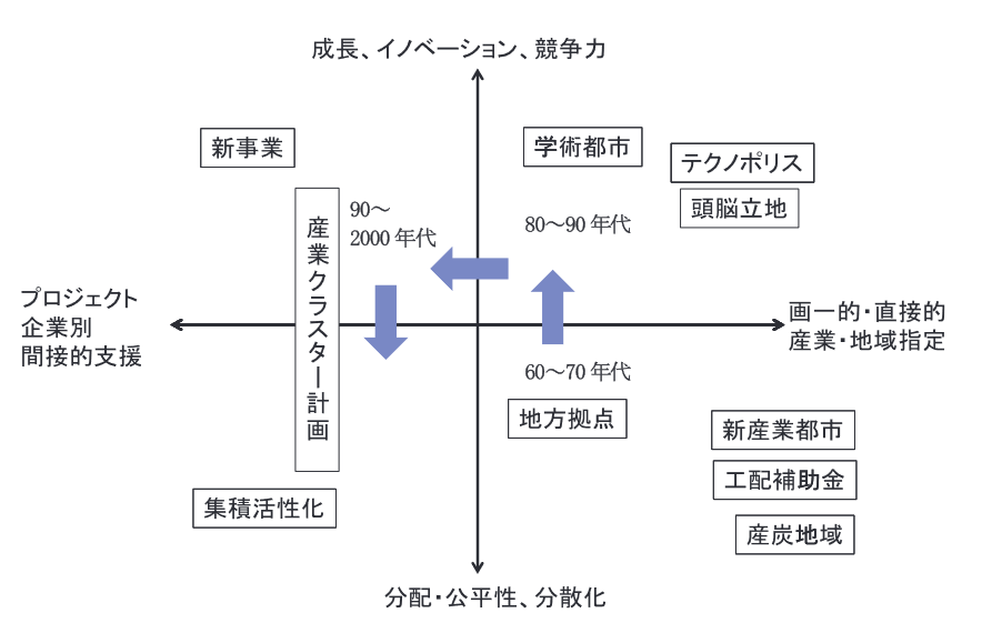 研究報告書 2016.11.01 コンパクトな産業集積へ柔軟なネットワークで支える この記事は分で読めます シェア Tweet 岡崎哲二 客員研究員/東京大学大学院経済学研究科教授 大久保敏弘 客員研究員/慶應義塾大学経済学部教授 齊藤有希子 客員研究員/独立行政法人経済産業研究所上席研究員 中島賢太郎 客員研究員/東北大学大学院経済学研究科准教授 原田信行 客員研究員/筑波大学システム情報系准教授 概要 戦後、テクノポリス政策や頭脳立地政策など地域産業政策が実施されてきたが、地域発のイノベーションにけん引される持続的な経済成長は実現できていない。従来の地域産業政策で現状を打開することは困難であり、発想の転換を迫られている。本研究会では地域の独自性を最大限に生かすコンパクトな産業集積を形成することを提案する。コンパクトでも、密度の高いネットワークを都市部との間で形成することで柔軟な構造になり、高質な産業集積が可能となる。 全文を読む (13.4MB) Executive Summary (English) (226.7KB) INDEX エグゼクティブサマリー● 新たな課題との対峙 90年代以降の日本経済は、大都市圏の成長を原動力として成長してきた80年代とは様相が異なる。大都市圏での成長率の低迷が続く一方で、低迷の度合いが相対的に抑えられている大都市圏以外の地域を活性化させることにより日本経済の成長を実現するという新しい課題に対峙している。● 生産性の低下を招いた補助金政策 これまで実施してきた地域産業政策は成功しているとは言い難い。過去の産業振興政策では製造業を中心に企業や雇用はわずかに増えたが、生産性は低下した。直接的な補助金政策が、生産性の低い企業の集積を招いてしまったためである。● 既存インフラを高度に利用する イノベーションを実現するにはface-to-faceのコミュニケーションが必須である。地理的に距離があると知的な交流が阻害され、共同研究の弊害となる。しかし、こうした弊害は、新幹線網やリニア新幹線などの既存ないし既定の交通インフラを高度に利用すれば縮小し、イノベーションにつながる共同研究なども促進させることができる。● 高質でコンパクトな産業集積を 全国画一的な産業集積ではなく、少数でも生産性の高い企業による独自性のある集積形成を、地方政府が主導しなければならない。今後は、サービス分野を含む幅広い産業を取り込み、地域の特性を生かした高質でコンパクトな集積を形成すべきである。● ネットワークの形成 そうした少数企業によるクラスターでは、集積間や特定地域を超えたネットワークが欠かせない。共同研究や取引関係を密にし、外部経済効果を高めることが高質な産業集積を導くことになる。特に中小の企業が他企業や海外とつながることは難しいことから、地域金融機関、商工会議所、地方自治体、政府等の人的資源やノウハウを活用したネットワーク形成が肝要である。 各地には潜在的に起業しようとする機会も残っており、日本経済の成長源は地域にある。多様性に富んだ地域産業集積の新たな萌芽に期待する。 補助金政策チャートー産業政策の変遷ー 目次総論 コンパクトな産業集積へ-柔軟なネットワークで支える-第1章 イノベーションの経済空間-集積の観点からのイノベーション促進政策-第2章 産業集積の高度化による経済活性化 2-1 高質でコンパクトな産業集積の形成 2-2 産業クラスター計画の評価第3章 地域別の潜在的起業規模参考 産業立地からみる3つのモデル研究体制(五十音順)(研究委員会)岡崎哲二 客員研究員/東京大学大学院経済学研究科教授大久保敏弘 客員研究員/慶應義塾大学経済学部教授齊藤有希子 客員研究員/独立行政法人経済産業研究所上席研究員中島賢太郎 客員研究員/東北大学大学院経済学研究科准教授原田信行 客員研究員/筑波大学システム情報系准教授(NIRA総合研究開発機構)神田玲子 理事・研究調査部長豊田奈穂 研究調査部主任研究員森直子 研究調査部研究コーディネーター 引用を行う際には、以下を参考に出典の明記をお願いいたします。(出典)岡崎哲二・大久保敏弘・齊藤有希子・中島賢太郎・原田信行(2016)「コンパクトな産業集積へー柔軟なネットワークで支えるー」NIRA総合研究開発機構 シェア Tweet © 公益財団法人 NIRA 総合研究開発機構※本誌に関するご感想・ご意見をお寄せください。E-mail:info@nira.or.jp 研究の成果一覧へ