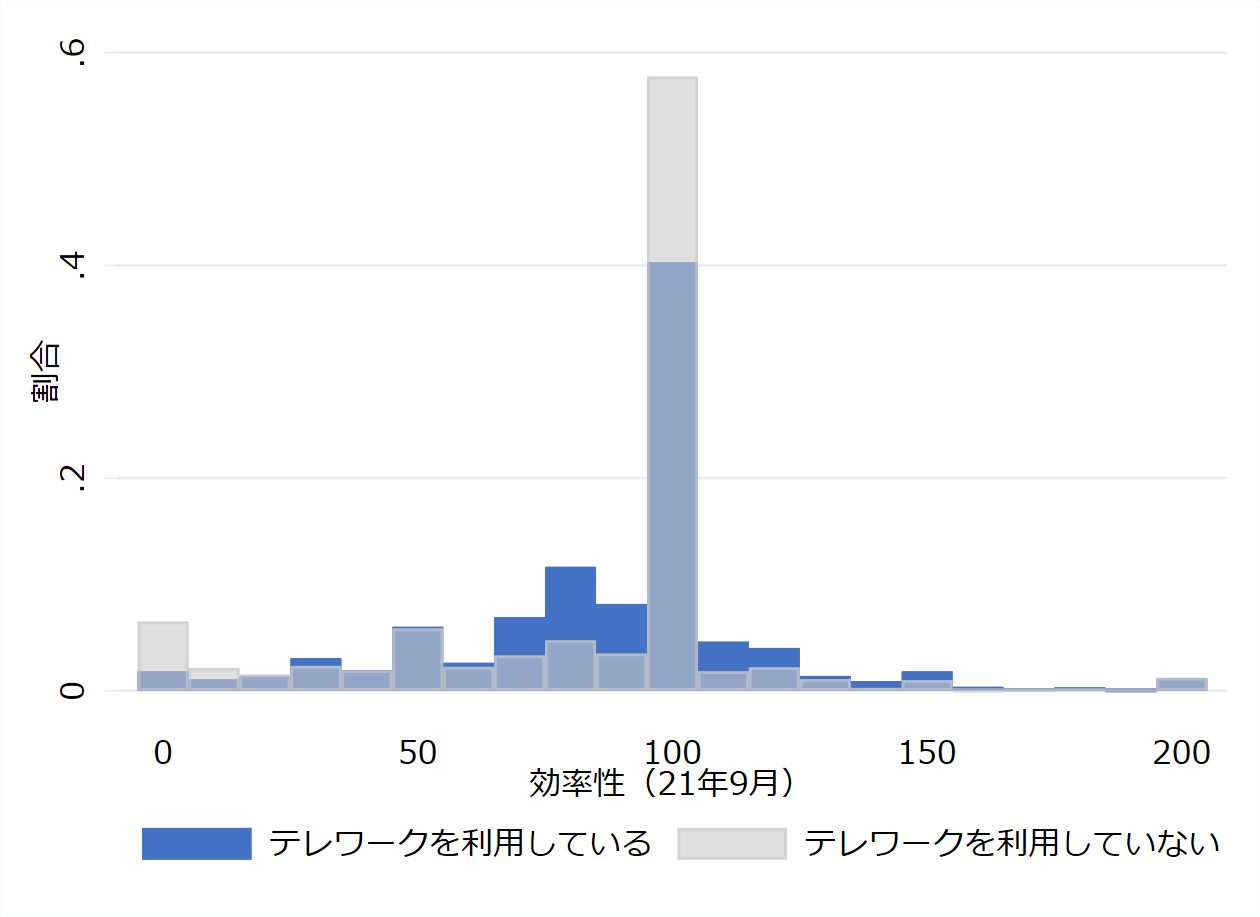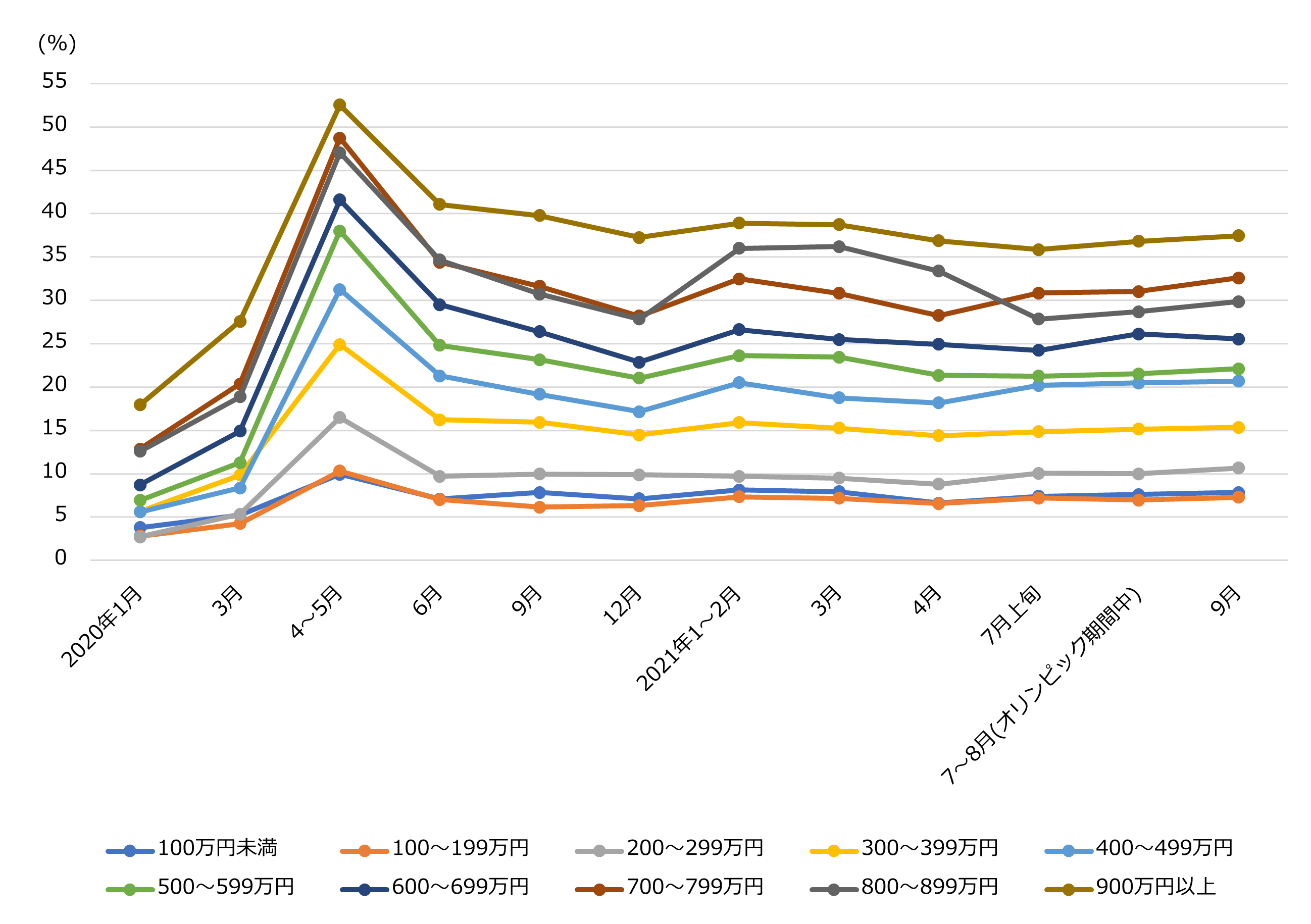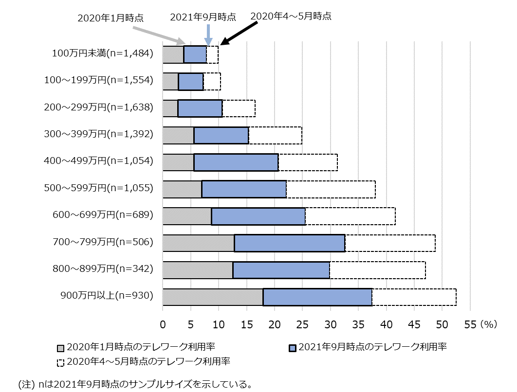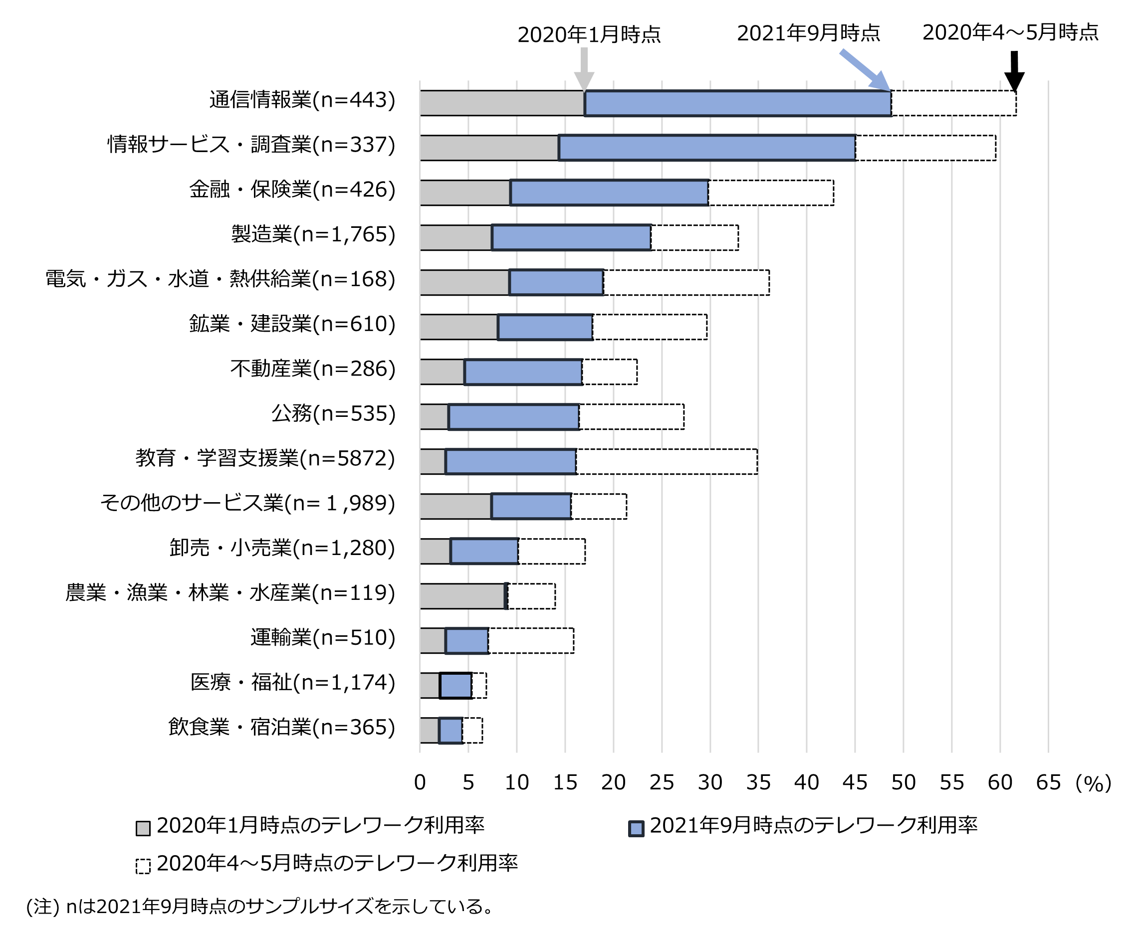 研究報告書 2021.10.07 第5回テレワークに関する就業者実態調査(速報) この記事は分で読めます シェア Tweet 大久保敏弘 慶應義塾大学経済学部教授 NIRA総合研究開発機構 最新の調査結果はこちら➡「第10回テレワーク調査」 概要 慶應義塾大学経済学部大久保敏弘研究室、(公財)NIRA総合研究開発機構では、「第5回テレワーク(注1)に関する就業者実態調査(注2)」を実施した。本調査は、新型コロナウイルスの感染拡大による、全国の就業者の働き方、生活、意識の変化や、業務への影響等の実態を捉えることを目的に実施したものである。調査は2021年9月4日(土)~22日(水)にかけて行われた。回収数は10,644件であり、うち過去の同調査からの継続回答は8,455件である。速報結果は以下のとおり。詳細版は2021年12月を目途に公表する予定である。 PDFで読む (2.5MB) INDEX 1. テレワーク利用率 2. 通常の職場での勤務とテレワークによる勤務の頻度 3. 仕事の効率の変化 4. ICTツールの活用状況 5. メンタルヘルス 6. 新型コロナウイルス感染 7. ワクチン接種 8. 新型コロナウイルスの感染や影響の予測 9. グリーン・ジョブ 調査概要 ポイント●2021年9月1週目時点の全国の就業者のテレワーク利用率は17%(東京圏28%)となった。2020年6月以降は、ほぼ同水準で推移している。2回目以降の緊急事態宣言発令中やオリンピック開催中も、テレワーク利用率に大きな変化はない。しかし、テレワーク利用頻度は緩やかに増加してきており、テレワークと出社を組み合わせた働き方のバランスが、全体としては、テレワークの比重が高い方向にシフトしている。●テレワークで仕事の効率が低下する要因として、仕事の特性上テレワークが困難であること、コミュニケーションの悪化、自宅環境に課題があることを回答する人の割合が高い。一方、テレワークで仕事の効率が上昇する要因として、疲労の軽減、仕事の特性上テレワークが向いていること、自宅環境の良さを回答する人の割合が高い。●ICTツールの活用状況は、2021年9月時点で、テレワーク利用者は85%である一方、テレワークを利用していない人は26%と、テレワーク利用者のICT利用率が顕著に高い。時系列の変化として、オフィス勤務者のICTツールの利用が広がっており、全体のICT利用率が徐々に上昇している。●新型コロナウイルスの感染経験のある人は、感染経験のない人よりも、メンタルヘルスが悪く、また、経済的な困窮への不安を感じている。また、ワクチンの接種状況に性別による差はないが、年齢が若いほど接種完了率が低い傾向にある。「接種しない」と回答した人の割合は年齢が若いほど大きく、10~20代では23%にのぼる。●自身の仕事がグリーン・ジョブに該当する人(一部が該当する人も含む)の割合は、就業者全体の31%であった。特に、環境問題への意識の向上や、リサイクルなどの活動が比較的行われている。グリーン・ジョブに携わる人が、仕事の中でグリーン・ジョブに費やす時間の割合は、10%と回答した人が最も多かった。 図表図表1 全国および東京圏のテレワーク利用率図表1-1 居住都道府県別でみたテレワーク利用率-新型コロナウイルス感染拡大前、第1回緊急事態宣言時、直近時点の比較-図表1-2-1 産業別でみたテレワーク利用率図表1-2-2 産業別(抜粋)でみたテレワーク利用率の推移図表1-3-1 所得階層別でみたテレワーク利用率図表1-3-2 所得階層別でみたテレワーク利用率の推移図表2-1 通常の職場で勤務している人の出社頻度図表2-2 テレワーク利用者の利用頻度図表3a 仕事の効率(2021年9月、テレワーク利用別)図表3b テレワーク利用者の仕事の効率の変化図表3-1 テレワークで仕事の効率が低下する要因図表3-2 テレワークで仕事の効率が上昇する要因図表4-1 ICTツールの活用状況(テレワーク利用別)図表4-2 ICTツールの活用状況図表4-3 目的別のICTツール活用状況(テレワーク利用別)図表4-4 個別ICTツールの活用状況(テレワーク利用別)図表5-1 2019年度国民生活基礎調査のK6の合計点の分布(12歳以上)図表5-2 2019年度国民生活基礎調査のK6の合計点の分布 有業人員(15歳以上)図表5-3 K6の分布図表5-4 性別、年齢階層別でみたK6の分布(2021年9月)図表6-1 新型コロナウイルスの感染経験とK6の分布図表6-2 新型コロナウイルスの感染経験と経済的な困窮への不安図表7 新型コロナワクチンの接種状況(2021年9月時点)図表8 新型コロナウイルスの感染や影響の予測図表9-1 グリーン・ジョブに携わっている人の割合図表9-2 グリーン・ジョブに携わっている人の割合(分類別)図表9-3 グリーン・ジョブに携わっている人の割合(産業別)図表9-4 グリーン・ジョブに費やす時間の割合(グリーンジョブに携わっている人のみ) 調査概要調査方法:インターネット調査(スクリーニング調査・本調査)。回収目標数を10,000サンプルとして、過去の調査と同様のスクリーニング調査、割付を行ったうえで、配信し、回収した。(注3)調査機関:株式会社日経リサーチ調査対象者:調査会社に登録しているインターネット調査登録モニター調査対