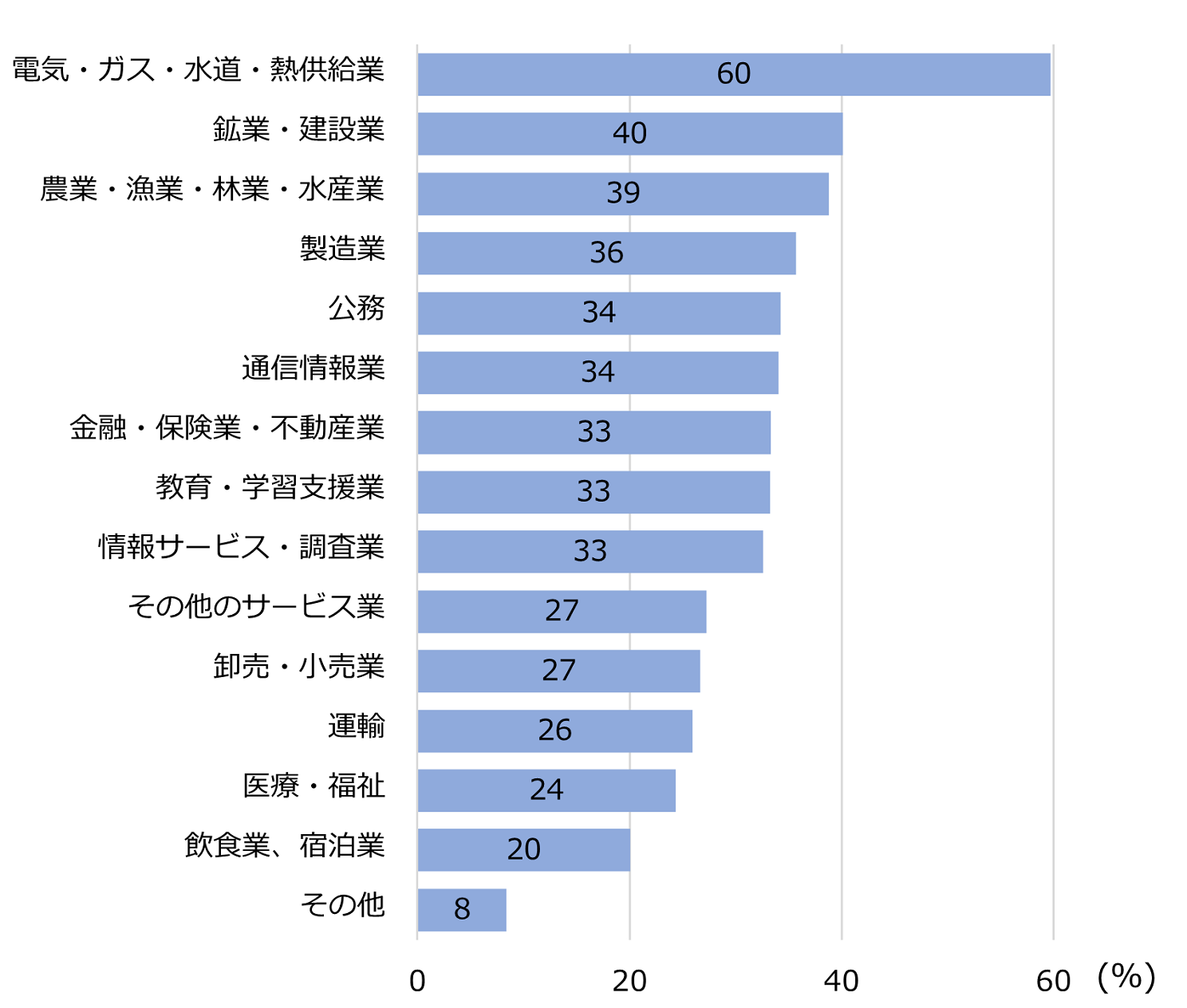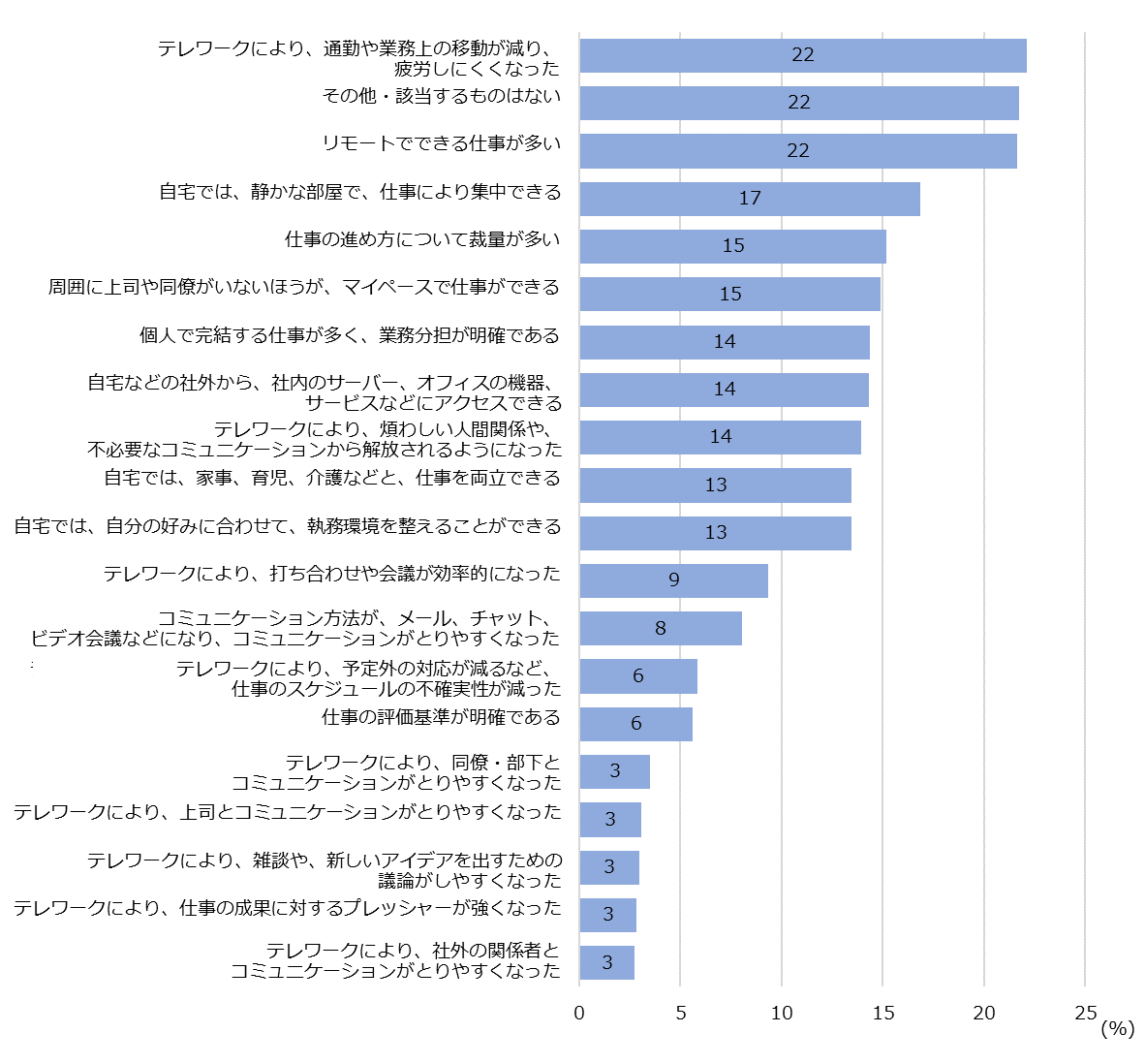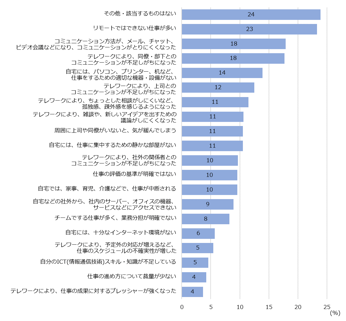 研究報告書 2021.10.07 第5回テレワークに関する就業者実態調査(速報) この記事は分で読めます シェア Tweet 大久保敏弘 慶應義塾大学経済学部教授 NIRA総合研究開発機構 最新の調査結果はこちら➡「第10回テレワーク調査」 概要 慶應義塾大学経済学部大久保敏弘研究室、(公財)NIRA総合研究開発機構では、「第5回テレワーク(注1)に関する就業者実態調査(注2)」を実施した。本調査は、新型コロナウイルスの感染拡大による、全国の就業者の働き方、生活、意識の変化や、業務への影響等の実態を捉えることを目的に実施したものである。調査は2021年9月4日(土)~22日(水)にかけて行われた。回収数は10,644件であり、うち過去の同調査からの継続回答は8,455件である。速報結果は以下のとおり。詳細版は2021年12月を目途に公表する予定である。 PDFで読む (2.5MB) INDEX 1. テレワーク利用率 2. 通常の職場での勤務とテレワークによる勤務の頻度 3. 仕事の効率の変化 4. ICTツールの活用状況 5. メンタルヘルス 6. 新型コロナウイルス感染 7. ワクチン接種 8. 新型コロナウイルスの感染や影響の予測 9. グリーン・ジョブ 調査概要 ポイント●2021年9月1週目時点の全国の就業者のテレワーク利用率は17%(東京圏28%)となった。2020年6月以降は、ほぼ同水準で推移している。2回目以降の緊急事態宣言発令中やオリンピック開催中も、テレワーク利用率に大きな変化はない。しかし、テレワーク利用頻度は緩やかに増加してきており、テレワークと出社を組み合わせた働き方のバランスが、全体としては、テレワークの比重が高い方向にシフトしている。●テレワークで仕事の効率が低下する要因として、仕事の特性上テレワークが困難であること、コミュニケーションの悪化、自宅環境に課題があることを回答する人の割合が高い。一方、テレワークで仕事の効率が上昇する要因として、疲労の軽減、仕事の特性上テレワークが向いていること、自宅環境の良さを回答する人の割合が高い。●ICTツールの活用状況は、2021年9月時点で、テレワーク利用者は85%である一方、テレワークを利用していない人は26%と、テレワーク利用者のICT利用率が顕著に高い。時系列の変化として、オフィス勤務者のICTツールの利用が広がっており、全体のICT利用率が徐々に上昇している。●新型コロナウイルスの感染経験のある人は、感染経験のない人よりも、メンタルヘルスが悪く、また、経済的な困窮への不安を感じている。また、ワクチンの接種状況に性別による差はないが、年齢が若いほど接種完了率が低い傾向にある。「接種しない」と回答した人の割合は年齢が若いほど大きく、10~20代では23%にのぼる。●自身の仕事がグリーン・ジョブに該当する人(一部が該当する人も含む)の割合は、就業者全体の31%であった。特に、環境問題への意識の向上や、リサイクルなどの活動が比較的行われている。グリーン・ジョブに携わる人が、仕事の中でグリーン・ジョブに費やす時間の割合は、10%と回答した人が最も多かった。 図表図表1 全国および東京圏のテレワーク利用率図表1-1 居住都道府県別でみたテレワーク利用率-新型コロナウイルス感染拡大前、第1回緊急事態宣言時、直近時点の比較-図表1-2-1 産業別でみたテレワーク利用率図表1-2-2 産業別(抜粋)でみたテレワーク利用率の推移図表1-3-1 所得階層別でみたテレワーク利用率図表1-3-2 所得階層別でみたテレワーク利用率の推移図表2-1 通常の職場で勤務している人の出社頻度図表2-2 テレワーク利用者の利用頻度図表3a 仕事の効率(2021年9月、テレワーク利用別)図表3b テレワーク利用者の仕事の効率の変化図表3-1 テレワークで仕事の効率が低下する要因図表3-2 テレワークで仕事の効率が上昇する要因図表4-1 ICTツールの活用状況(テレワーク利用別)図表4-2 ICTツールの活用状況図表4-3 目的別のICTツール活用状況(テレワーク利用別)図表4-4 個別ICTツールの活用状況(テレワーク利用別)図表5-1 2019年度国民生活基礎調査のK6の合計点の分布(12歳以上)図表5-2 2019年度国民生活基礎調査のK6の合計点の分布 有業人員(15歳以上)図表5-3 K6の分布図表5-4 性別、年齢階層別でみたK6の分布(2021年9月)図表6-1 新型コロナウイルスの感染経験とK6の分布図表6-2 新型コロナウイルスの感染経験と経済的な困窮への不安図表7 新型コロナワクチンの接種状況(2021年9月時点)図表8 新型コロナウイルスの感染や影響の予測図表9-1 グリーン・ジョブに携わっている人の割合図表9-2 グリーン・ジョブに携わっている人の割合(分類別)図表9-3 グリーン・ジョブに携わっている人の割合(産業別)図表9-4 グリーン・ジョブに費やす時間の割合(グリーンジョブに携わっている人のみ) 調査概要調査方法:インターネット調査(スクリーニング調査・本調査)。回収目標数を10,000サンプルとして、過去の調査と同様のスクリーニング調査、割付を行ったうえで、配信し、回収した。(注3)調査機関:株式会社日経リサーチ調査対象者:調査会社に登録しているインターネット調査登録モニター調査対