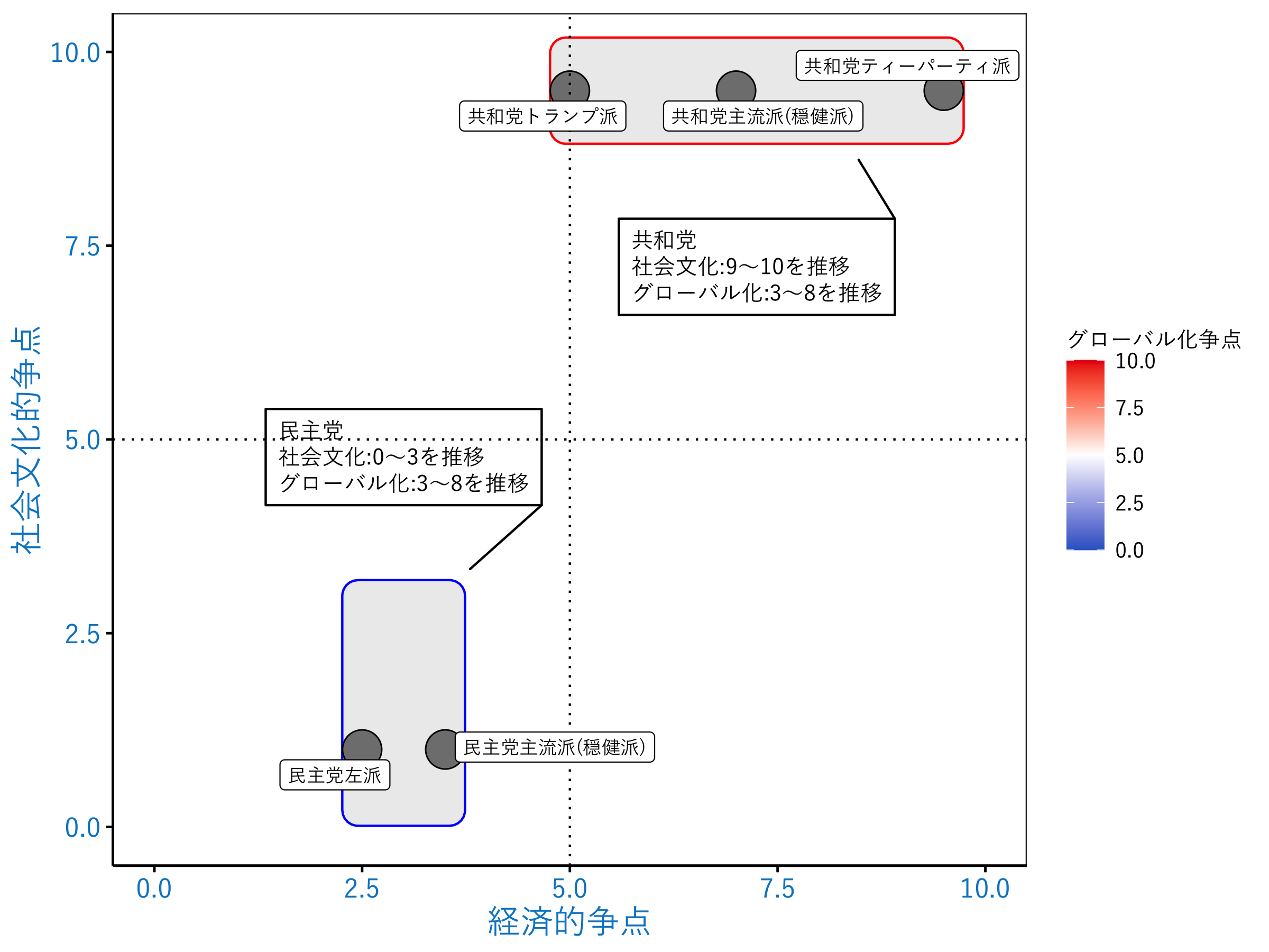English version 研究報告書 2021.08.27 経済・社会文化・グローバリゼーションー第8章 アメリカー この記事は分で読めます シェア Tweet 西山隆行 成蹊大学法学部教授 概要 アメリカ民主党には、中道左派の穏健派と社会民主主義に近い左派が、また共和党には、中道右派の主流派、ティーパーティ派、さらに混乱要因のトランプ派が存在しており、二大政党内で多様な意見が併存している。グローバリズムに関しては、共和党がグローバリズムに積極的な立場である一方、民主党は消極的な立場と見られてきた。しかし、オバマ政権以降、共和党が自由貿易に懐疑的であり、民主党が自由貿易を推進する傾向がある。また、クリントン政権以降、二大政党は政権時にグローバル化を推進し、非政権時に反グローバル化な姿勢を示す傾向が強くなっていたが、近年は二大政党ともにグローバル化に懐疑的な動きが強くなった。 グローバル化を推進してきたアメリカだが、グローバル化の進展は、国内の労働組合の弱体化を生んだ。加えて、民主党がグローバル化を推進したことは、労働者の政治的な声を奪う形となった。こうした変化の中で、共和党トランプ派は、製造業従事者が多いラストベルトの地域で、白人労働者層の失業が増大しているのは、移民・不法移民やグローバルエリートによるものだと主張し、有権者からの支持を集めた。ただし、共和党トランプ派もグローバル化を前提に、自国に有利な状況を作ろうとしていたため、支持者の反グローバル化を強めただけに終わった。 2020年大統領選挙で、民主党は、大統領選に加えて、連邦議会選挙で上下院ともに実質的に勝利し、大統領と連邦議会の上下両院を民主党が押さえる「トリプル・ブルー」となった。一方で、新型コロナ問題は、二大政党の社会保障の拡充を求める立場の存在感を高めた。民主党左派と共和党トランプ派は、反グローバリズムで共通するが意見の大きな隔たりがある。グリーンニューディール政策で連携する可能性はあるが、トリプル・ブルーの状態では、大きなムーブメントとなるには可能性は非常に低い。経済・社会文化・グローバリゼーション・総論 2020年の各国政党政治・第1章 フランス ・第2章 イギリス ・第3章 ドイツ ・第4章 イタリア ・第5章 オランダ ・第6章 スペイン ・第7章 北欧諸国 ・第8章 アメリカ ・第9章 韓国 PDFで読む (1.3MB) General Introduction & Country Summaries (623.1KB) INDEX 第8章 アメリカ 政党の政策的な位置づけの困難さ 経済争点では各党内に幅 社会文化的争点での分極化 政権時にグローバル化を推進し、非政権時に反グローバルに転じる 争点が経済から、人権問題、党派対立への変化 「トリプル・ブルー」 民主・共和両党に反グローバリズム勢力 貿易政策への影響 二大政党におけるポピュリズム 新型コロナ問題の余波 民主党左派とトランプ派の合意? 第8章 アメリカ 政党の政策的な位置づけの困難さ アメリカの政党は、ヨーロッパの政党とは性格が大きく異なり、政党の政策位置のスコア評価に困難な面がある。 ヨーロッパ諸国は、比例代表制を採用する国が多く、多党制となる可能性が高い。そのため、環境問題や反グローバリズムなどの単一争点に基づいて政党を組織することが容易である。他方、アメリカでは、小選挙区制を採用していることに加え、全米規模で展開される大統領選挙が他の選挙にも影響を及ぼし、有力政党が民主党と共和党の二大政党に集約されている。その結果、単一争点を掲げる人々は政党ではなく利益集団を組織することが一般的になっている。利益集団は、二大政党への働きかけを通じて、政治に影響を及ぼす。そのため、反グローバル化を掲げる政党が出てくることはあっても、あくまでも地方レベルでの活動にとどまり、全米レベルで有力な政党になるとは考えにくい。 また、主要政党の政策位置を考える際に、政党内のどの立場を想定して回答するのかという問題が、アメリカの政党にはある。CHES調査では党首の政策位置を想定しているように見える。しかし、アメリカの政党には党首が存在せず、民主党や共和党という名前を冠していても、党内での政治家の政策や政策位置の幅が非常に大きい。これには、党執行部が候補者に対する公認権を持っておらず、選挙区単位で予備選挙か党員集会を実施して候補者を選出することと関係している。そのため、党主流派が忌避している人物、例えば2016年大統領選挙におけるドナルド・トランプのような人が候補者に選ばれ、さらには大統領になってしまうということがある。 このように、アメリカの政党では、個々の選挙区が独自のメカニズムで候補者を選出し、政党規律も弱く、さらに大統領と上院や下院の院内総務の間でも政策位置が全く違うこともあり得るため、民主党や共和党を一括して語ることのが、非常に難しい。 経済争点では各党内に幅 以上を断った上で、まずは経済的争点における主要政党の政策位置を考える。民主党が左