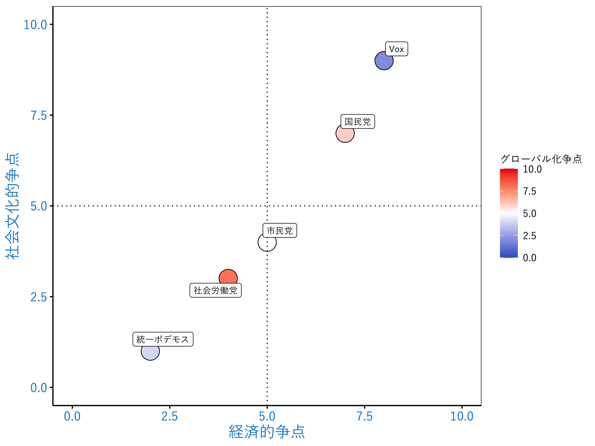 English version 研究報告書 2021.08.27 経済・社会文化・グローバリゼーションー第6章 スペインー この記事は分で読めます シェア Tweet 武藤祥 関西学院大学法学部教授 概要 スペインでは、民主化以降、社会労働党と国民党の二大政党が政権交代を交互に繰り返してきた。近年は、グローバリズムを積極的に主張する既成政党に対し、統一ポデモスやVox、市民党などの反グローバリズムを主張する新興政党が出てきた。直近の選挙では、二大政党は支持を維持し、新興政党では市民党が大惨敗したが、Voxは第3党となった。新興政党の中でも、統一ポデモスは、2008年金融危機を契機とし、若年層や大都市部の住民、極左層から支持を受け、勢力を拡大させた。 統一ポデモスが他国の左派ポピュリスト政党と異なる点は、反グローバル化を志向しながらEUなどの国際協調を積極的に評価していることである。同じく新興政党で、右派ポピュリスト政党に近いとされるVoxは、移民排斥からカタルーニャ独立反対に主張を変えたことで、支持を拡大させた。 2019年11月総選挙の結果、統一ポデモスと社会労働党の連立政権が成立した。2015年以降に総選挙を4回も行った政治の不安定化に対して、連立政権として一定の解決の契機を示したが、直後に新型コロナ問題が起きたため、その評価は難しい。スペインでは、反グローバリズム政党は存在するものの、他の南欧諸国と同様に、全体としてEUなどの国際協調の枠組みを否定する、中長期的に反グローバリズムを主張する政党は存在しない。反緊縮を掲げるが、反グローバリズムの主張にはつながっていない。加えて、統一ポデモスやVoxは、反グローバリズム政党ではあるが、ポピュリスト政党と評価できない側面も持つ。経済・社会文化・グローバリゼーション・総論 2020年の各国政党政治・第1章 フランス ・第2章 イギリス ・第3章 ドイツ ・第4章 イタリア ・第5章 オランダ ・第6章 スペイン ・第7章 北欧諸国 ・第8章 アメリカ ・第9章 韓国 PDFで読む (1.0MB) General Introduction & Country Summaries (623.1KB) INDEX 第6章 スペイン 左右軸が明確な5つの政党の政策スタンス 経済的スタンスと社会文化的スタンスの相関は伝統的 カトリック国の宗教的争点と根強い地域主義 直近の選挙で票を伸ばしたVox PSOEとUPによる民主化以降、初の連立内閣 金融危機を契機に生まれたポデモス 若年層、大都市部、極左からの支持を得る カタルーニャ独立に反対して票を獲得したVox 福祉排外主義の傾向がみられるVox 反グローバル政党の政権参加 反緊縮の主張は、反グローバルや反EUにつながらず 反緊縮でも、EUを支持 反グローバル政党はポピュリズム政党か 第6章 スペイン 左右軸が明確な5つの政党の政策スタンス スペインにおける直近の選挙で5%以上の得票を得ている政党は、概ね5政党である。そのうち、社会労働党(PSOE)と国民党(PP)が、民主化以降政権交代を交互に繰り返してきた二大政党であり、主流の既成政党と見なすことができる。政策的な位置づけとしては、社会労働党が中道左派、国民党が中道右派であるが、近年は国民党がやや右寄りの傾向を強めている。 その他に新興政党がある。これらの政党をポピュリズム政党と呼ぶべきかについては議論が分かれる。1つ目は、統一ポデモス(UP)である。ポデモスと統一左派などの選挙連合として(後述)、現在「統一ポデモス」と呼ばれている。2つ目は、市民党(C’s)である。この党の政治的スタンスは見えにくい。3つ目は、Vox(ボックス)である。ここ2~3年、非常にセンセーショナルな形で登場し、極右として評価されている。 加えて、スペインの政治状況で忘れてはならないのが地域主義政党、特にカタルーニャ問題やバスク問題の中心的な役割を担う政党である。しかし、全国レベルにおいては、これらの政党の得票率は5%未満にとどまる。 経済的スタンスと社会文化的スタンスの相関は伝統的 CHES調査について述べる。まず、経済的な争点に関しては、中道左派であるPSOEとUPの評価は、概ねCHES調査の通りで良い。しかし、C’sは、もとより明確な政治的なスタンスを取らない政党であるため、真ん中の5とした。右派寄りの2つの政党であるPPとVoxについては、民営化や減税などの小さな政府路線の政策を強調しているものの、福祉を削減するのではなく、経済的弱者である失業者への保障や、医療分野では予防接種の無料化を主張するなど、福祉政策への関心も強いため、CHES調査よりも1ポイントずつ中道寄りに位置付けた。 社会文化的争点に関しては、CHES調査と大きな差はない。ただし、PPに関しては、たしかに右寄りの主張が多いものの、公約では、例えば、労働市場における男女の平等も強調していることから、Voxよりは中道寄りに評価した。 経済的な左右と、社会文化的な左右は、概ね正の相関をなしており、伝統的な左右軸が形成されていることがわかる。 グローバリゼーションへの各政党の立場に関しては、新興政党のVoxとUPが反グローバリゼーションを主張する
